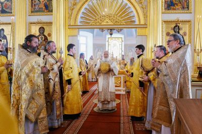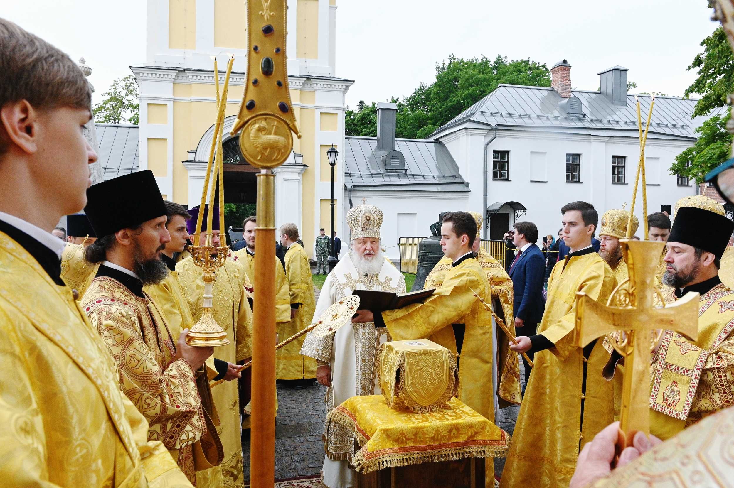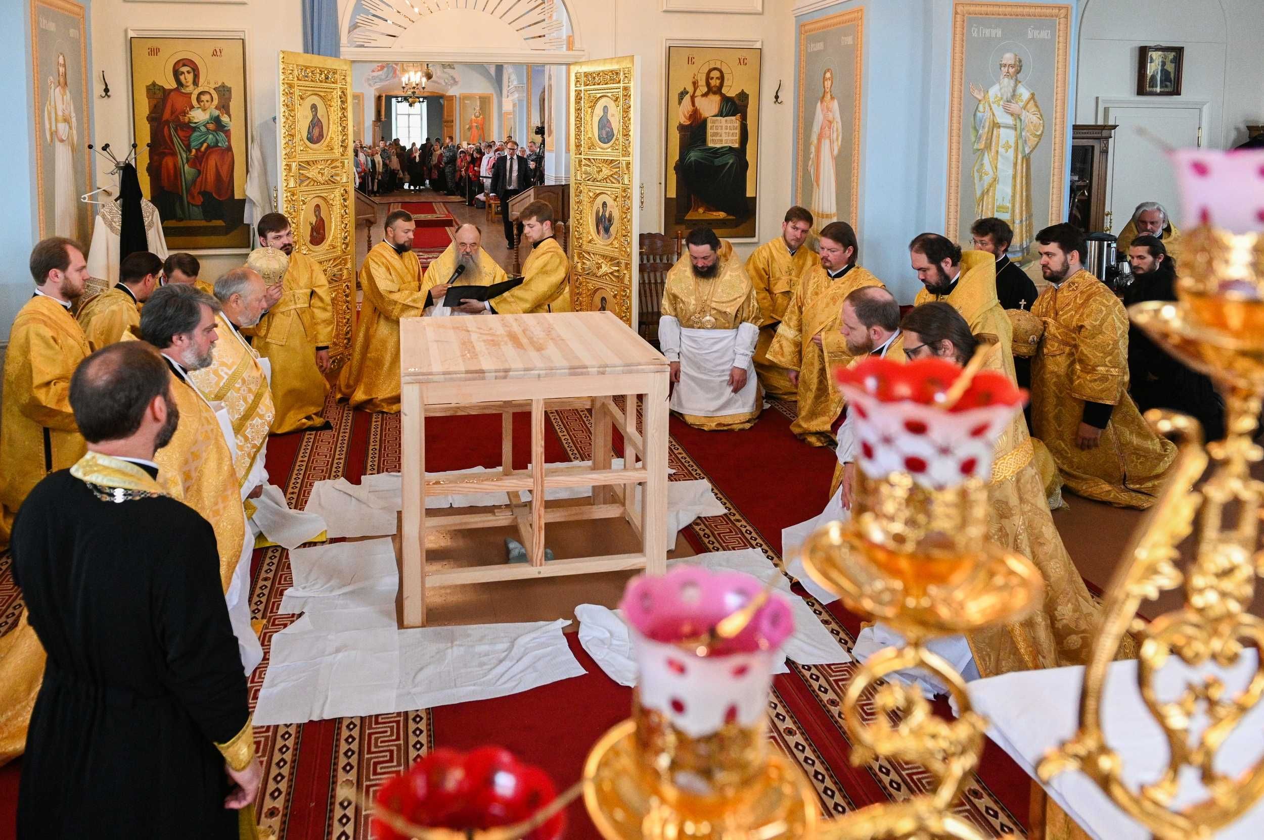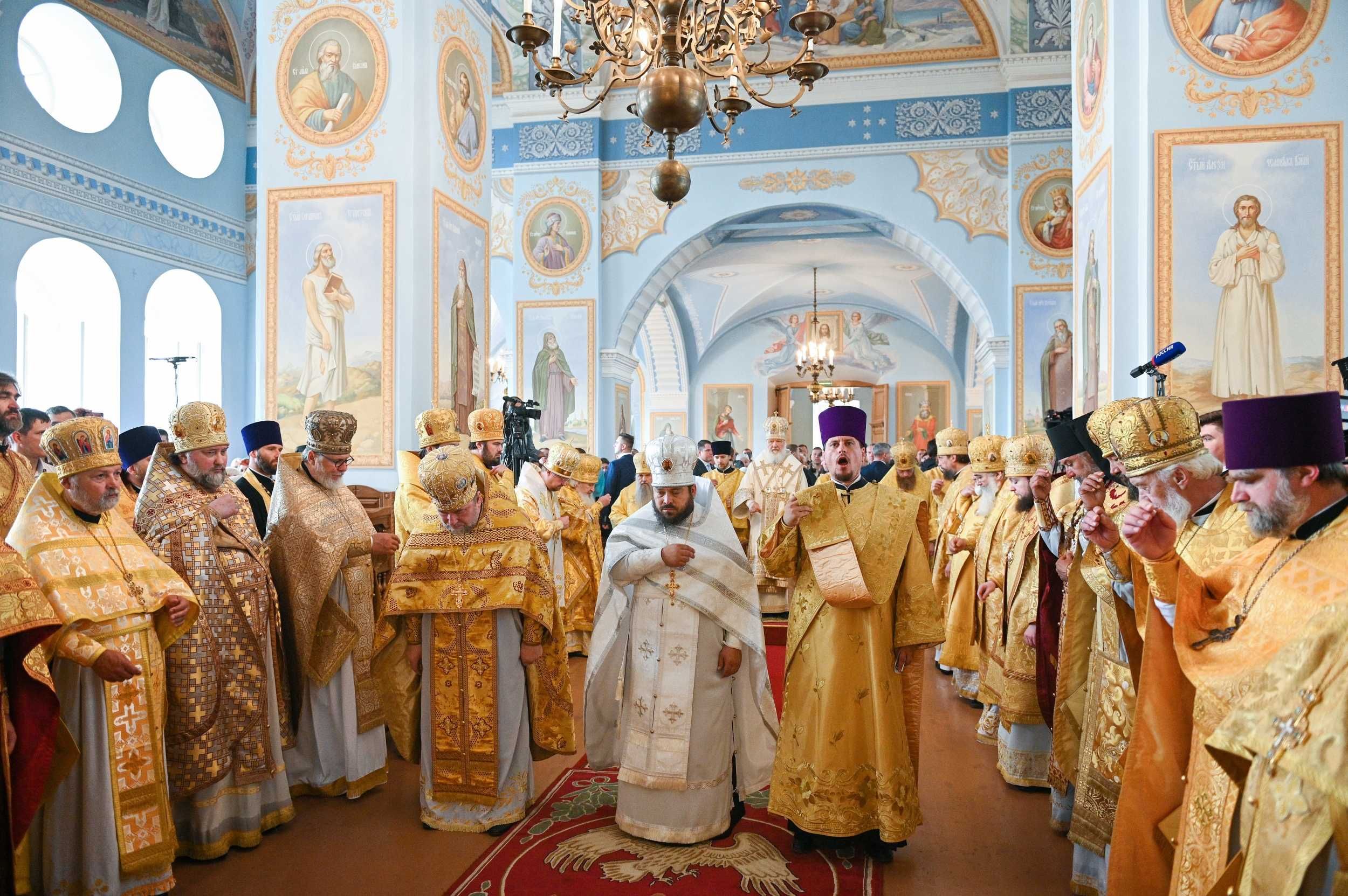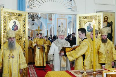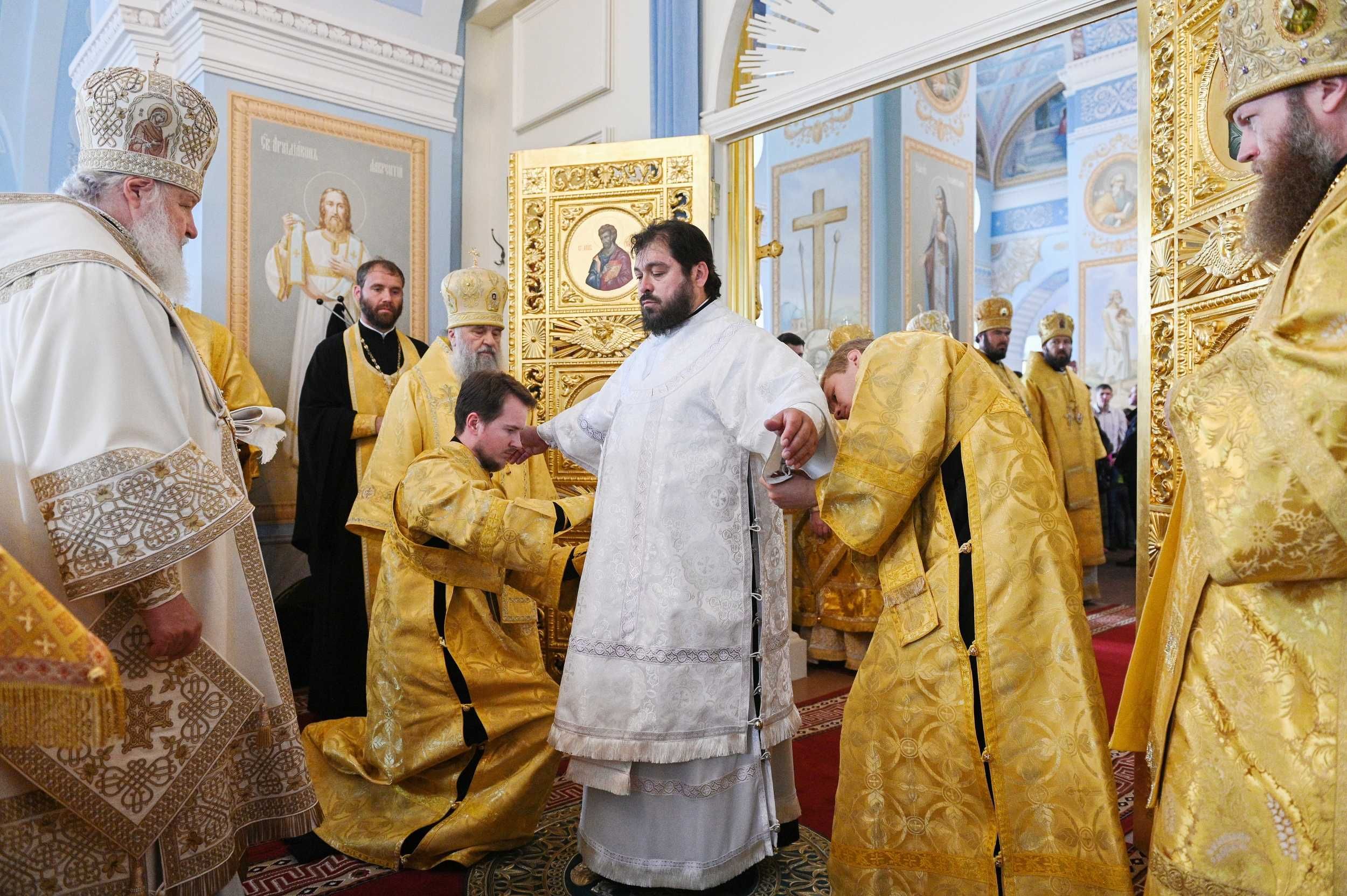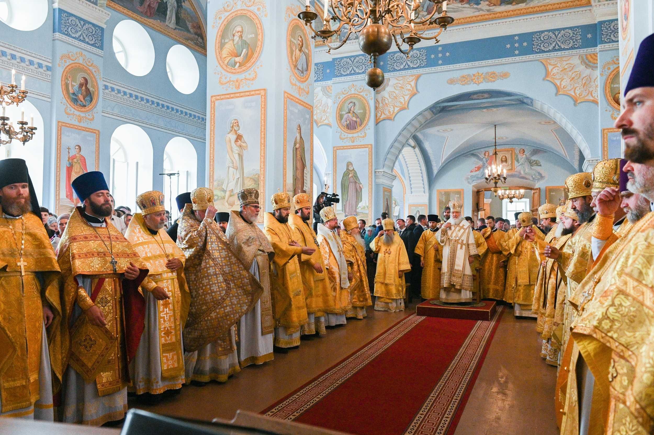 Затем Предстоятель Русской Православной Церкви совершил чин великого освящения верхнего храма собора Рождества Пресвятой Богородицы и Божественную литургию в новоосвященном храме.