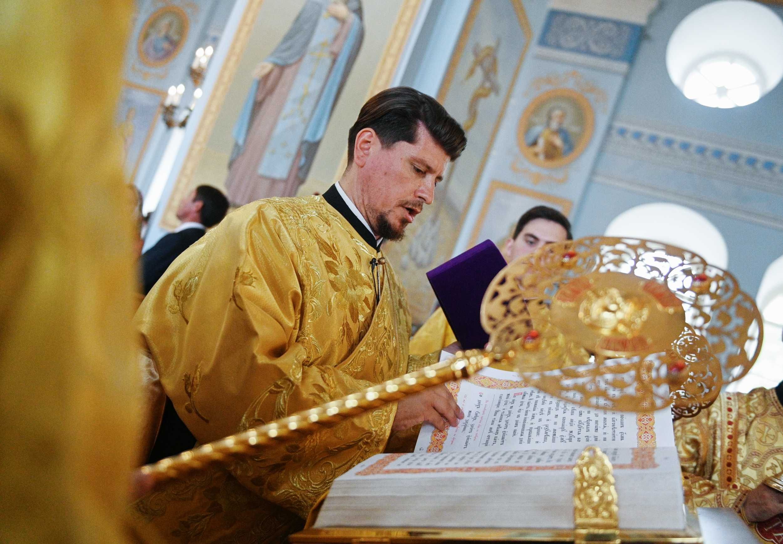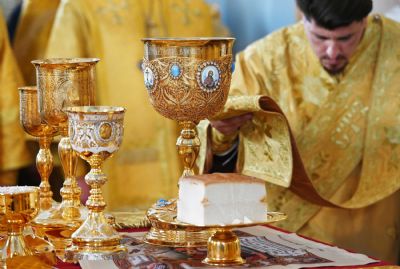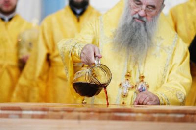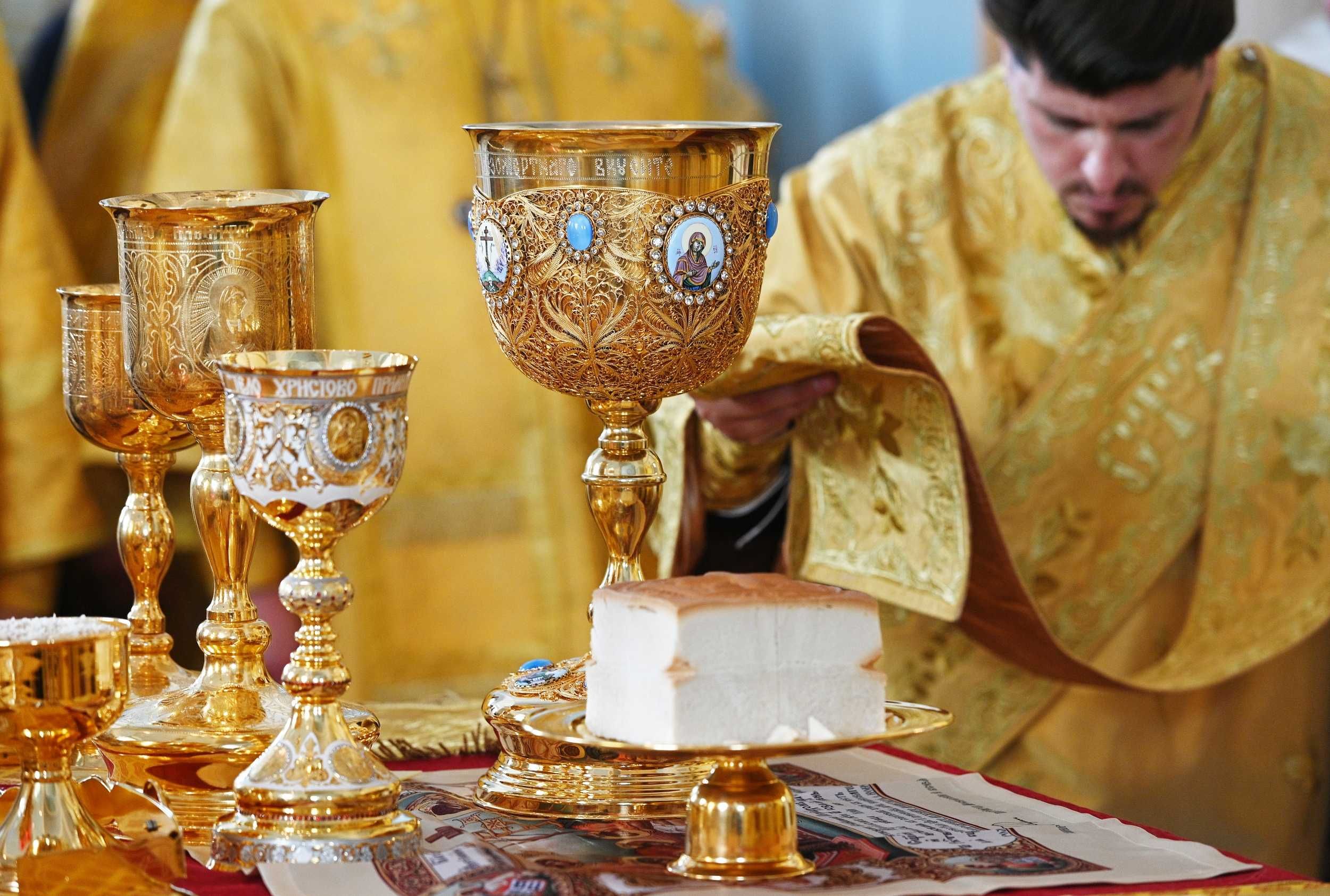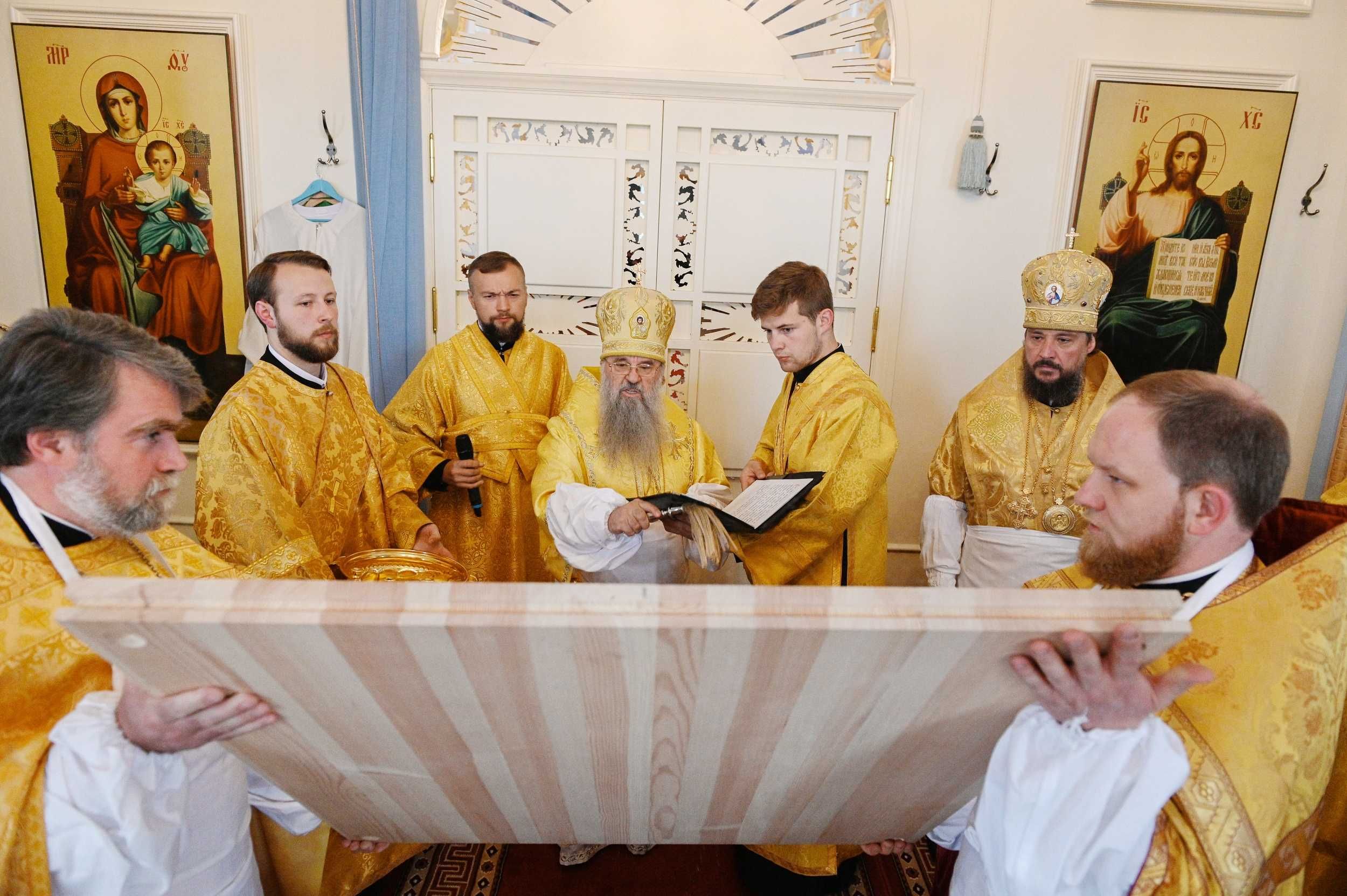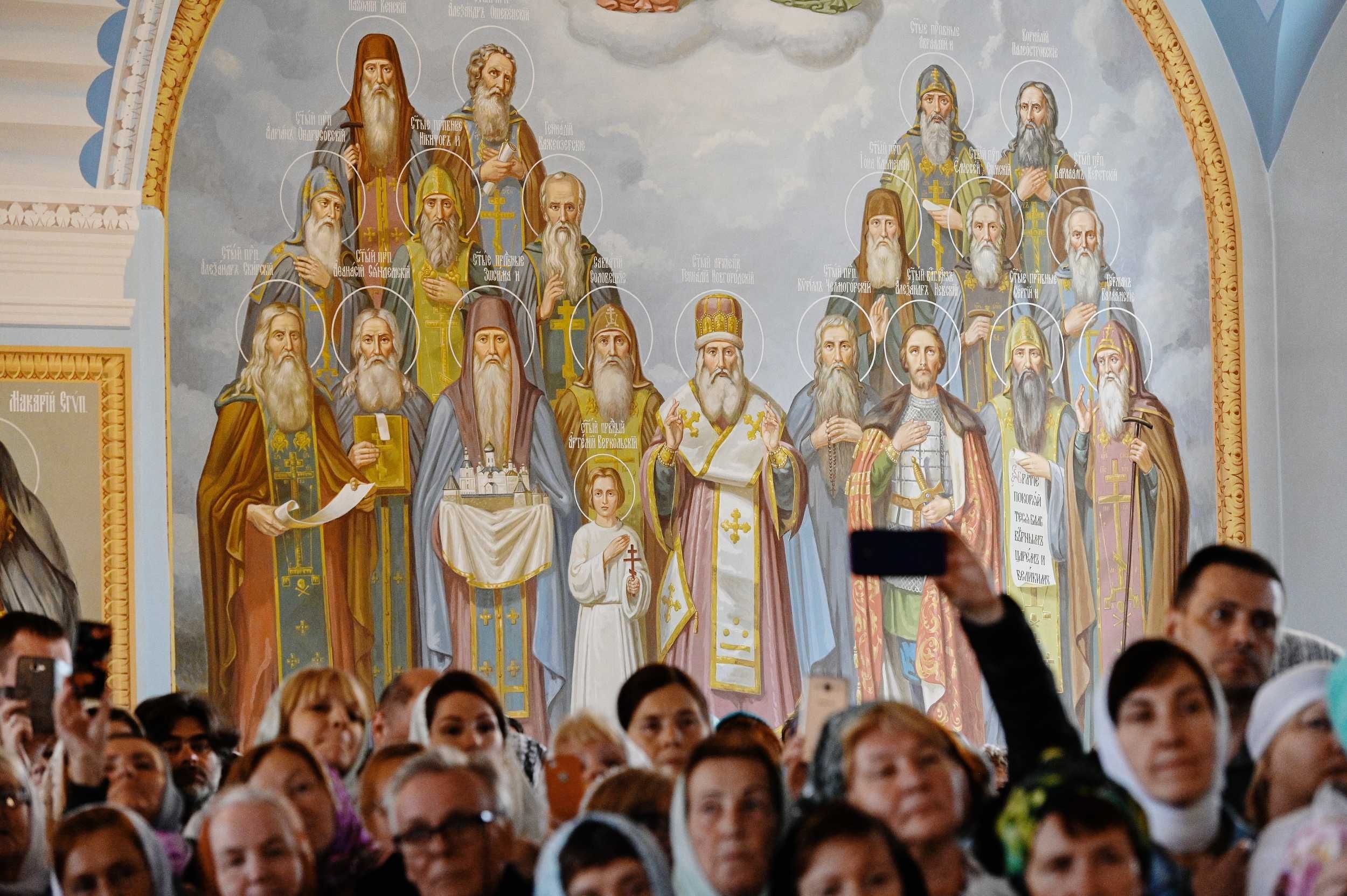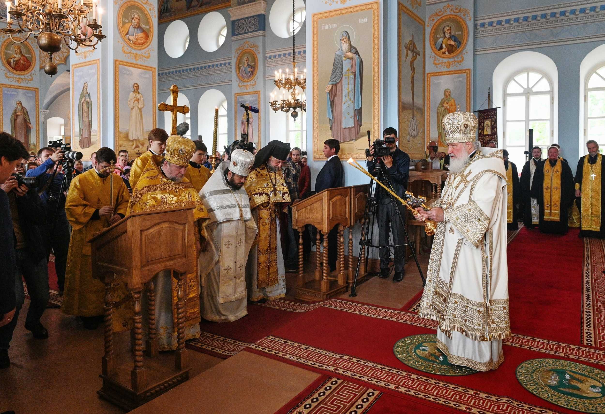 Затем Предстоятель Русской Православной Церкви совершил чин великого освящения верхнего храма собора Рождества Пресвятой Богородицы и Божественную литургию в новоосвященном храме.