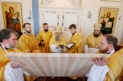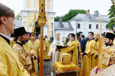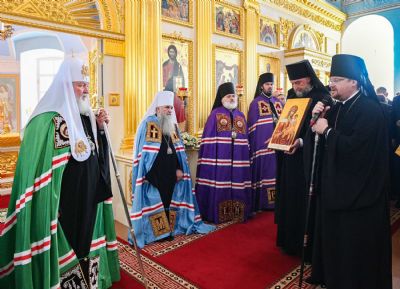 По окончании богослужения священноархимандрит Коневского Рождество-Богородичного монастыря епископ Выборгский и Приозерский Игнатий приветствовал Предстоятеля Русской Церкви и преподнес Его Святейшеству список Коневской иконы Божией Матери.