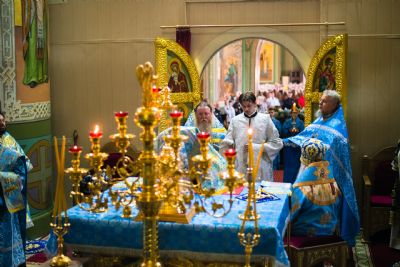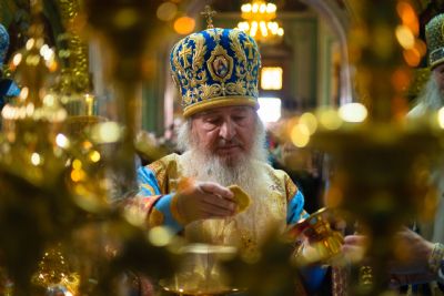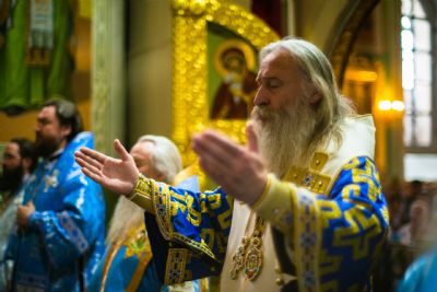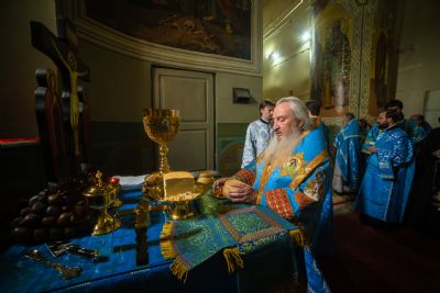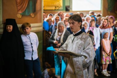 По запричастном стихе протоиерей Владимир Самойленко огласил послание митрополита Феофана архипастырям, пастырям, монашествующим и мирянам Татарстанской митрополии по случаю празднования 440-летия явления иконы Пресвятой Богородицы во граде Казани.