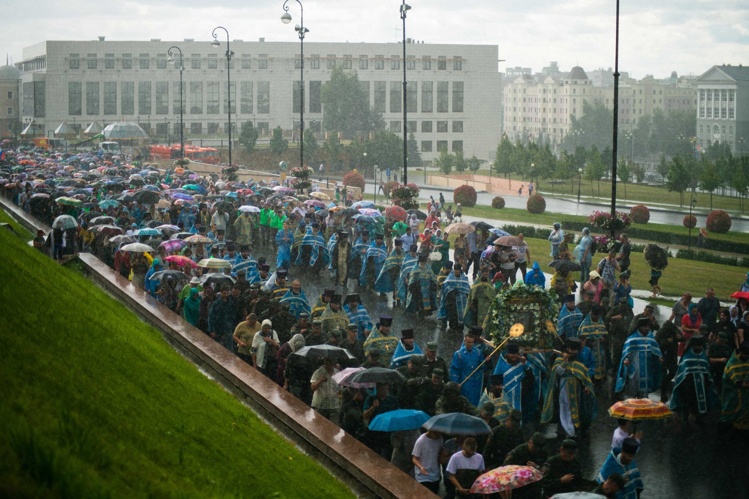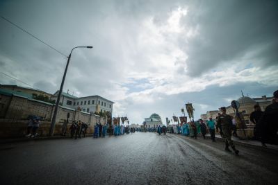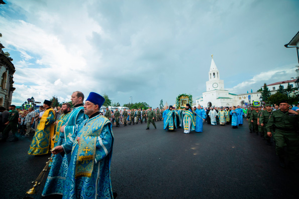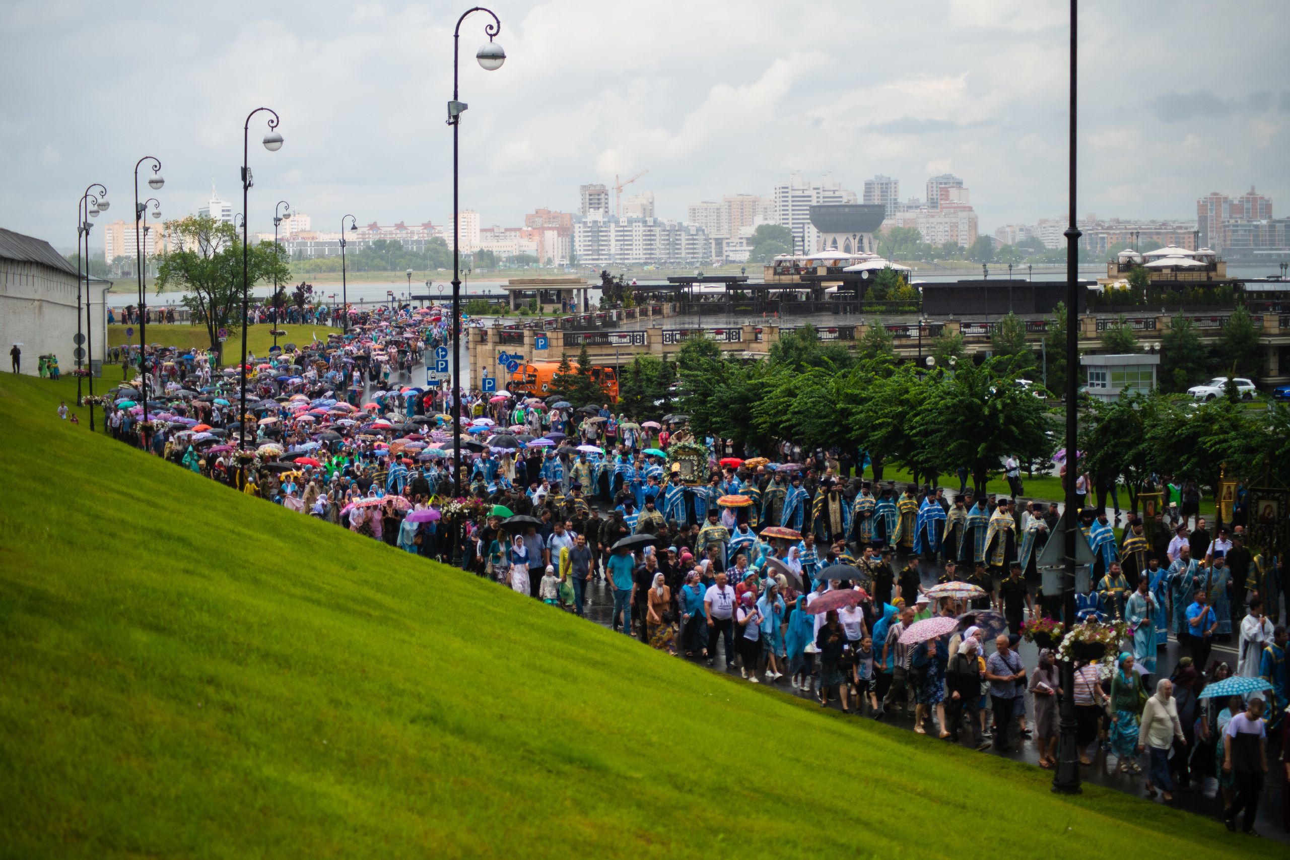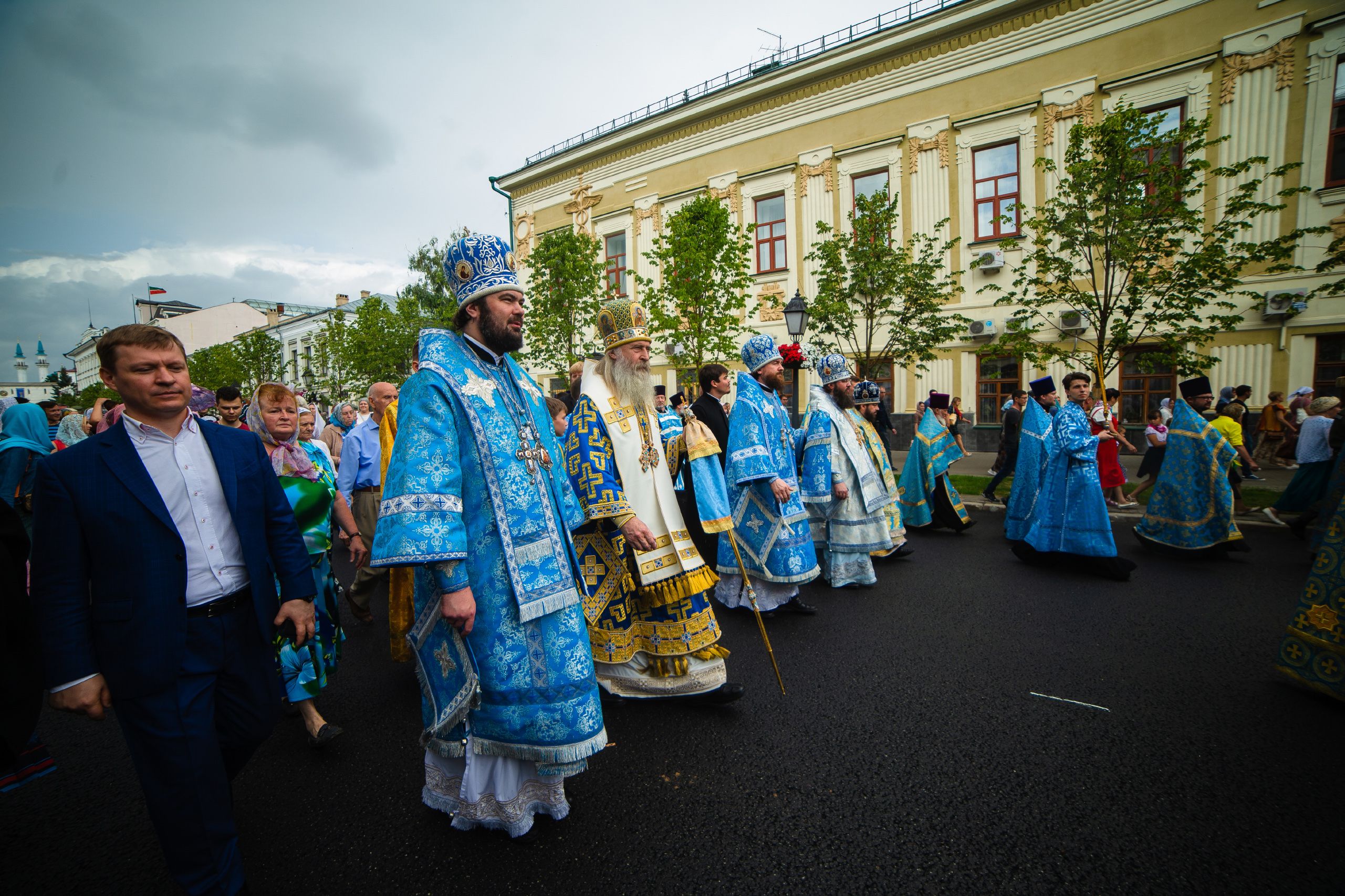 По завершении Литургии архипастыри, духовенство и миряне прошли крестным ходом с чудотворным списком Казанского образа от кремля к месту явления иконы — в Богородицкий монастырь. Молитвенное шествие сопровождалось колокольным звоном храмов и монастырей, расположенных в центре города. Верующие исполняли славословные песнопения Царице Небесной. В этом году крестоходцы проследовали по улицам Кремлевская, Чернышевского, Профсоюзная, Баумана (вдоль Площади Тысячелетия), Батурина, Карла Маркса, Миславского, Большая Красная.