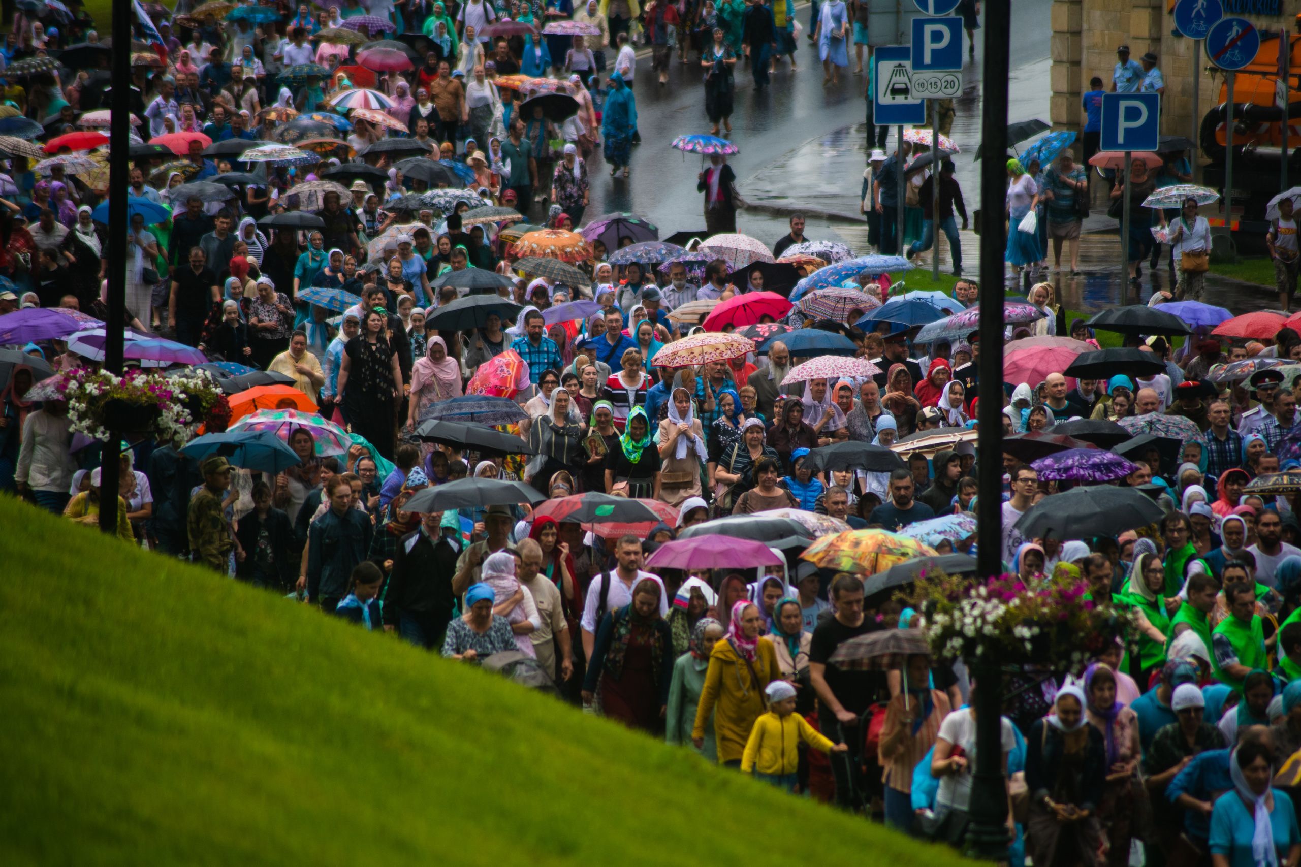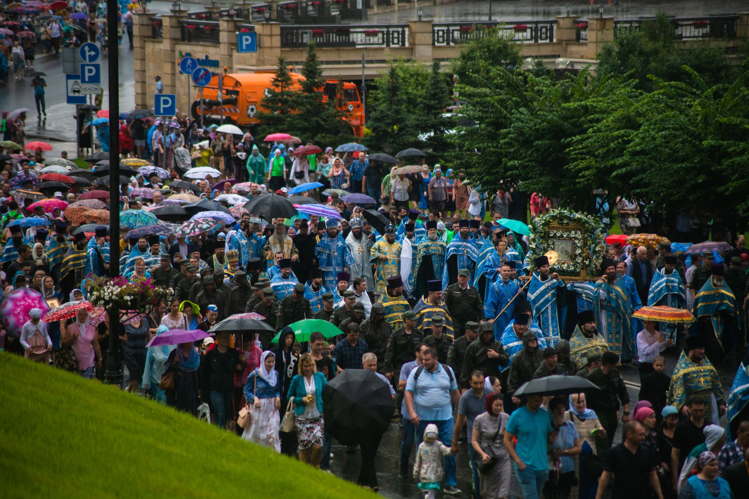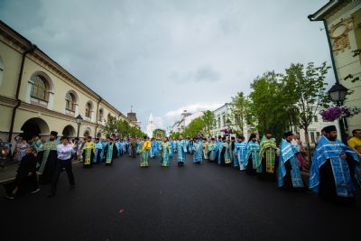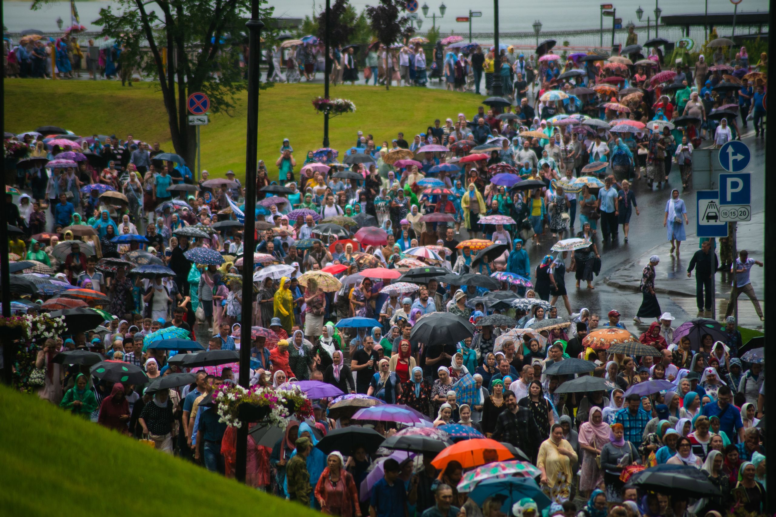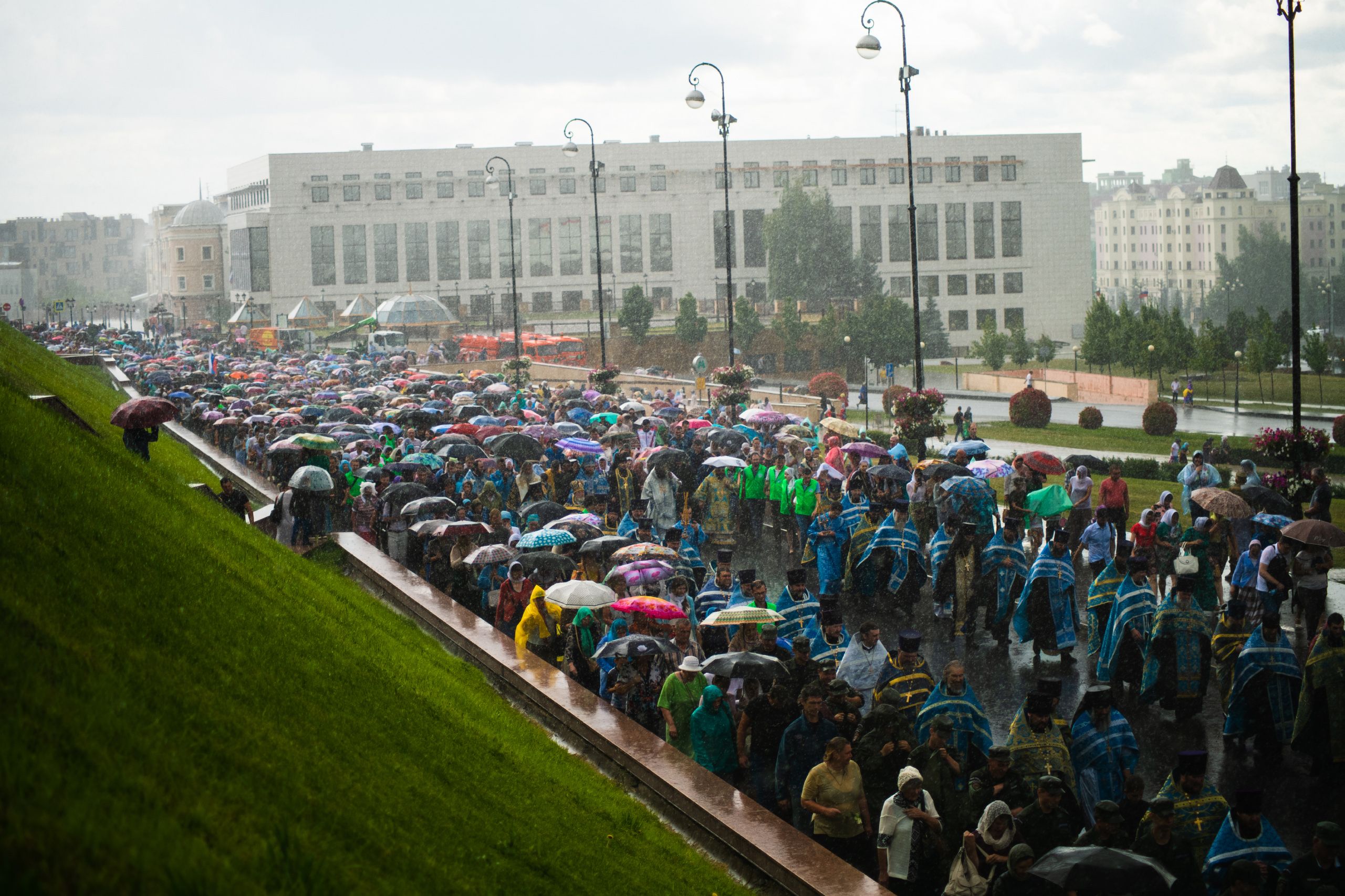 По завершении Литургии архипастыри, духовенство и миряне прошли крестным ходом с чудотворным списком Казанского образа от кремля к месту явления иконы — в Богородицкий монастырь. Молитвенное шествие сопровождалось колокольным звоном храмов и монастырей, расположенных в центре города. Верующие исполняли славословные песнопения Царице Небесной. В этом году крестоходцы проследовали по улицам Кремлевская, Чернышевского, Профсоюзная, Баумана (вдоль Площади Тысячелетия), Батурина, Карла Маркса, Миславского, Большая Красная.