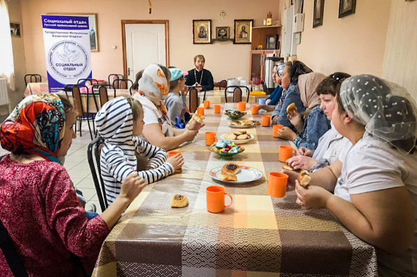 Затем в приходской трапезной состоялось чаепитие. Отец Сергий ознакомил гостей с основами православной веры и подробно ответил на их вопросы, касающиеся домашней и церковной молитв, смысла церковных Таинств и правил поведения в храме. Встреча продолжалась более часа. Завершая мероприятие, священник пообещал родителям организовать в ближайшее время занятия по основам православного вероучения, после чего вручил каждому из них продуктовый набор и Новый Завет.