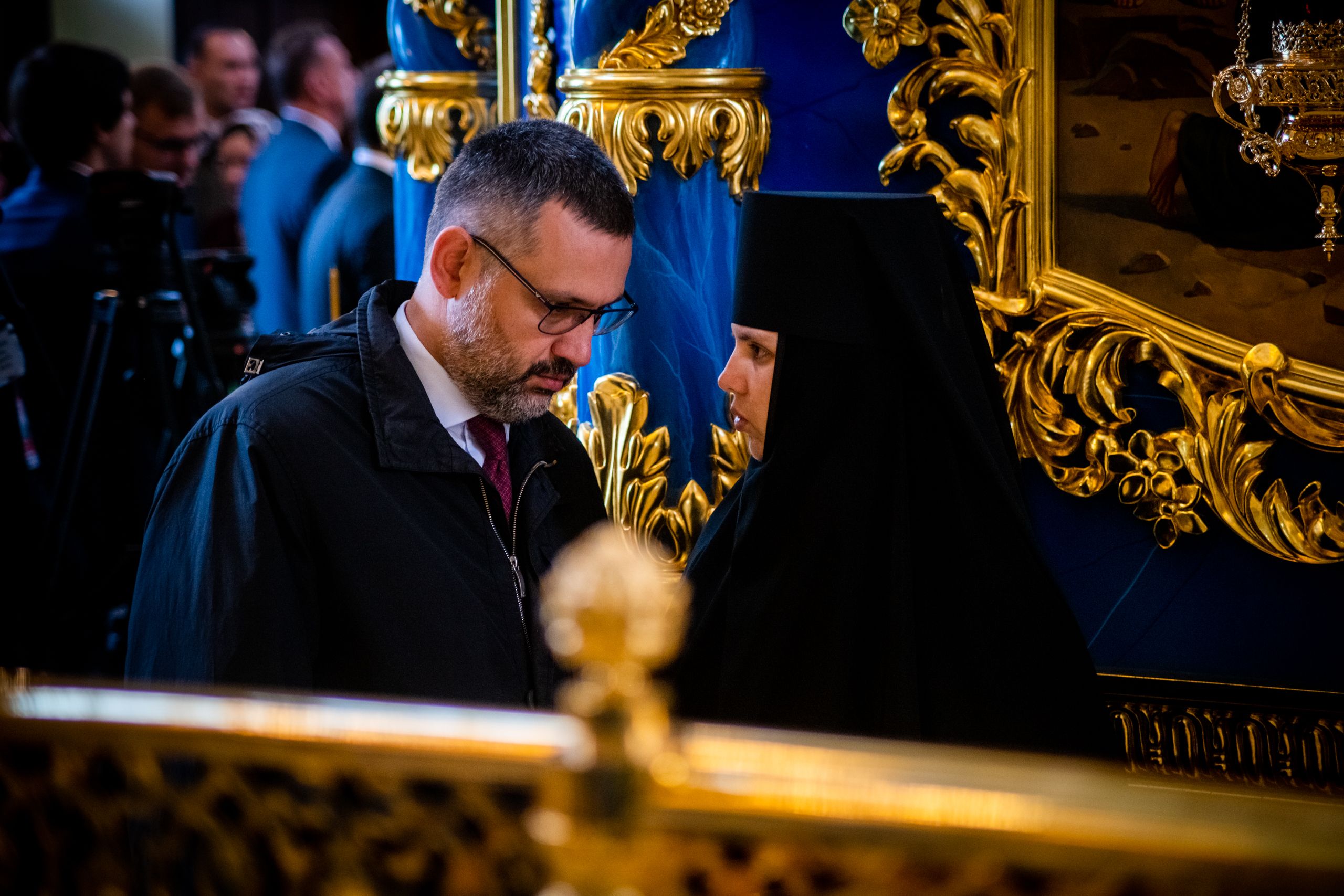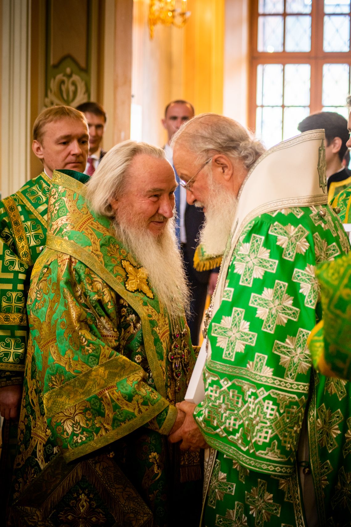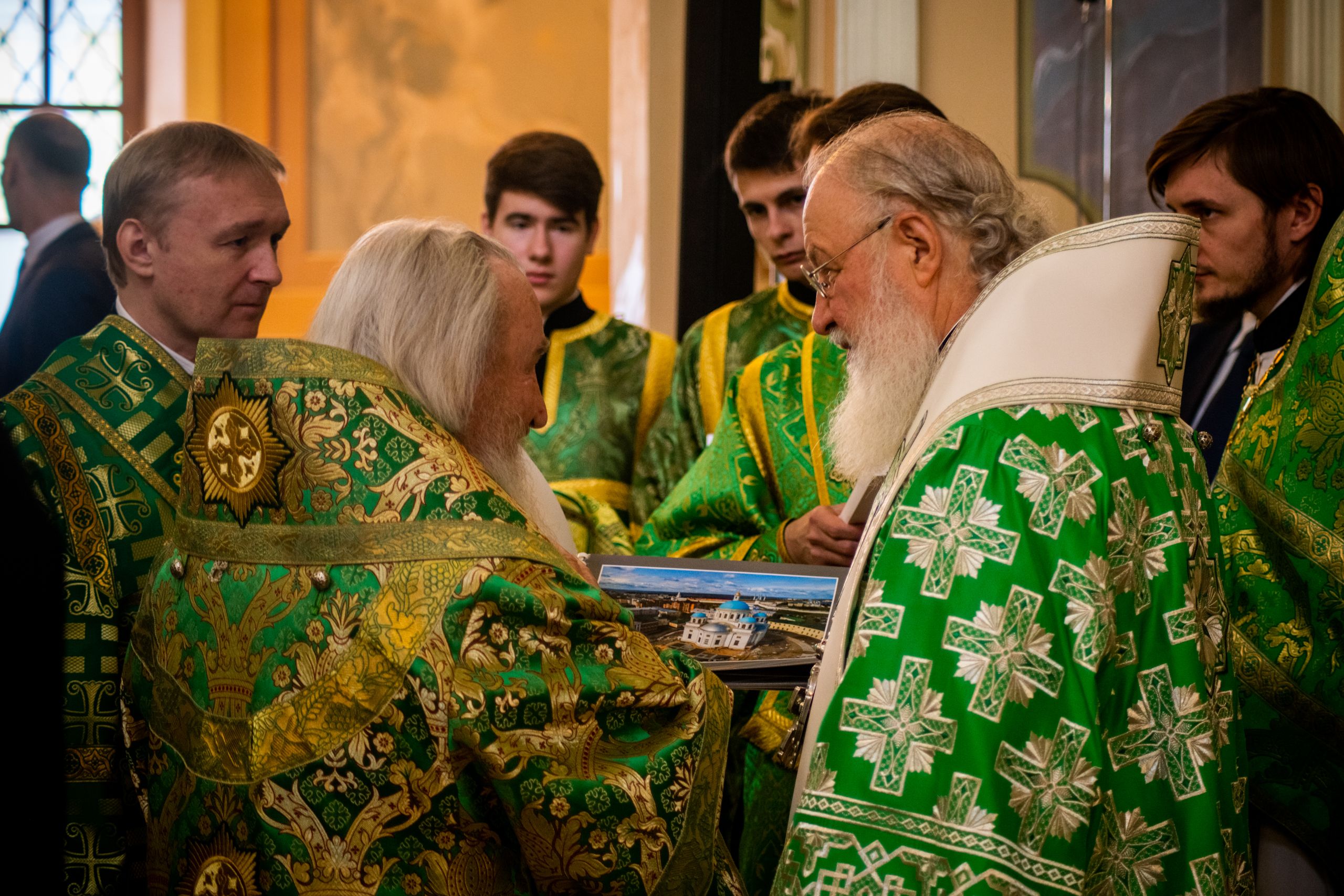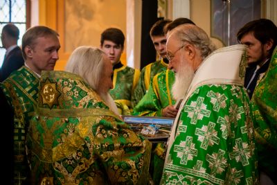 По запричастном стихе состоялась краткая беседа Патриарха Кирилла с митрополитом Феофаном. Глава Татарстанской митрополии ознакомил Предстоятеля Русской Православной Церкви с ходом воссоздания собора Казанской иконы Божией Матери.