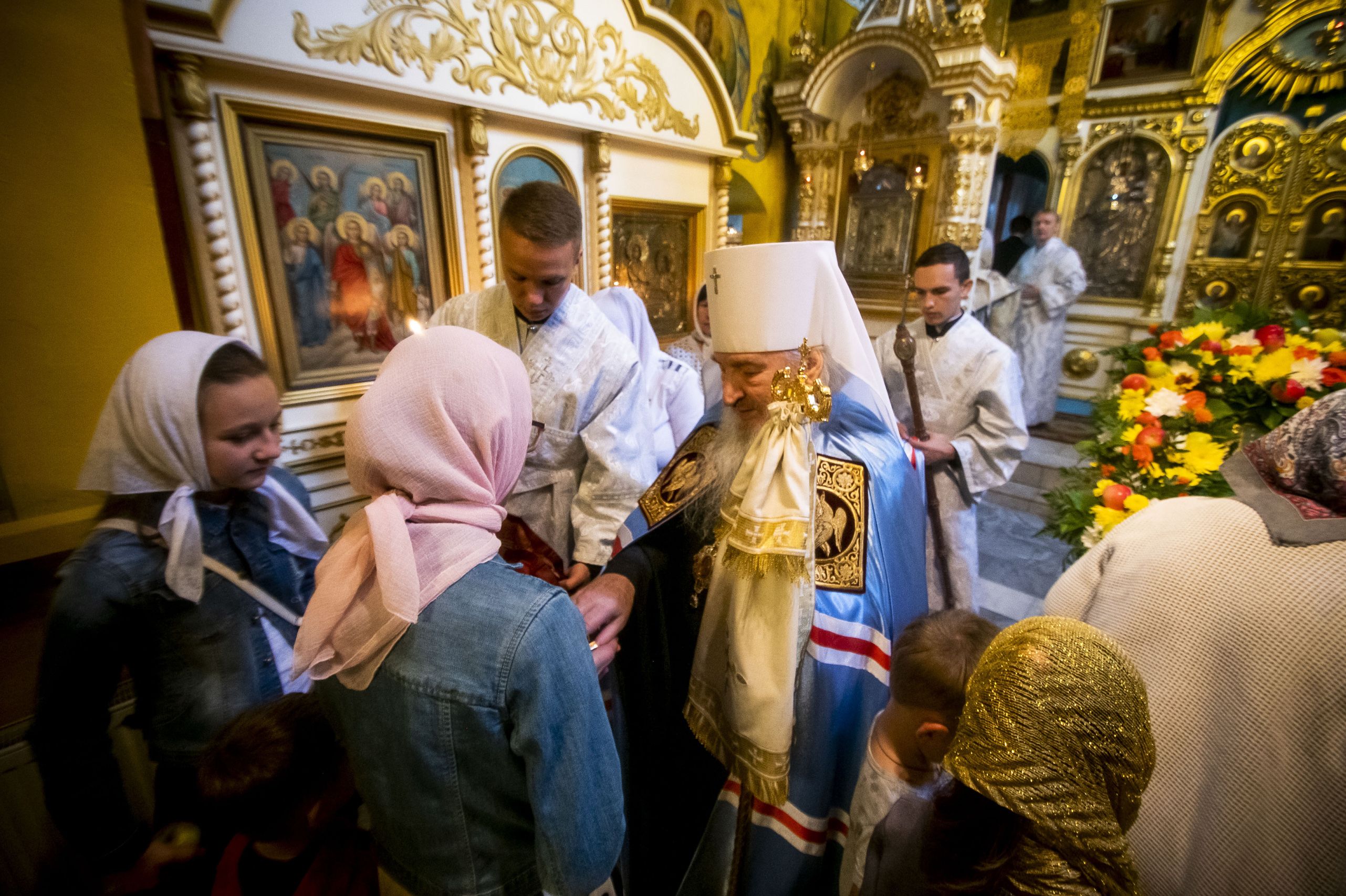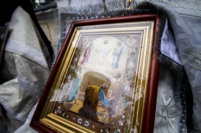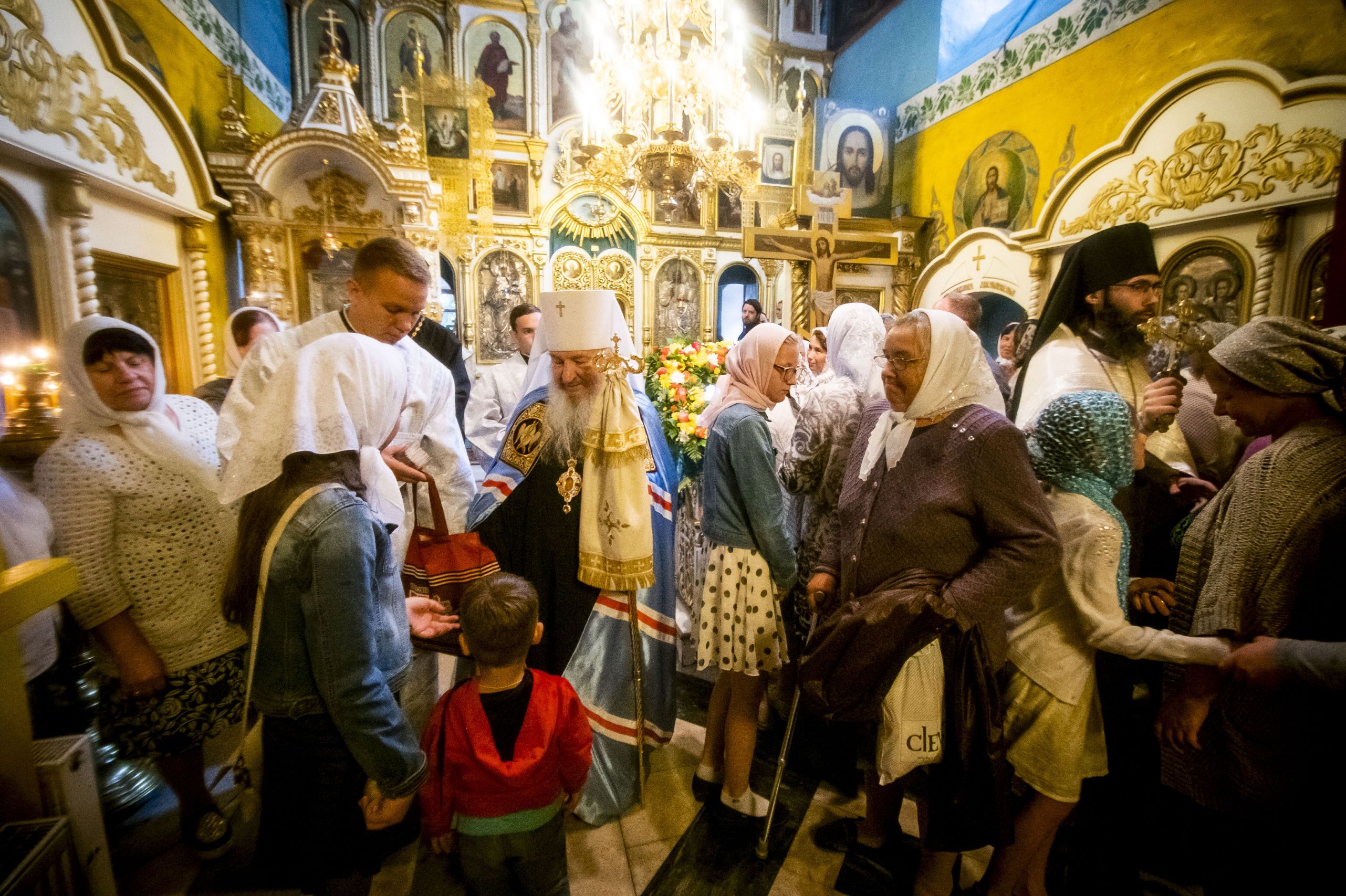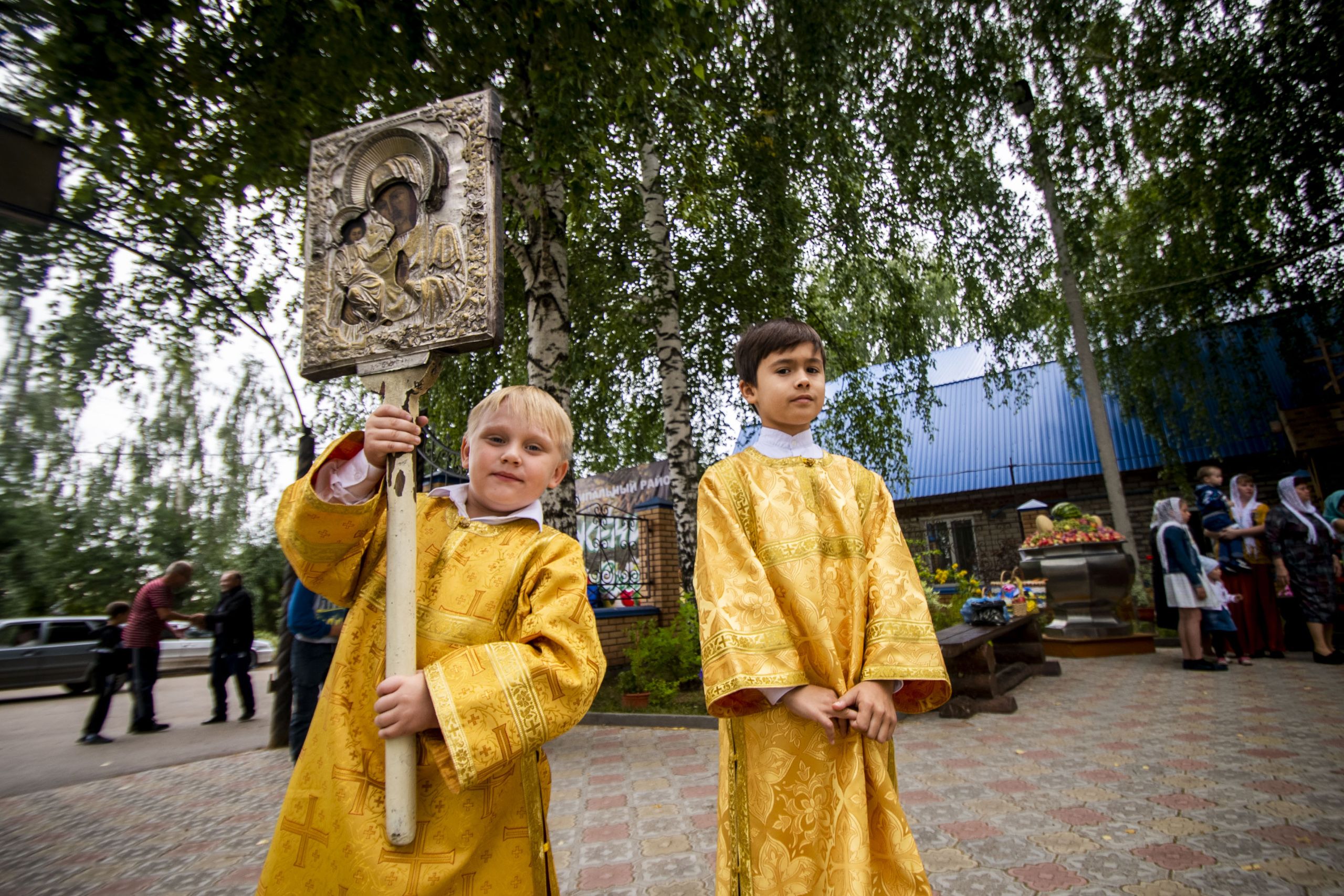 Во время прикладывания ко кресту священнослужители окропили святой водой плоды нового урожая, принесенные верующими в храм, и раздали маленькие иконы с Казанским образом Пресвятой Богородицы.