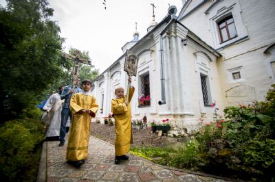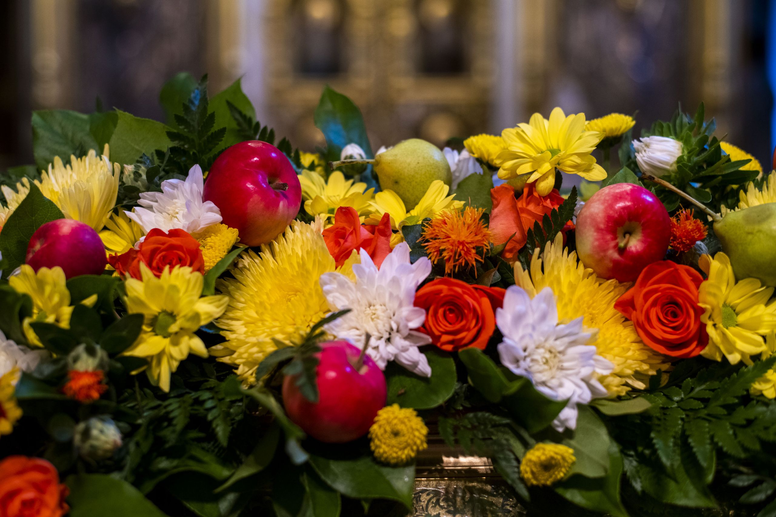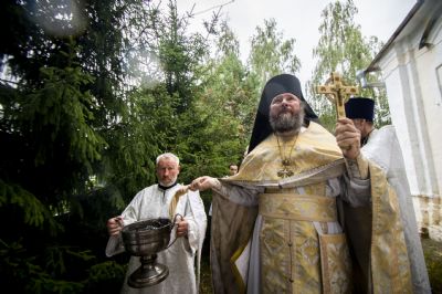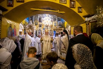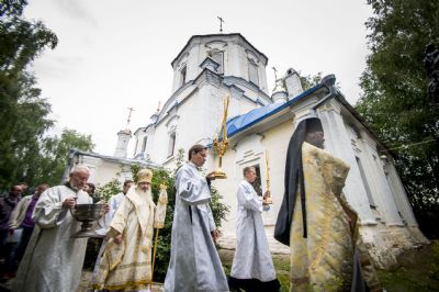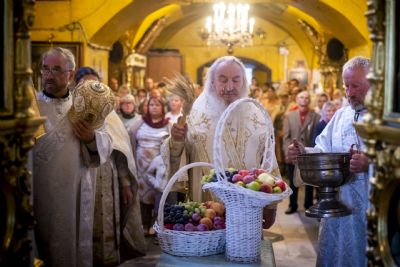 По заамвонной молитве архипастырь прочитал молитвы на благословение плодов и окропил их святой водой. Затем состоялся крестный ход вокруг храма.