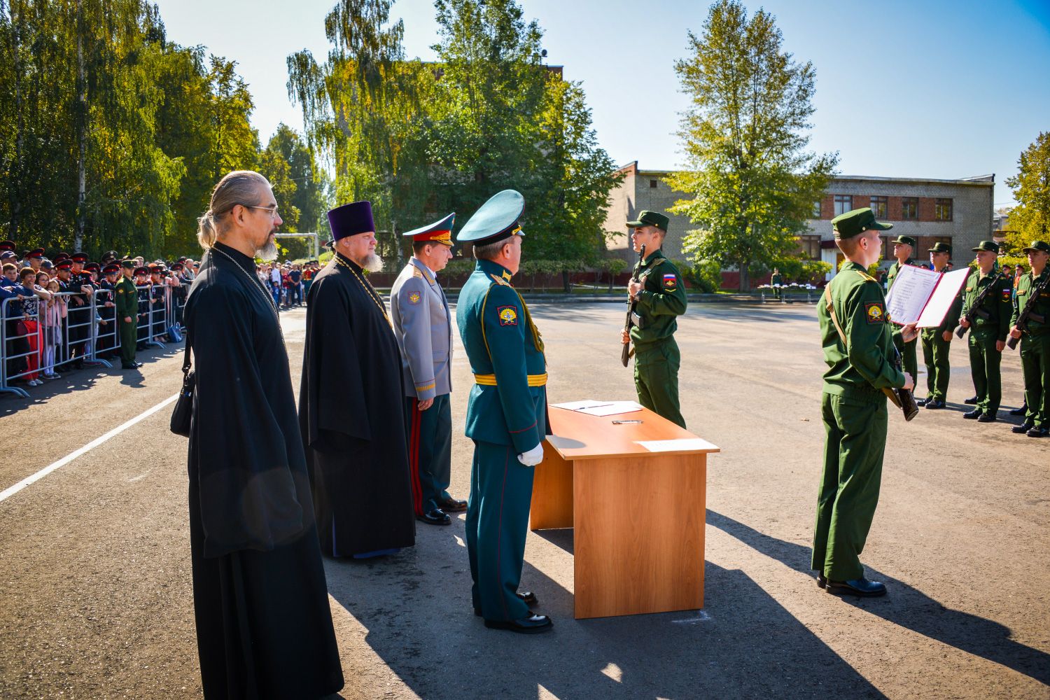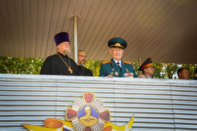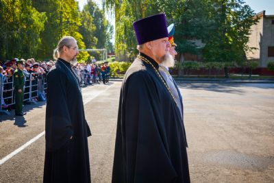 Протоиерей Владимир Самойленко передал командованию КВТКУ, первокурсникам и многочисленным гостям училища приветствие митрополита Казанского и Татарстанского Феофана, пожелав курсантам самоотверженно служить Отечеству и золотыми буквами вписать свое ратное служение в боевую славу прославленной Российской Армии.