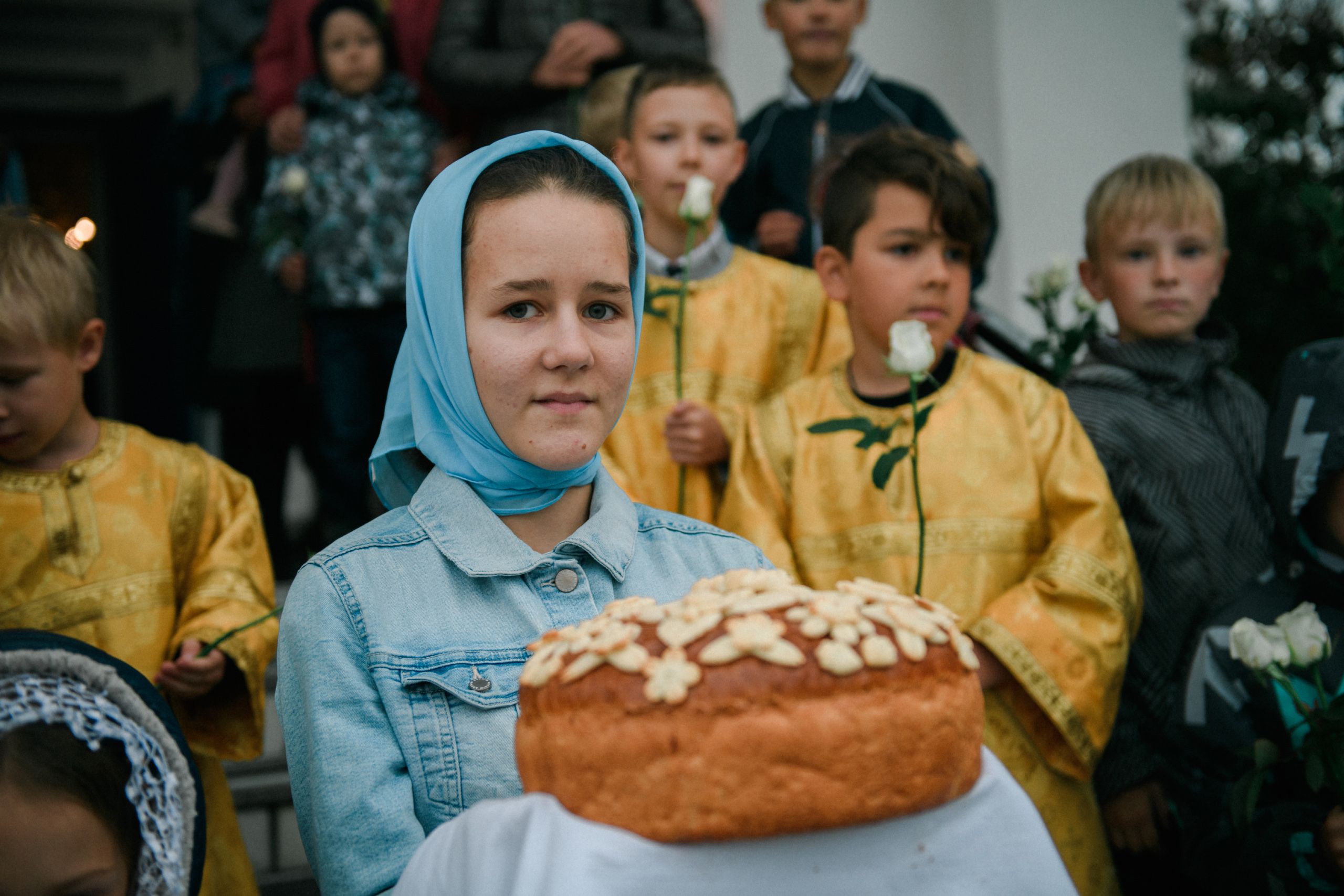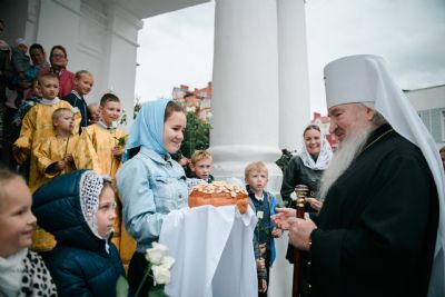 Перед началом богослужения у входа в храм архипастыря приветствовали учащиеся приходской воскресной школы.