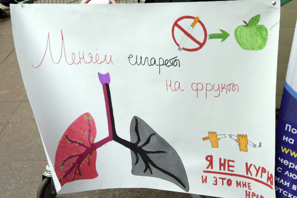«На аппарате мы разместили рисунок воспитанников воскресной школы. На нем изображено черное пятно, обозначающее раковую опухоль. Рядом с аппаратом поставили ящик. Когда желающие получить фрукты бросают в него сигарету, опухоль исчезает. Это значит, что отказ даже от одной сигареты увеличивает ваши шансы на сохранение здоровья», — рассказывает организатор акции, куратор социального отдела Артем Зуглов.