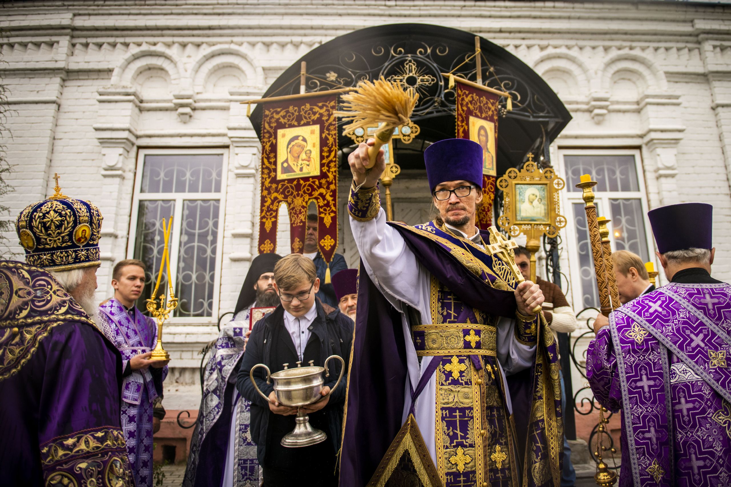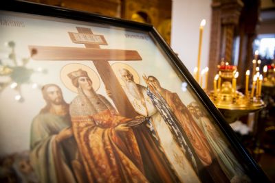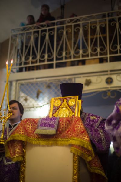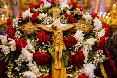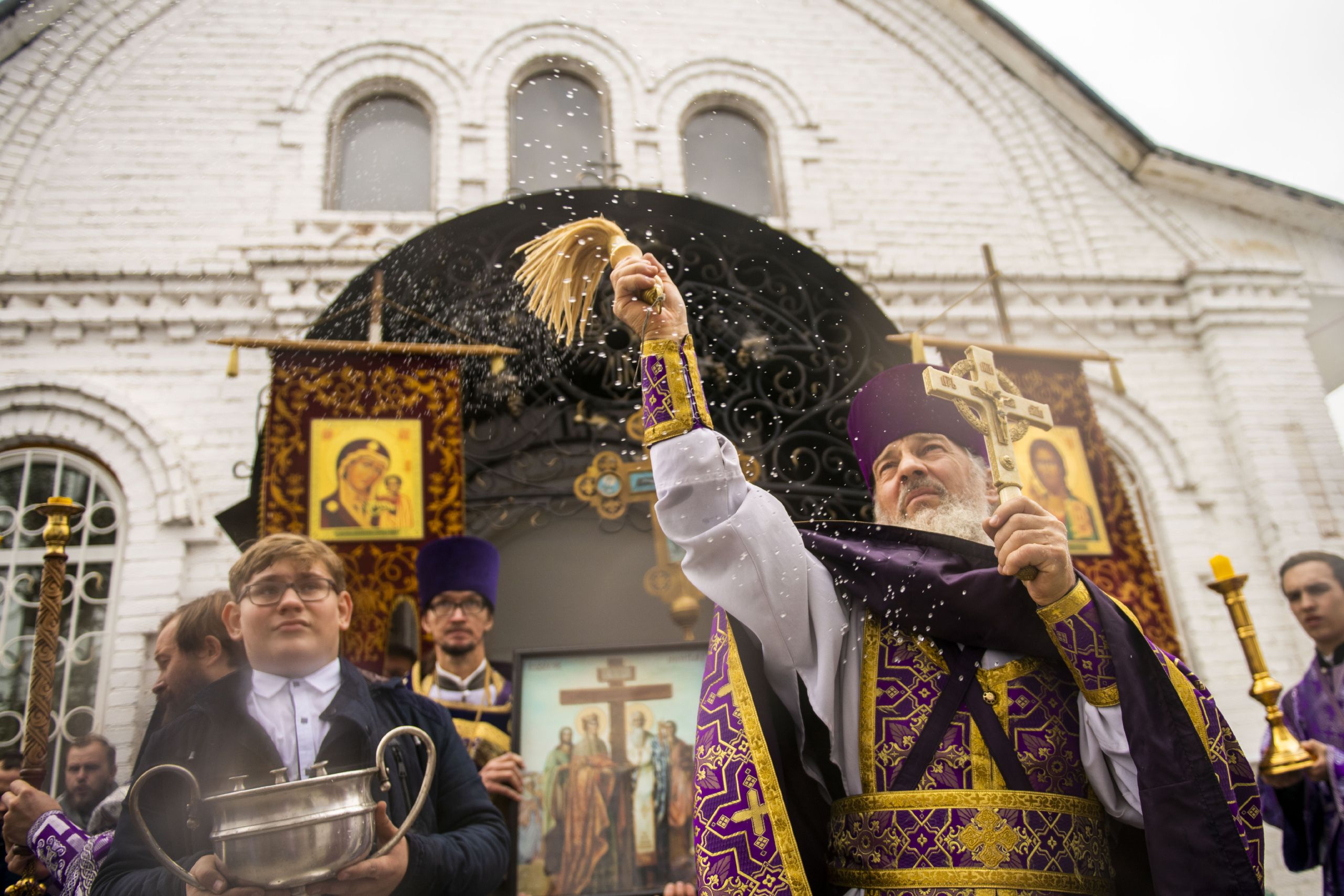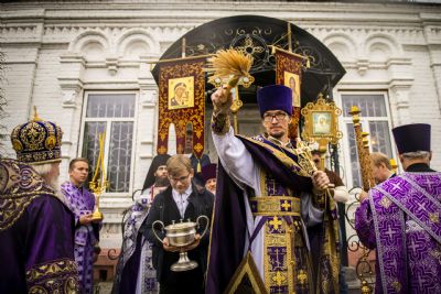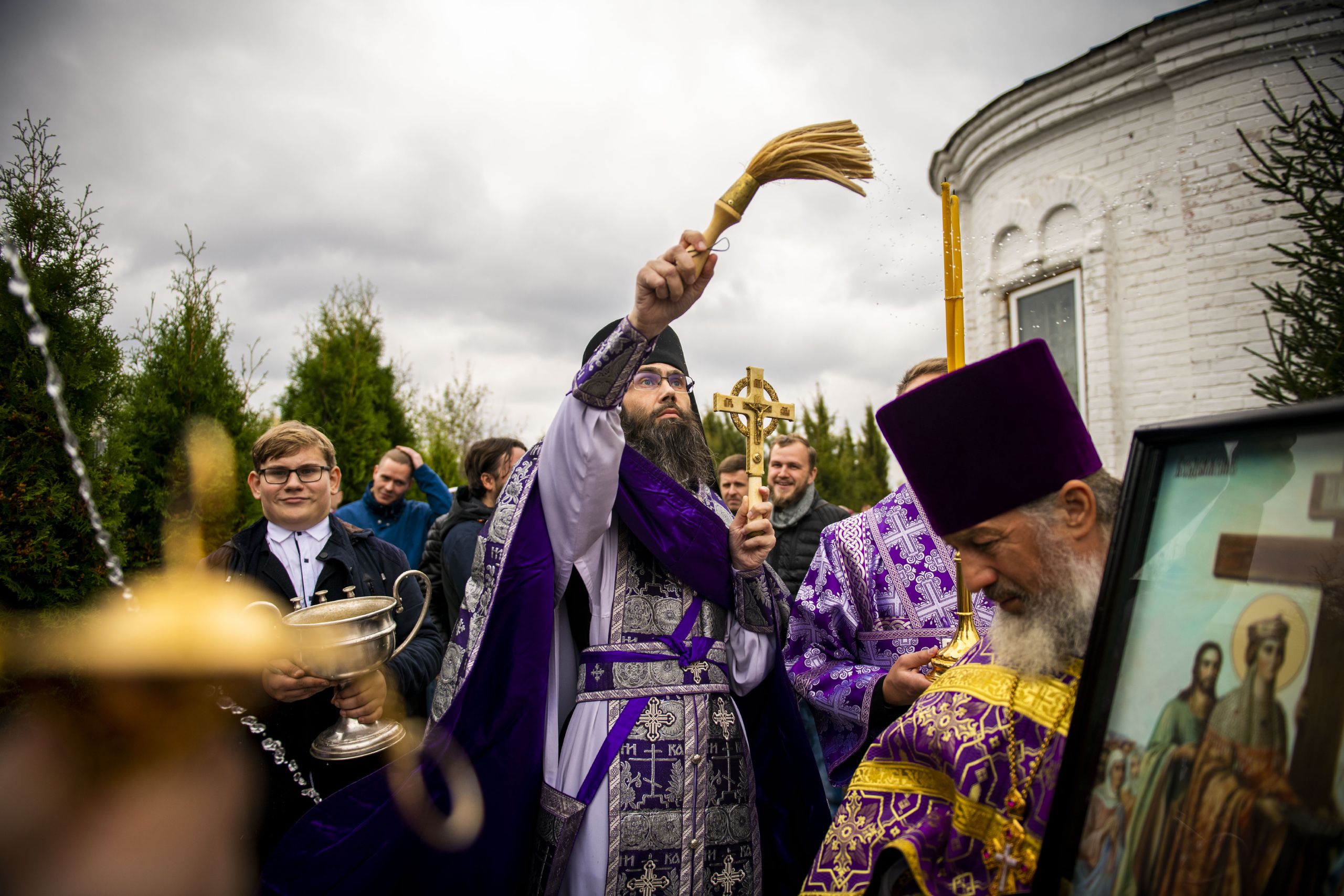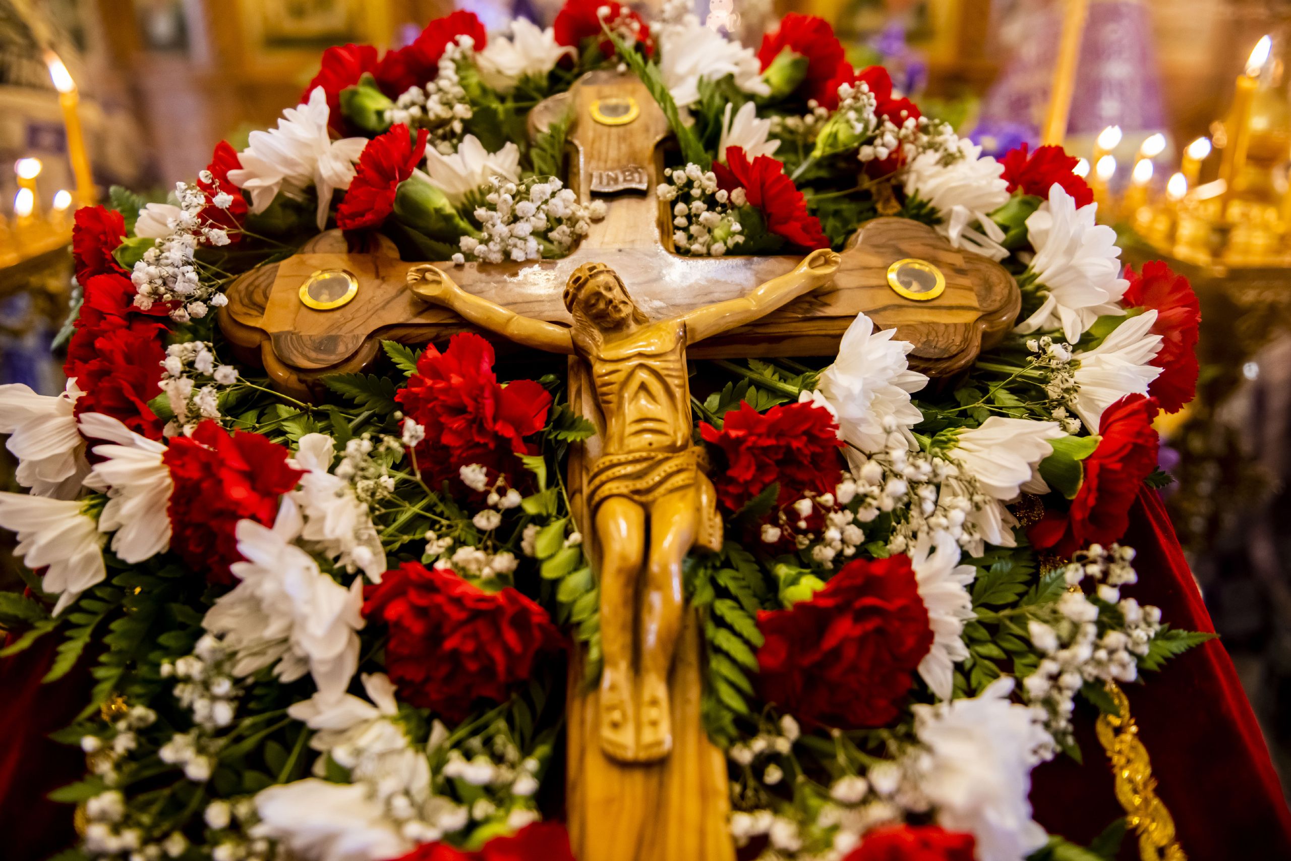 По окончании Литургии состоялся крестный ход вокруг храма. Духовенство и молящиеся совершили поклонение Животворящему Кресту Господню.
