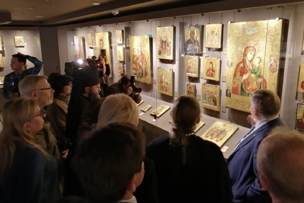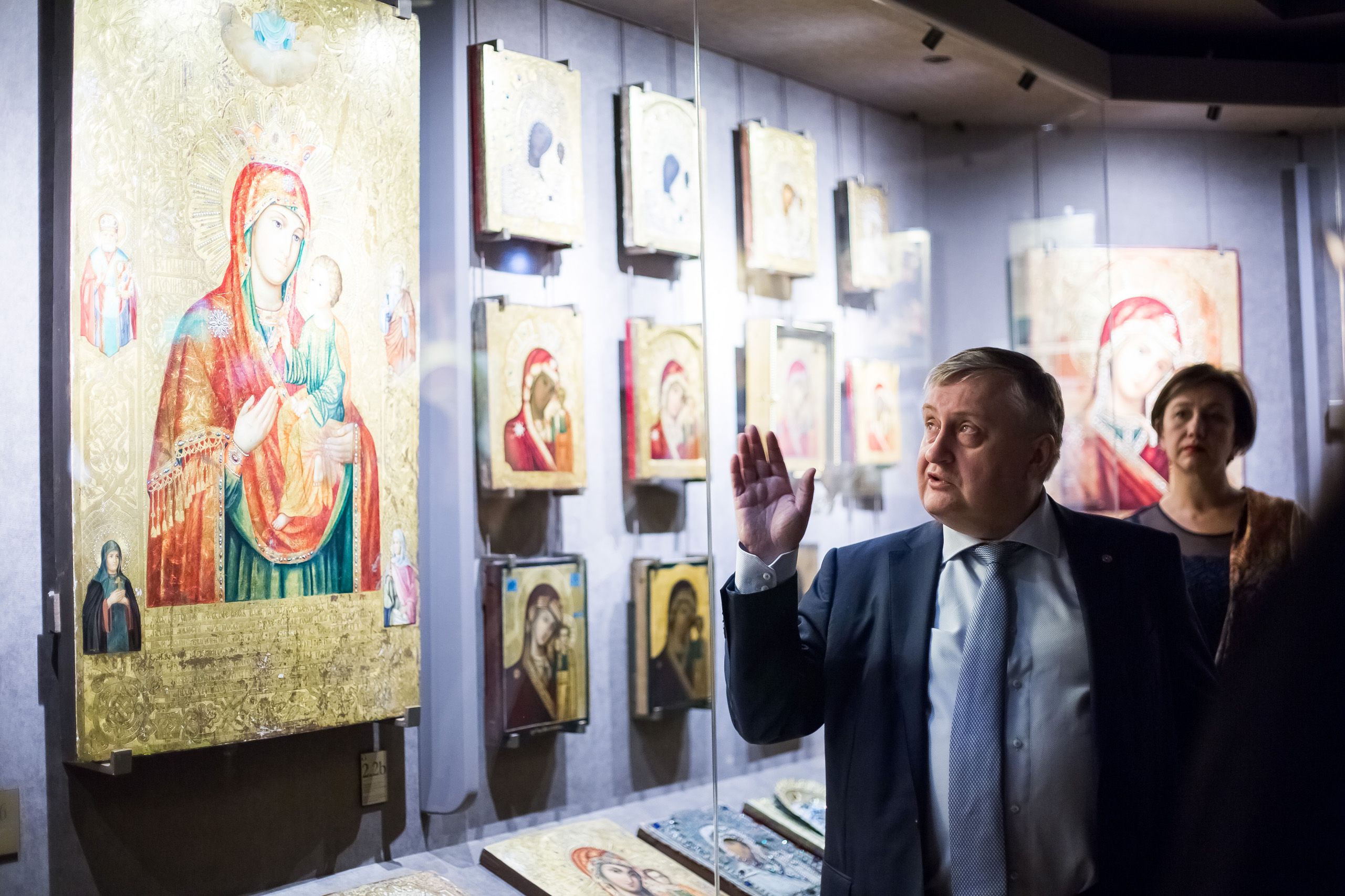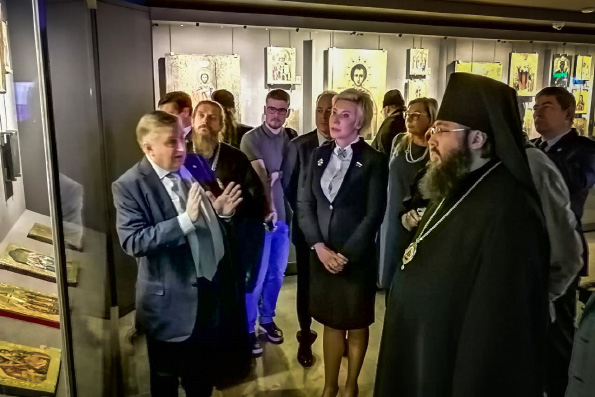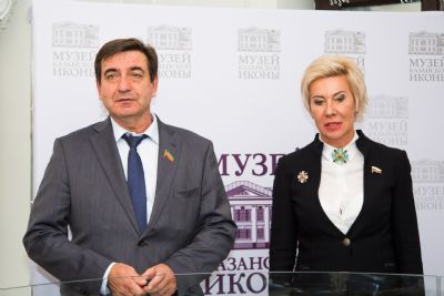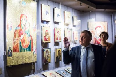 Далее Валерий Сорокин провел для почетных гостей экскурсию по музею. Меценат подробно рассказал о представленных экспонатах, об истории Казанской иконописной школы и особенностях ее письма.