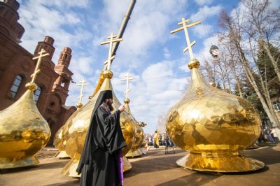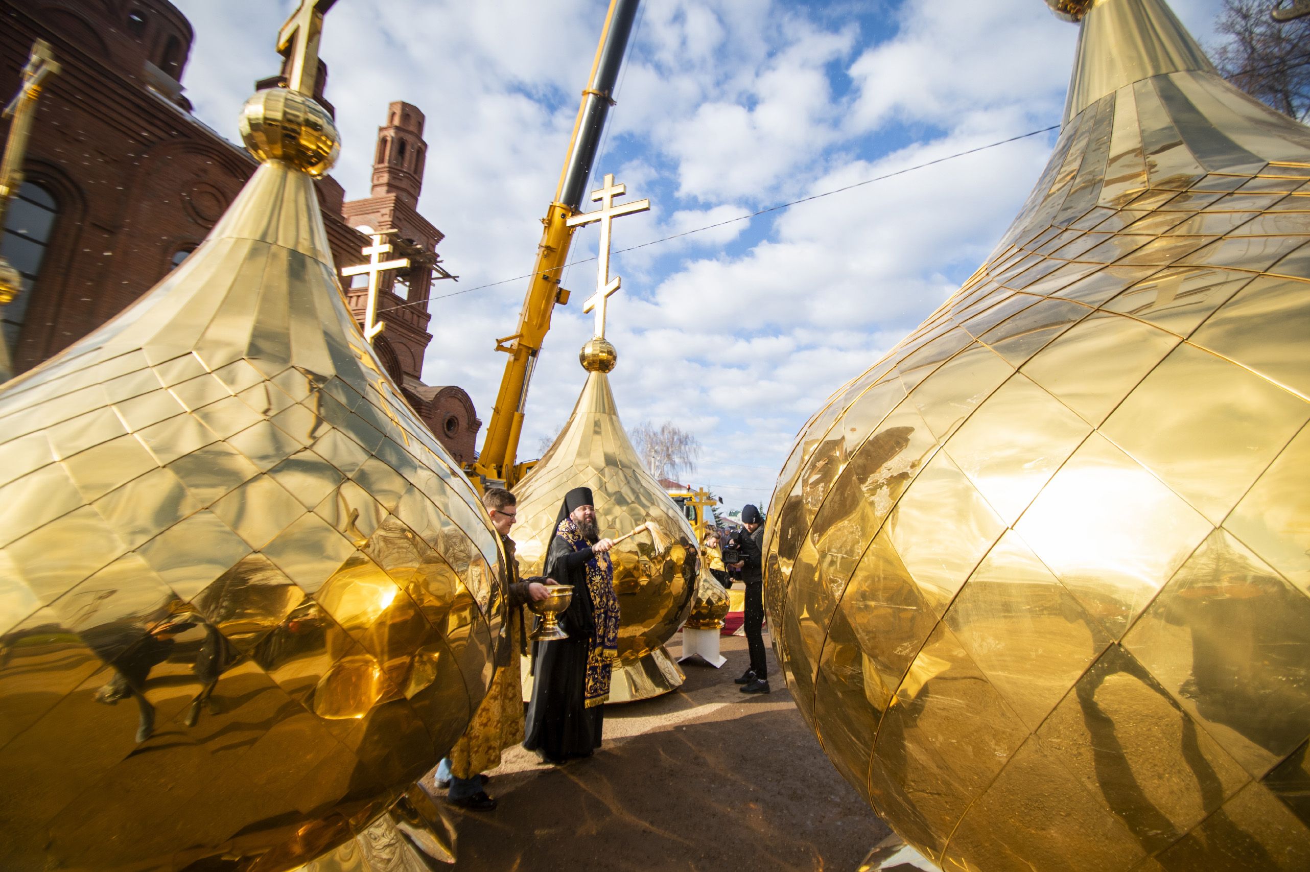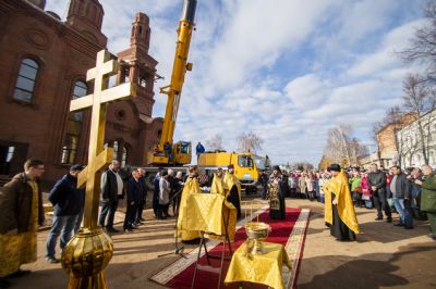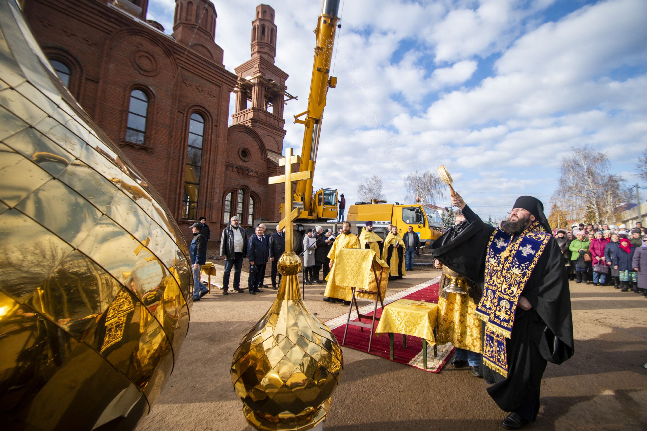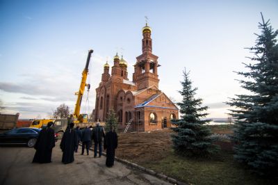 После молебного пения владыка Иннокентий прочитал молитву и окропил кресты и купола святой водой. Затем викарий Казанской епархии поздравил собравшихся с освящением куполов и крестов на сооружаемый Троицкий храм.