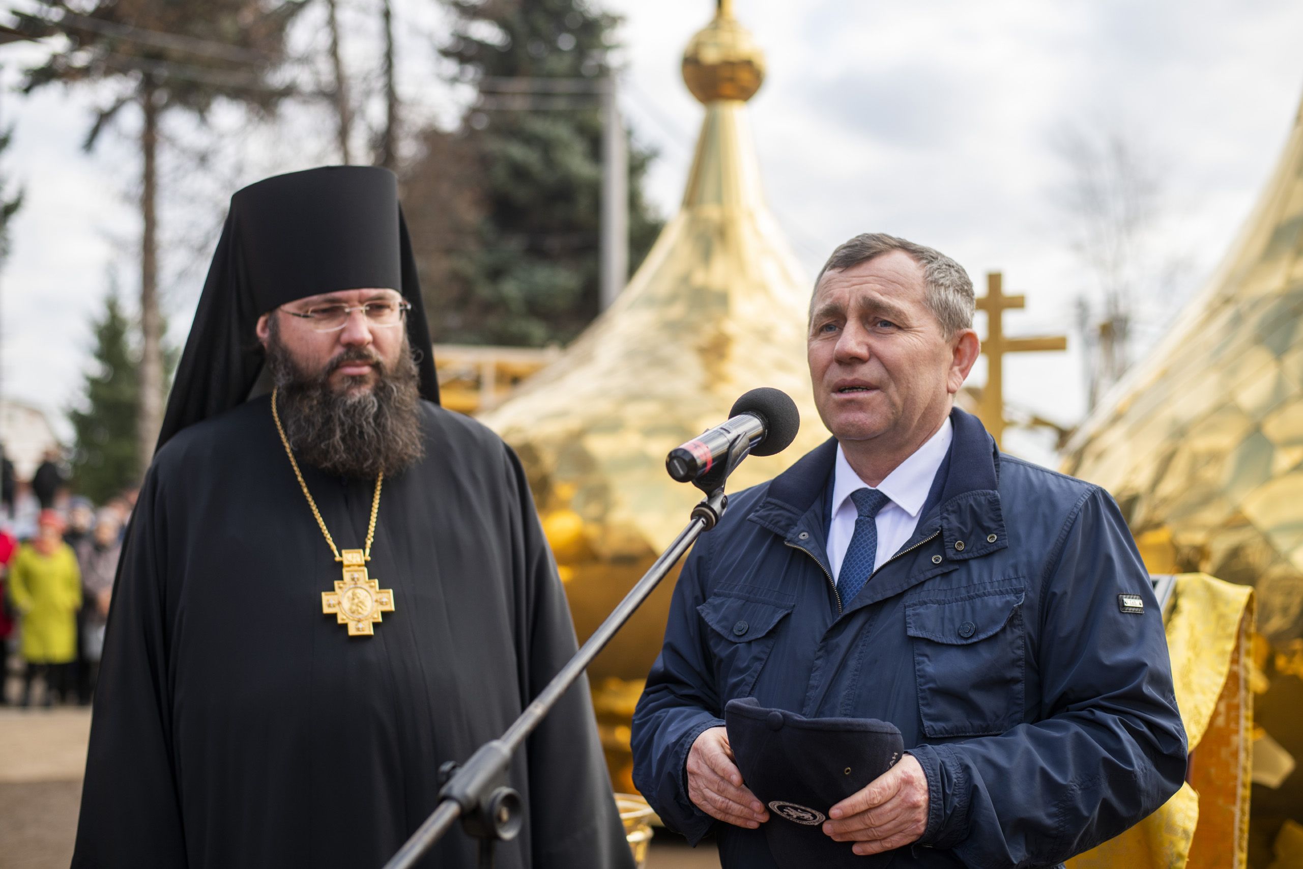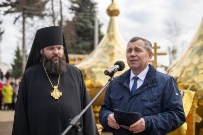 А. Иванов отметил, что инициатором строительства храма является митрополит Феофан и реализуется при его непосредственном участии. Он выразил благодарность главе митрополии за возрождение святыни, а также поблагодарил строителей, меценатов и всех прихожан.