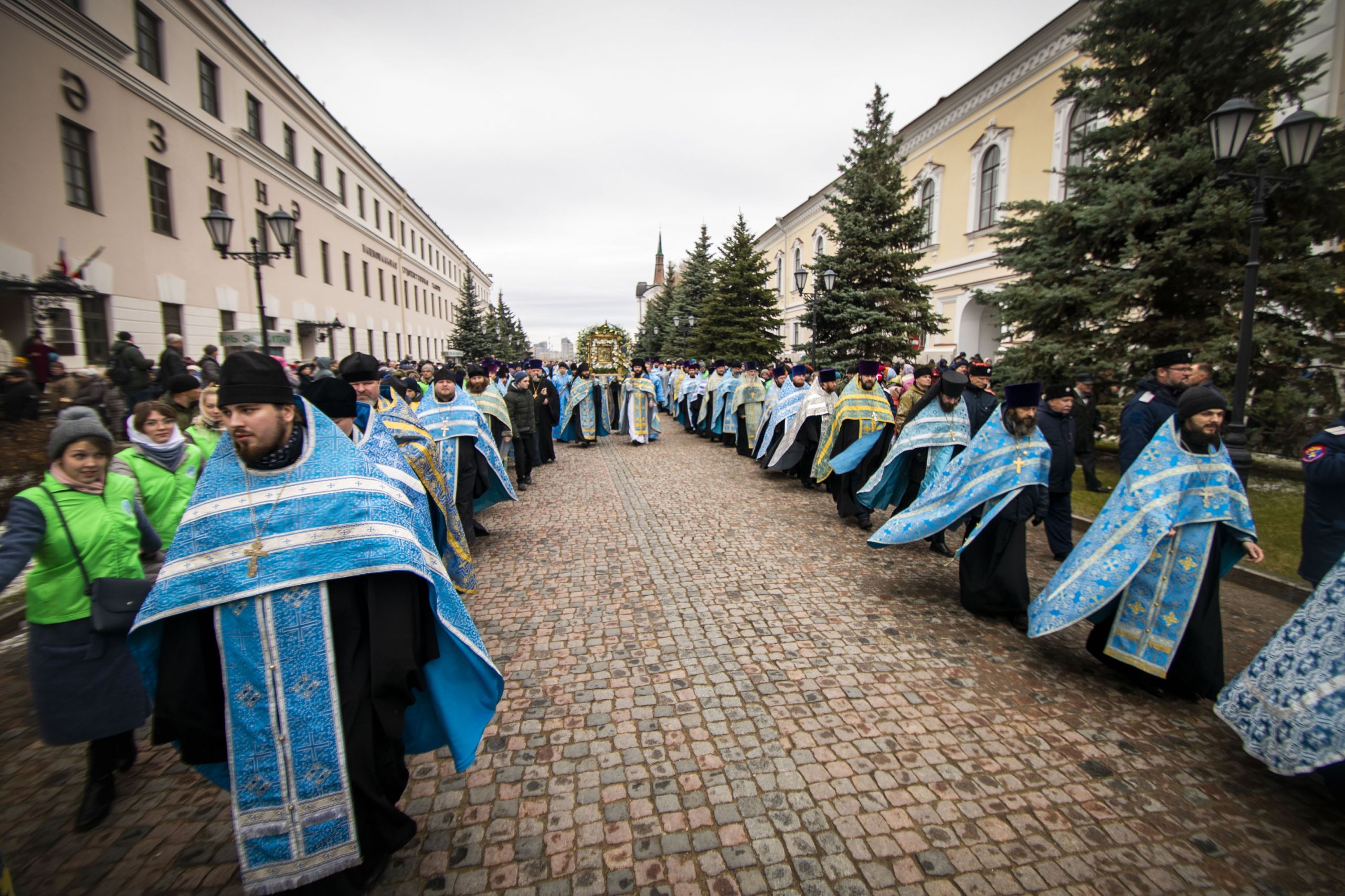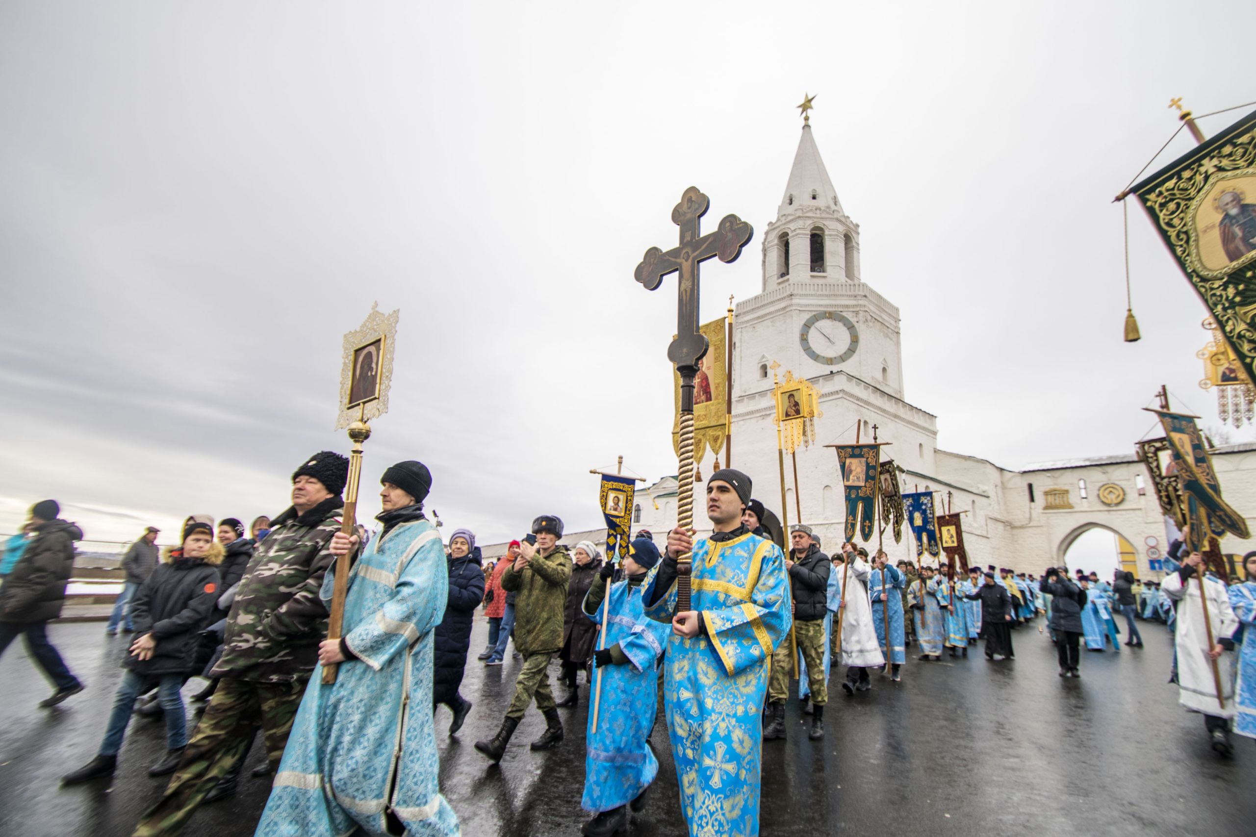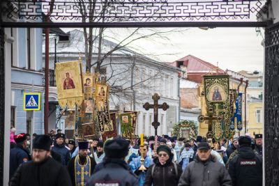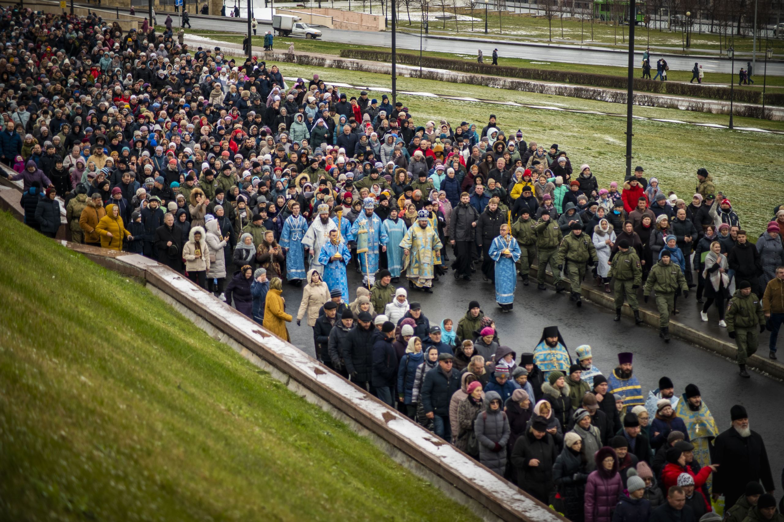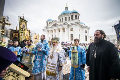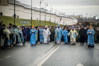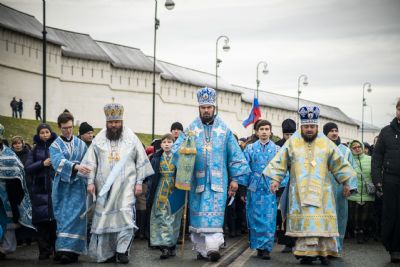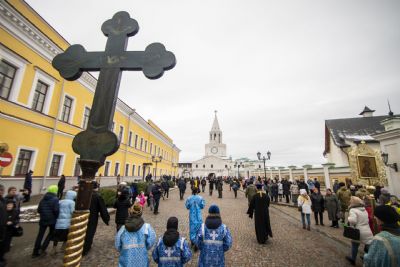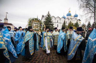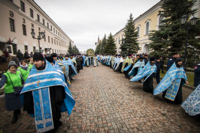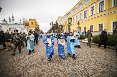 По окончании Литургии архипастыри и верующие прошли от собора крестным ходом с почитаемым списком Казанской иконы Богородицы. Молитвенное шествие проследовало до Казанско-Богородицкого мужского монастыря — места обретения честного образа Богоматери. Крестный ход сопровождался колокольным звоном храмов, расположенных в центре города, и молитвенными песнопениями в честь Приснодевы.