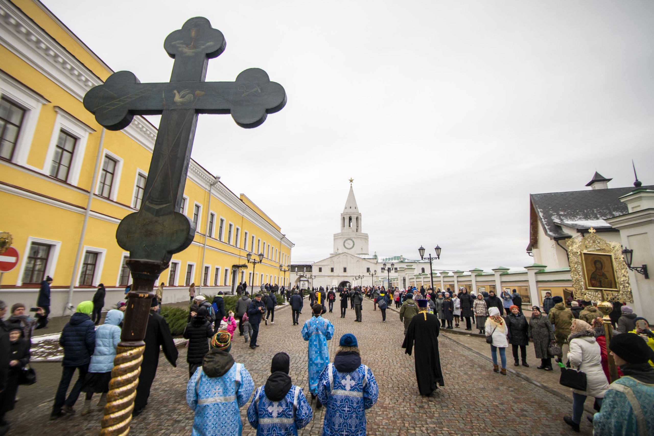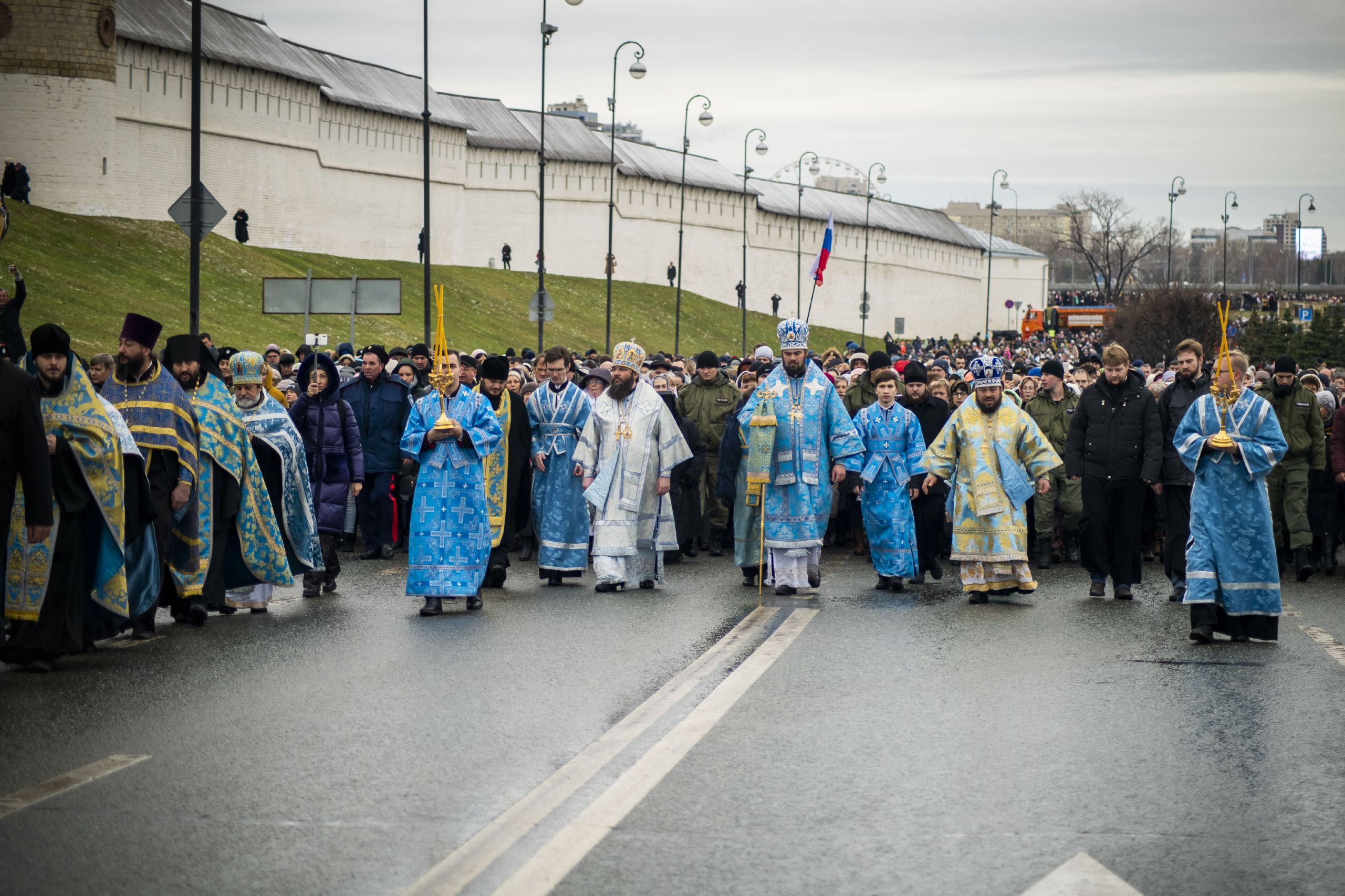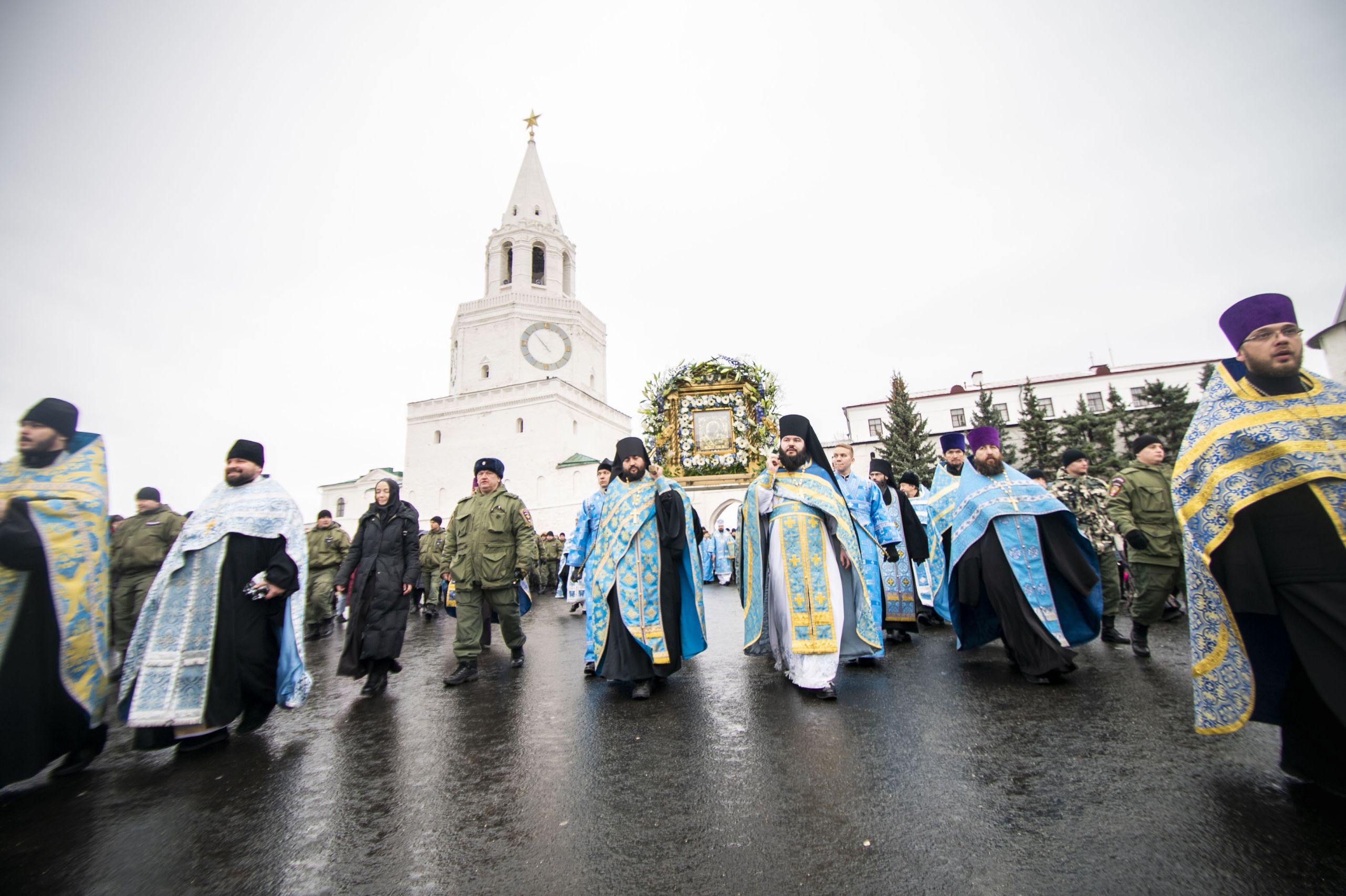 По окончании Литургии архипастыри и верующие прошли от собора крестным ходом с почитаемым списком Казанской иконы Богородицы. Молитвенное шествие проследовало до Казанско-Богородицкого мужского монастыря — места обретения честного образа Богоматери. Крестный ход сопровождался колокольным звоном храмов, расположенных в центре города, и молитвенными песнопениями в честь Приснодевы.