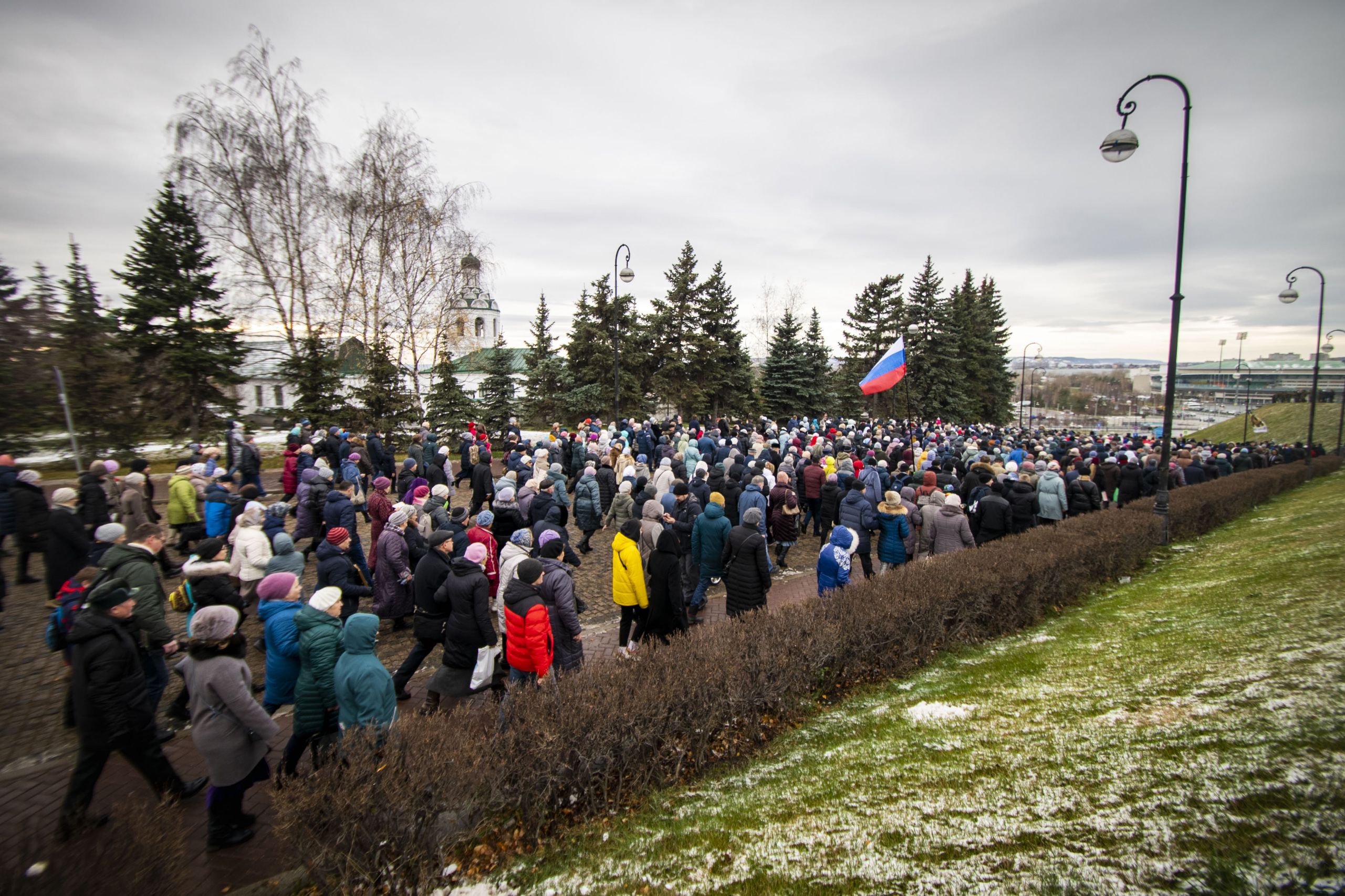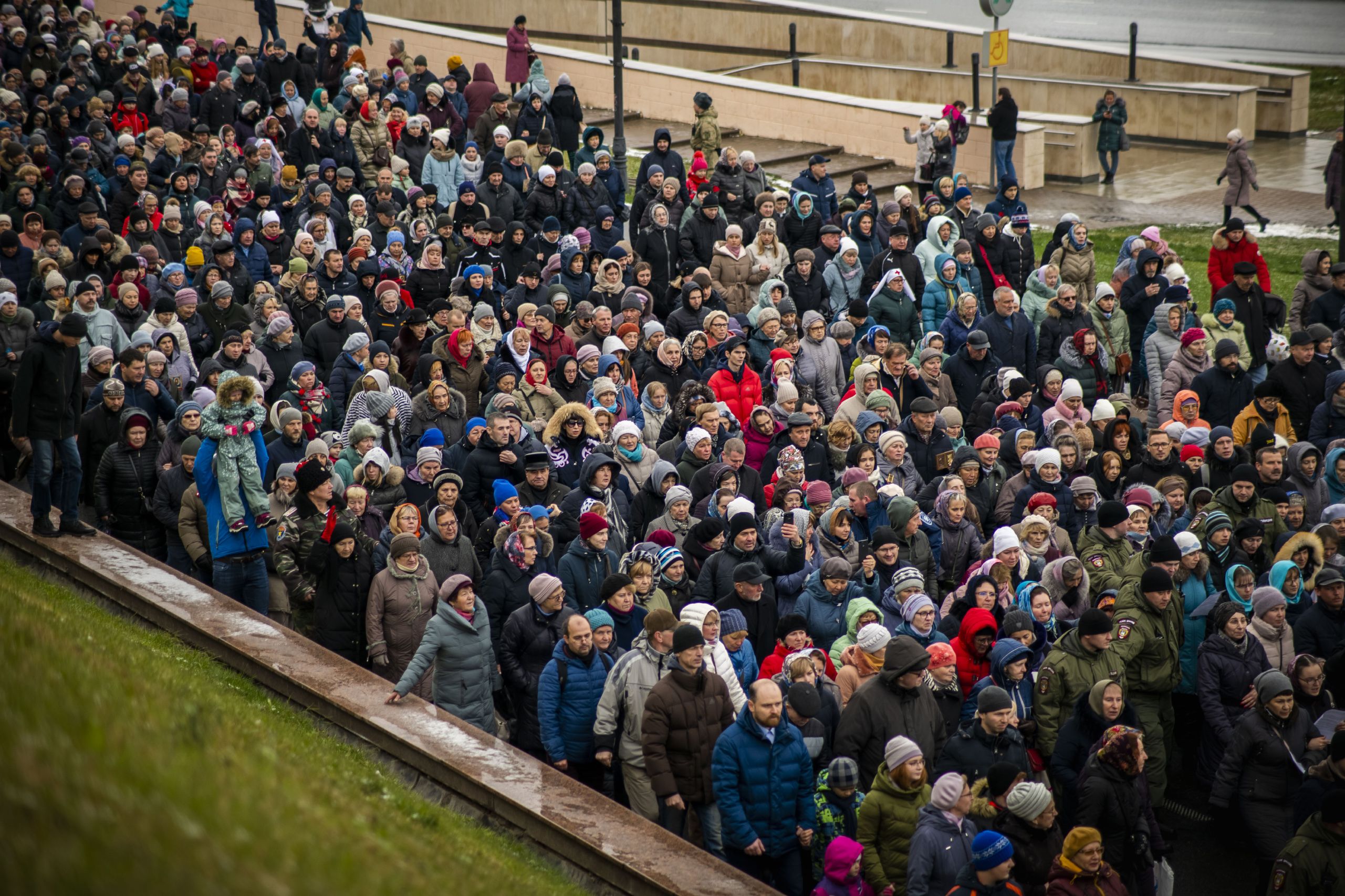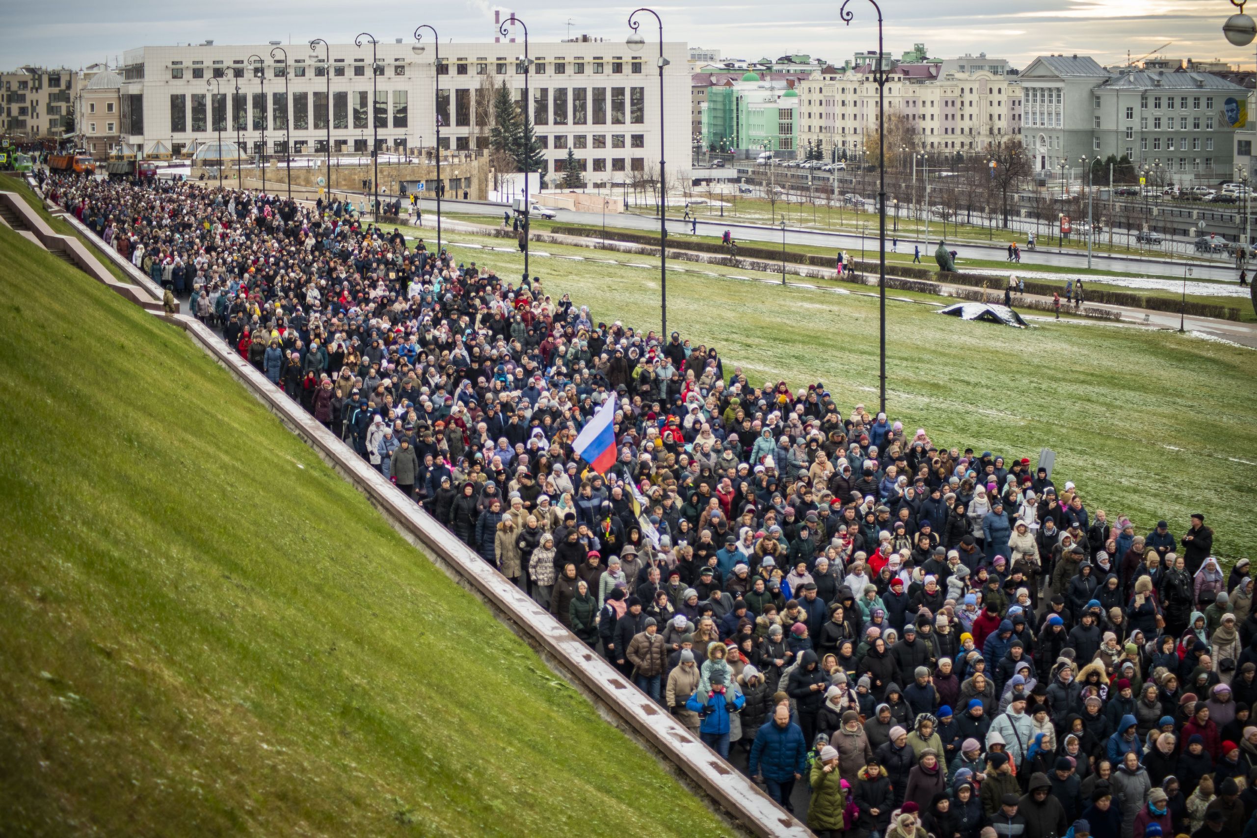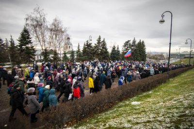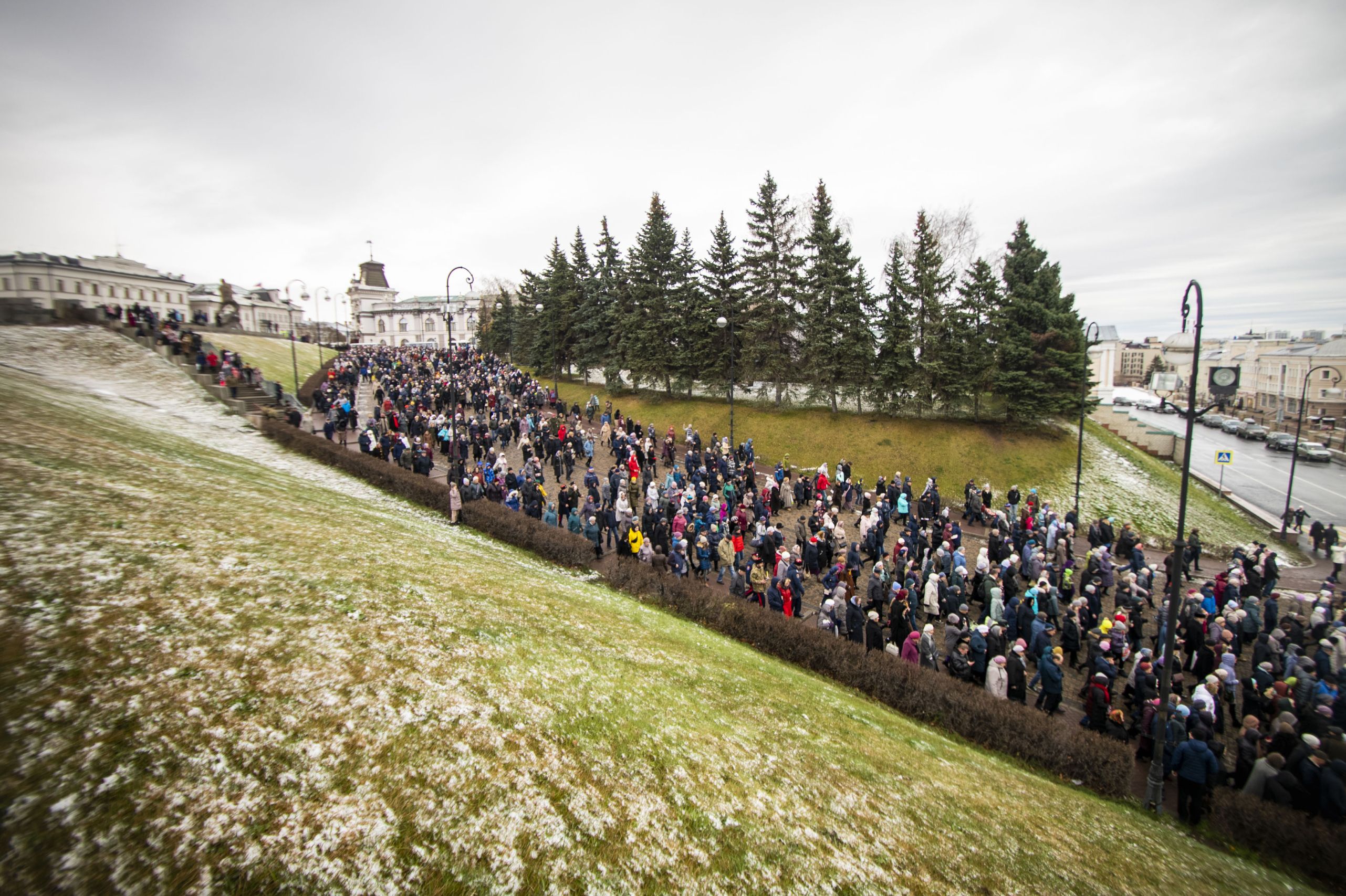По окончании Литургии архипастыри и верующие прошли от собора крестным ходом с почитаемым списком Казанской иконы Богородицы. Молитвенное шествие проследовало до Казанско-Богородицкого мужского монастыря — места обретения честного образа Богоматери. Крестный ход сопровождался колокольным звоном храмов, расположенных в центре города, и молитвенными песнопениями в честь Приснодевы.