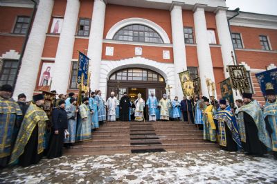 По прибытии в Богородицкий монастырь у стен воссоздаваемого собора Казанской иконы Божией Матери было совершен праздничный молебен Пресвятой Богородице. Перед началом молебного пения глава Татарстанской митрополии обратился к собравшимся со словом проповеди.