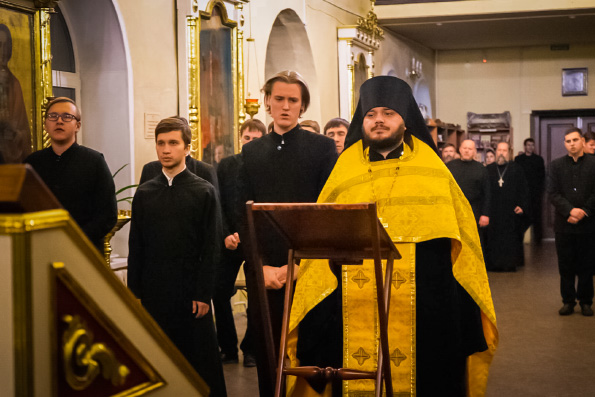 По случаю знаменательного события накануне вечером в храме духовной семинарии состоялся соборный молебен праведному Иоанну Кронштадтскому. Богослужение возглавил иеромонах Кирилл (Забавнов).