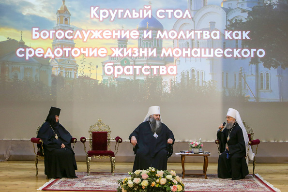 Далее участники встречи обсудили особенности монастырского богослужения, его практические аспекты. Сообщения на эту тему представили настоятель нижегородского Благовещенского монастыря архимандрит Александр (Лукин) («Современные практики совершения суточного богослужебного круга и литургии») и насельник нижегородского Вознесенского Печерского монастыря игумен Вассиан (Бирагов) («Значение келейного правила для духовного делания, подготавливающего к участию в богослужении и как части богослужебного круга»).