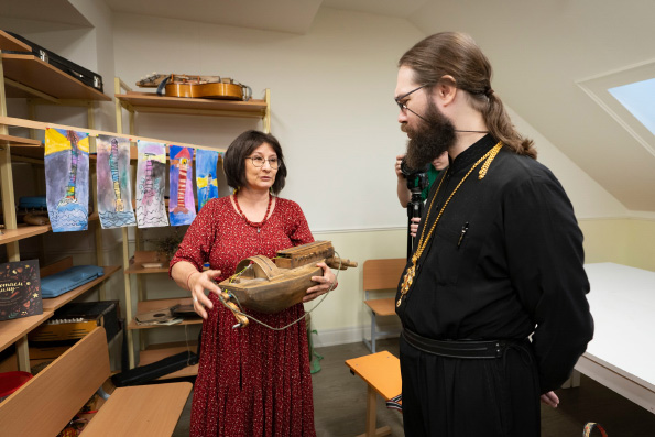 После этого владыка Савва посетил занятие в приходской фольклорной студии «Духов день». Руководитель коллектива Луиза Леонтьева продемонстрировала владыке старинные музыкальные инструменты и ткацкие станки, хранящиеся в этнографическом музее гимназии.