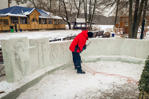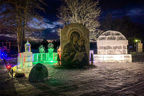 Около панно с образом Богородицы в скором времени появится надпись «С Рождеством Христовым!». Чуть дальше будут возведены две ледяные часовни с большими иконописными изображениями «Рождество Христово» и «Крещение Господне».