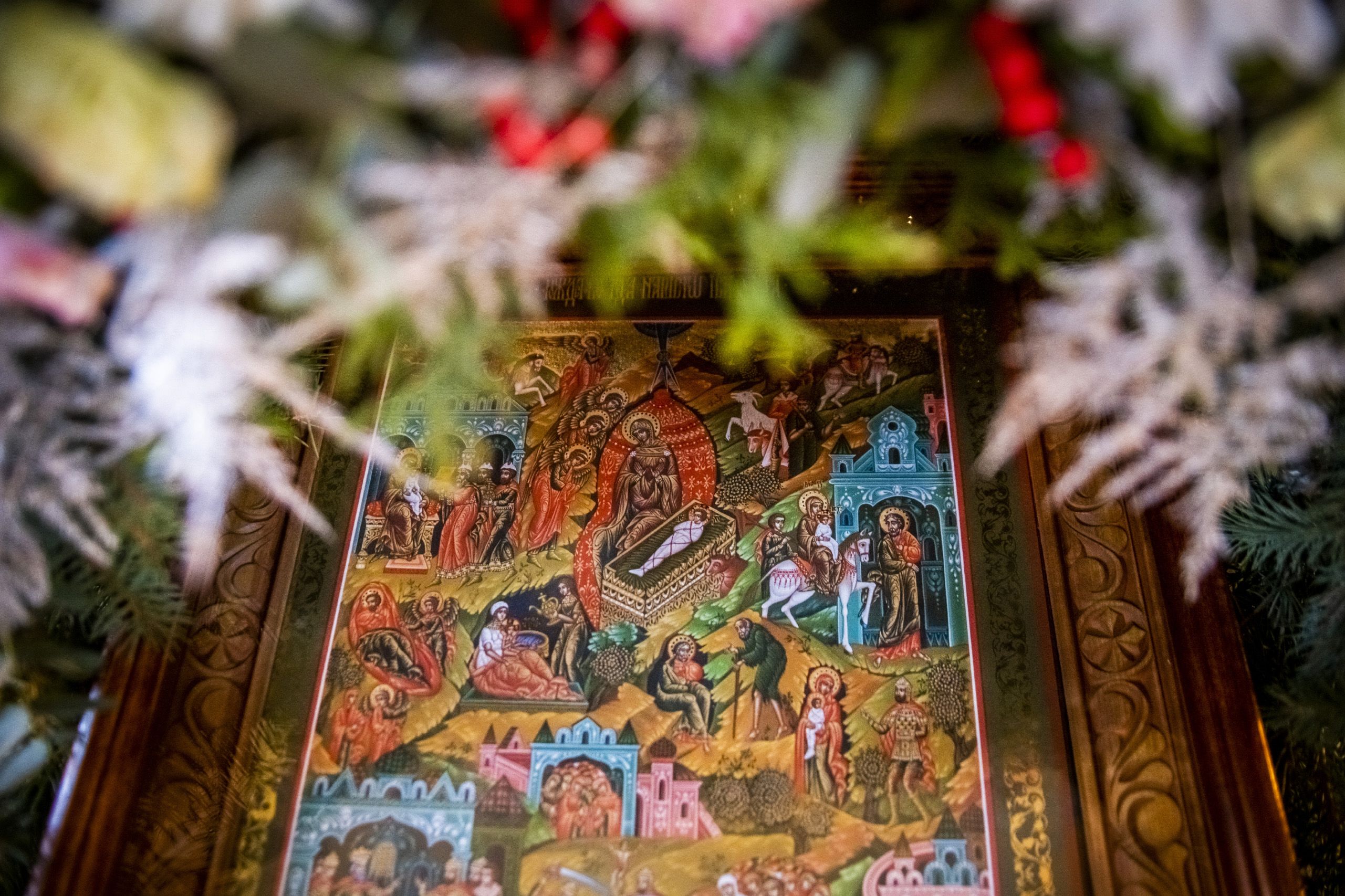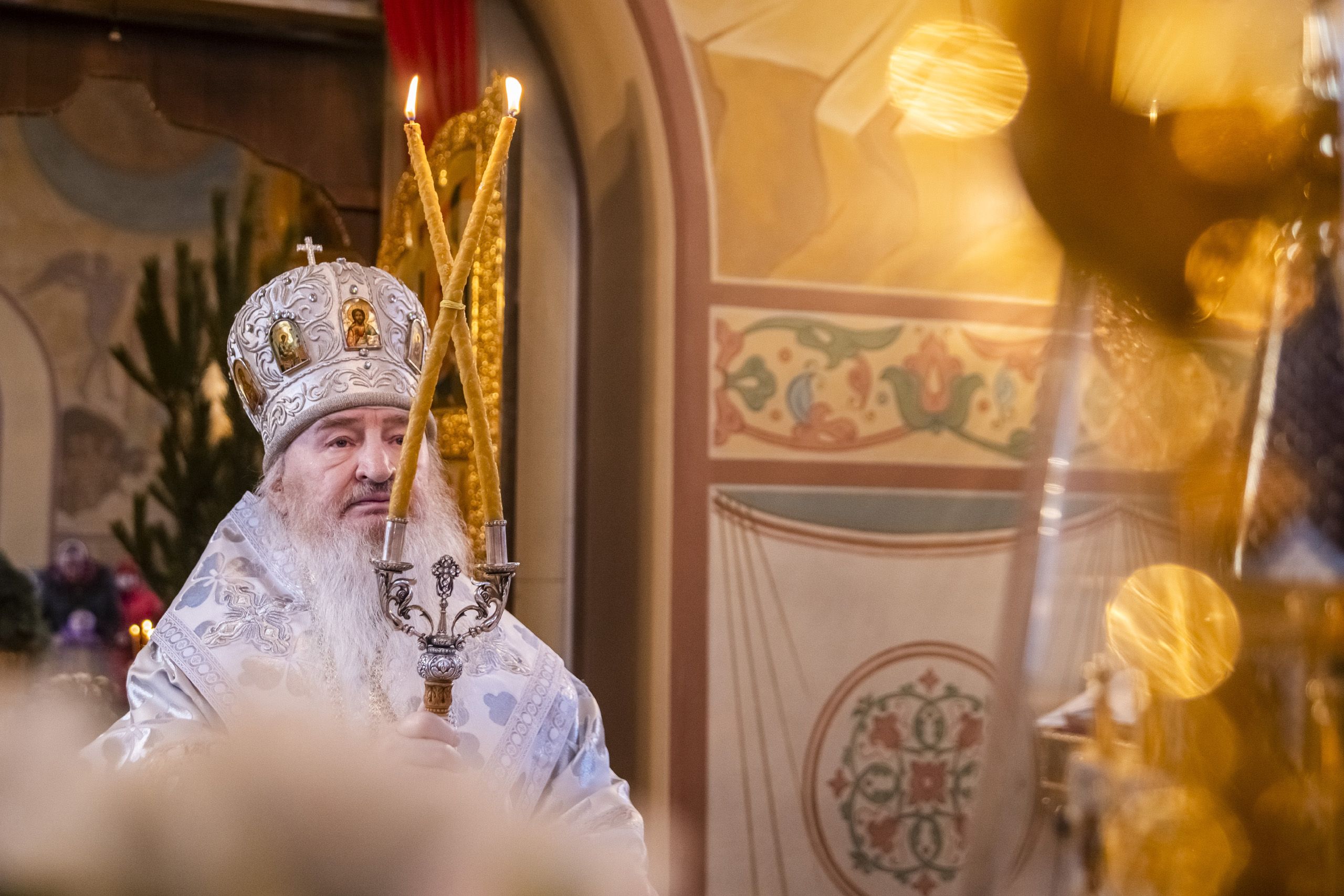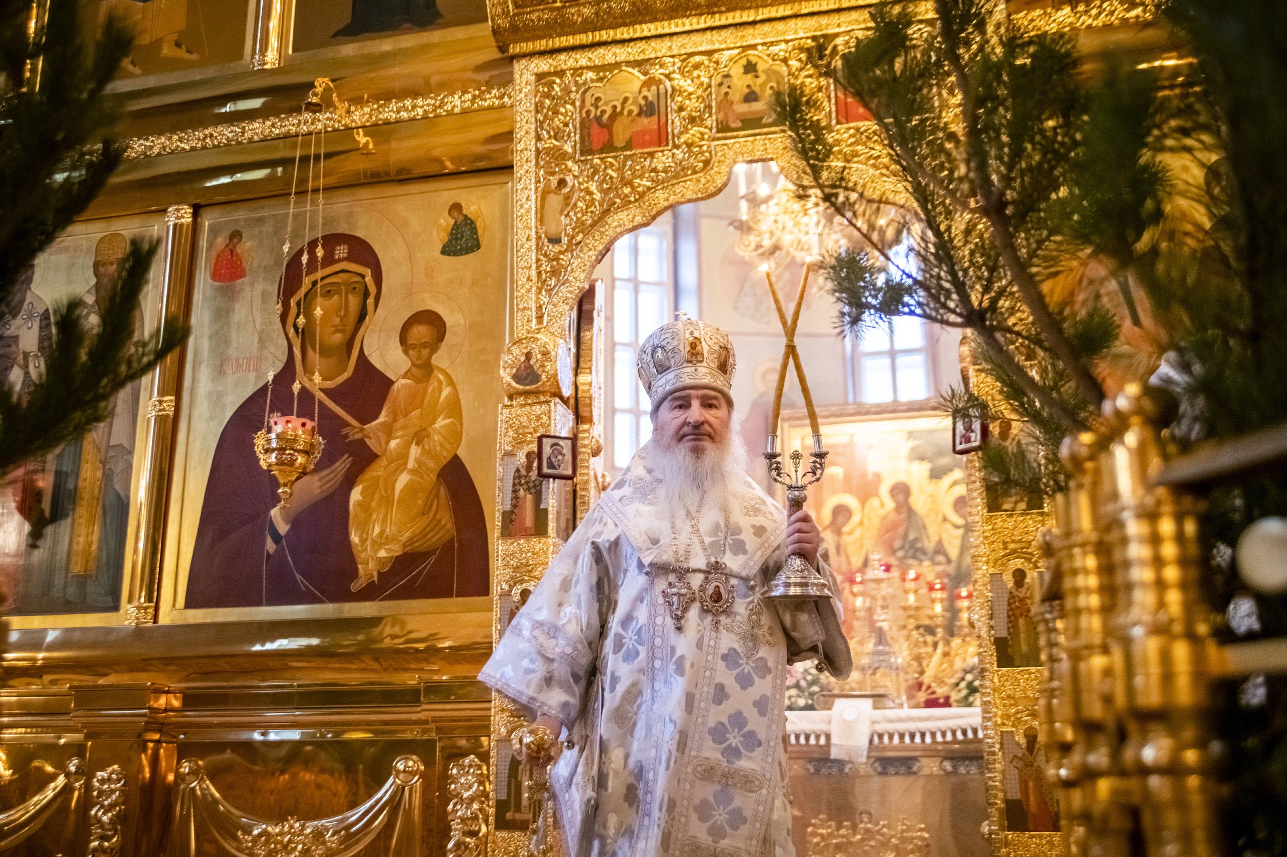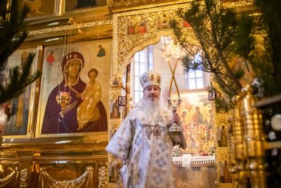 По отпусте Литургии из алтаря на середину храма архипастырь вынес икону Рождества Христова. Священнослужители пропели тропарь праздника «Рождество Твое, Христе Боже наш…» и кондак праздника «Дева днесь Пресущественнаго раждает…»