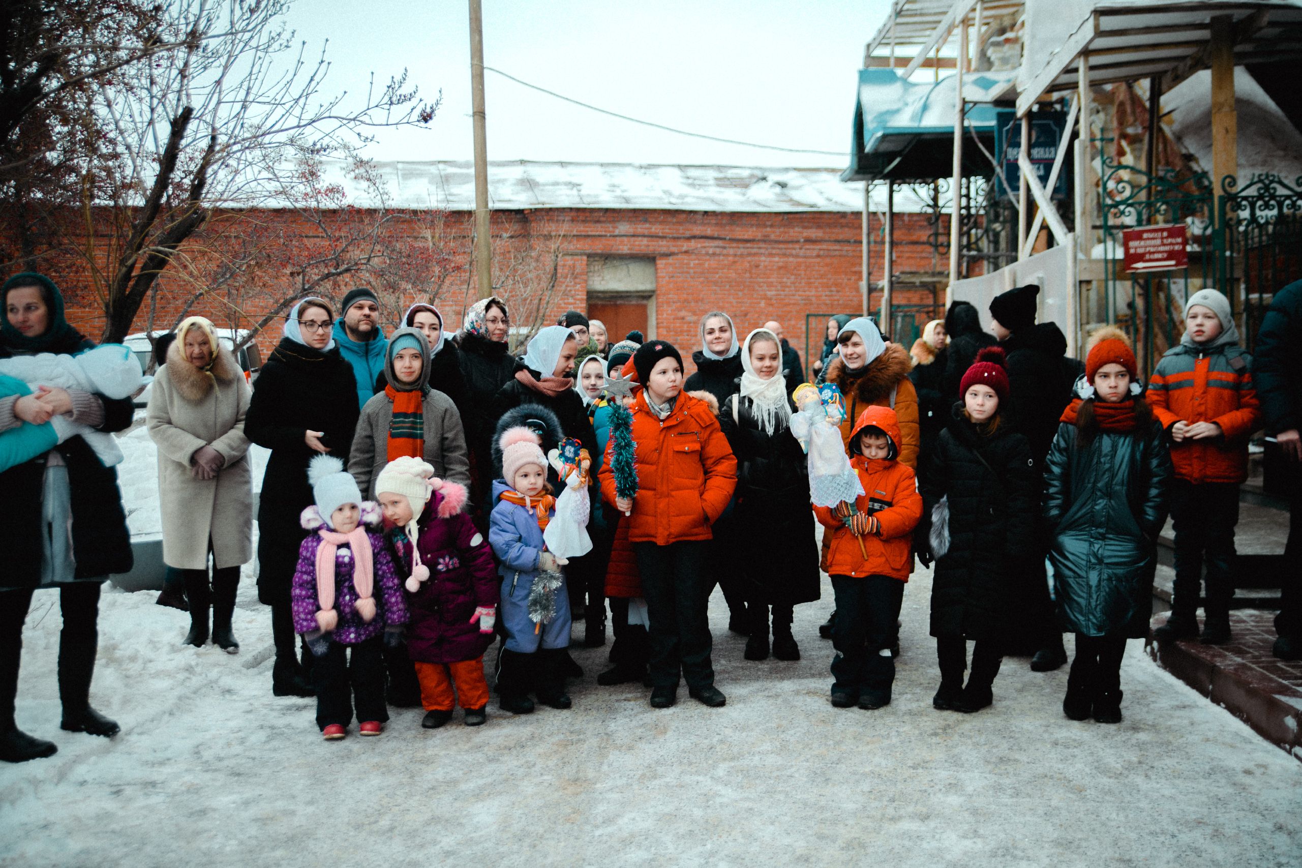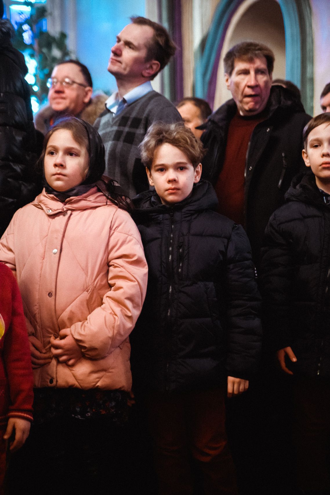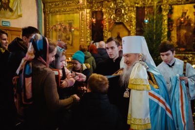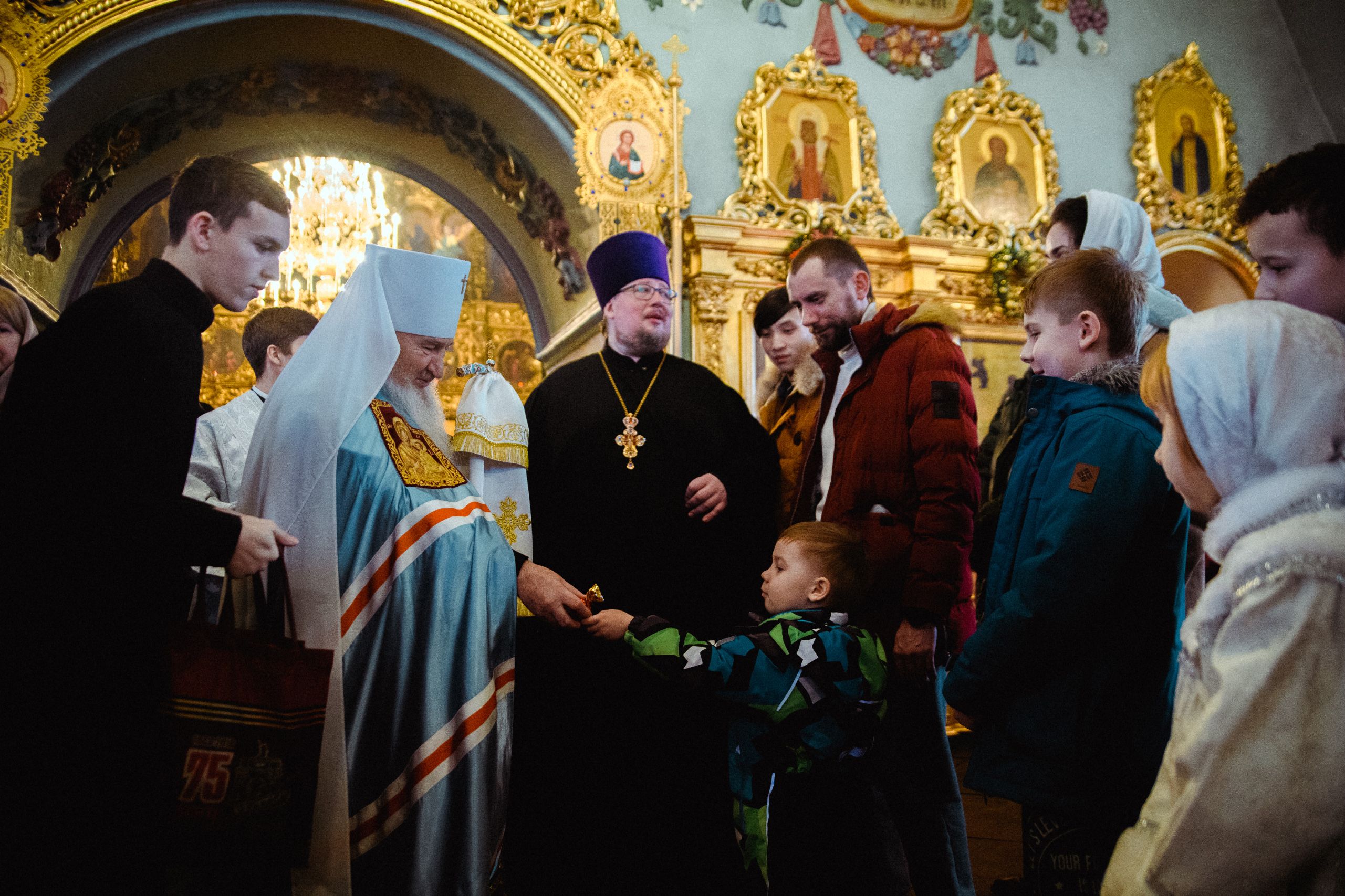 Перед входом в храм правящего архиерея приветствовали учащиеся приходской воскресной школы. Дети исполнили стихотворения и Рождественскую колядку.
