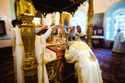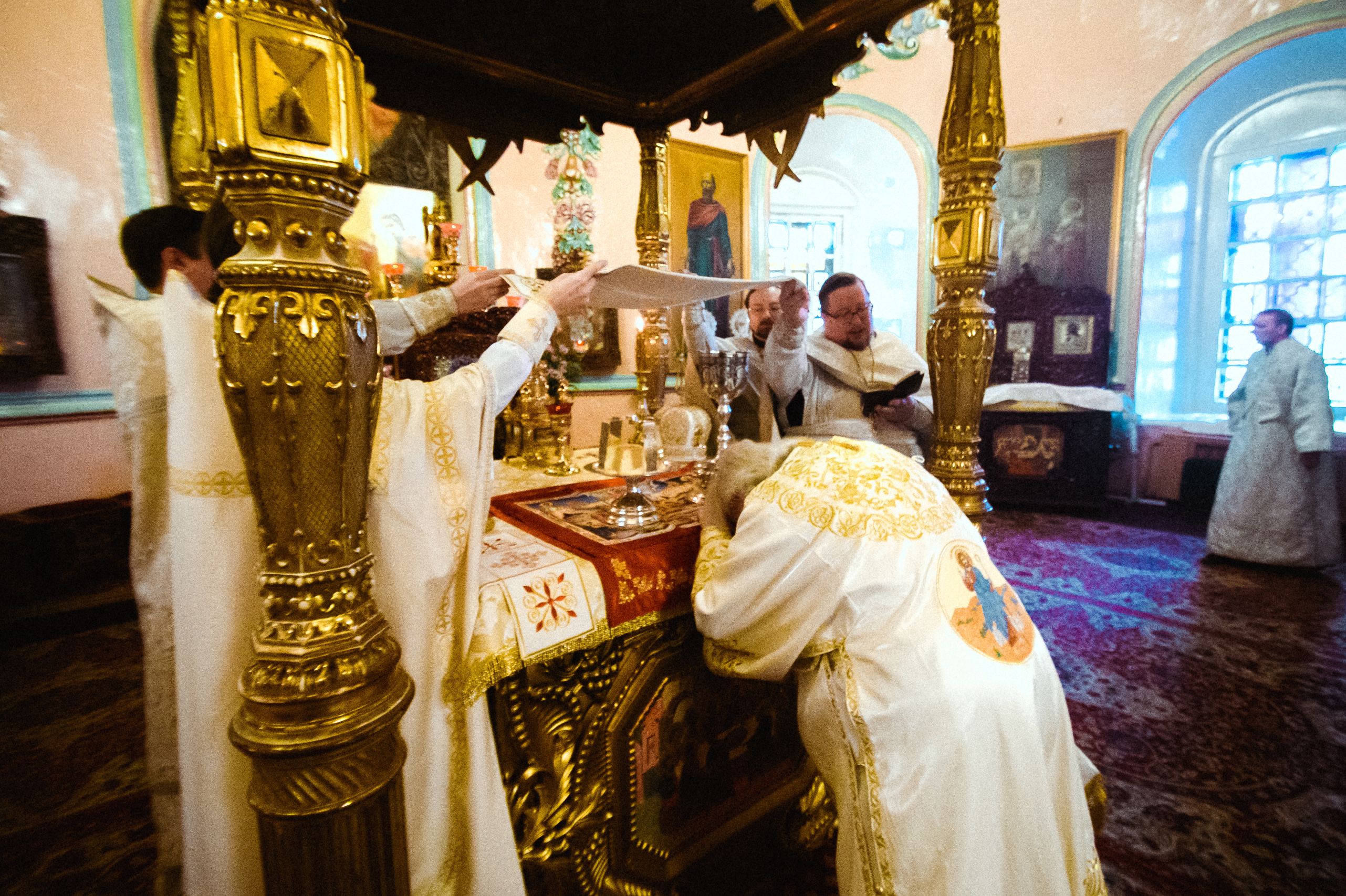 За Литургией Его Высокопреосвященству сослужили настоятель собора первоверховных апостолов Петра и Павла протоиерей Сергий Титов, настоятель Введенского Кизического мужского монастыря города Казани игумен Пимен (Ивентьев), клирики храма иерей Антоний Ермошин и иерей Алексий Каст.