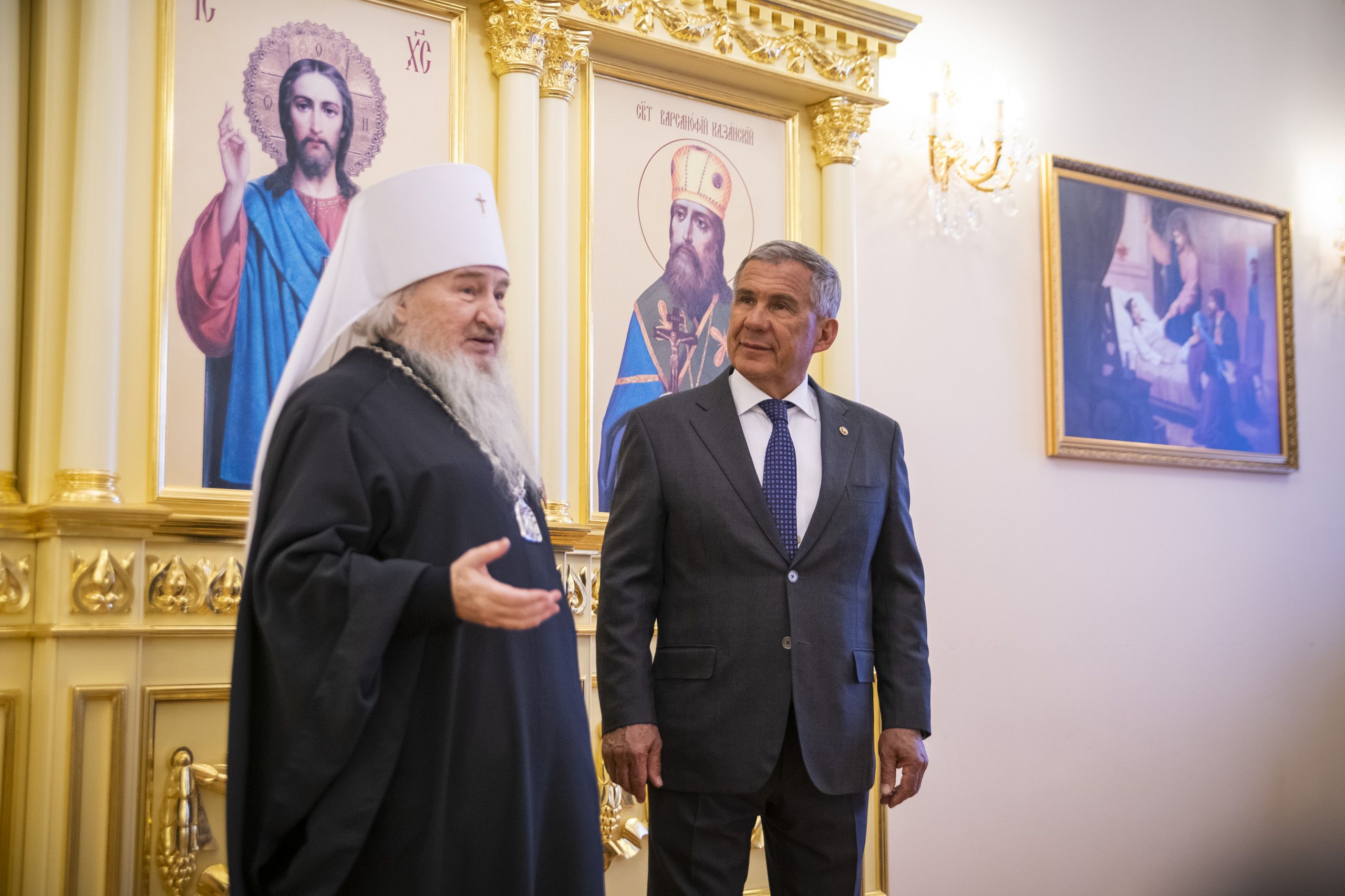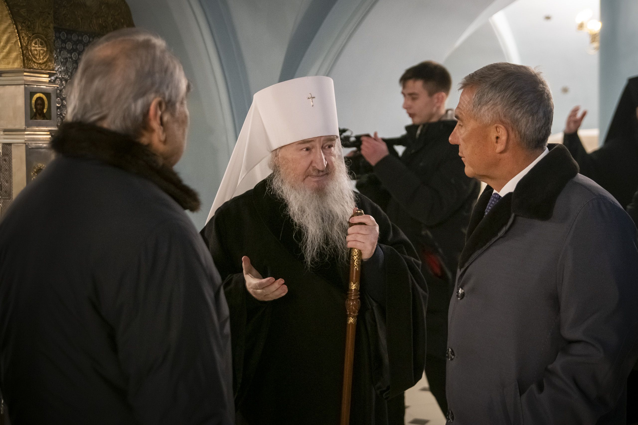 Затем в трапезной Крестовоздвиженского храма состоялась беседа Президента Республики Татарстан с архиереями Татарстанской митрополии.