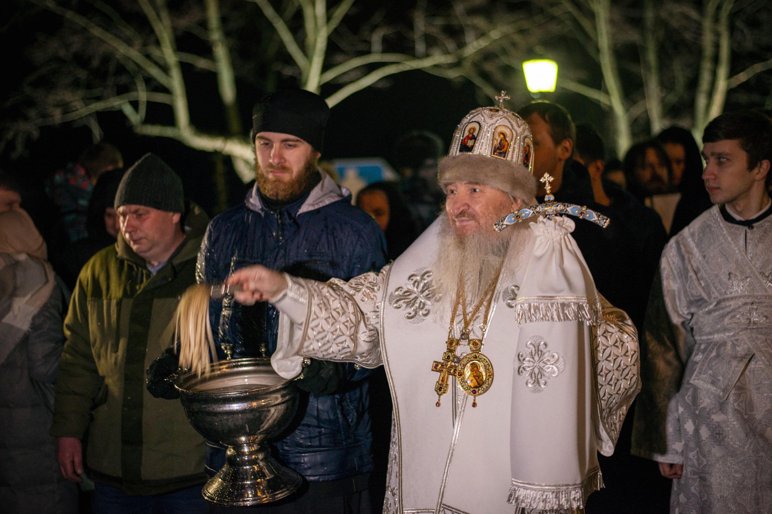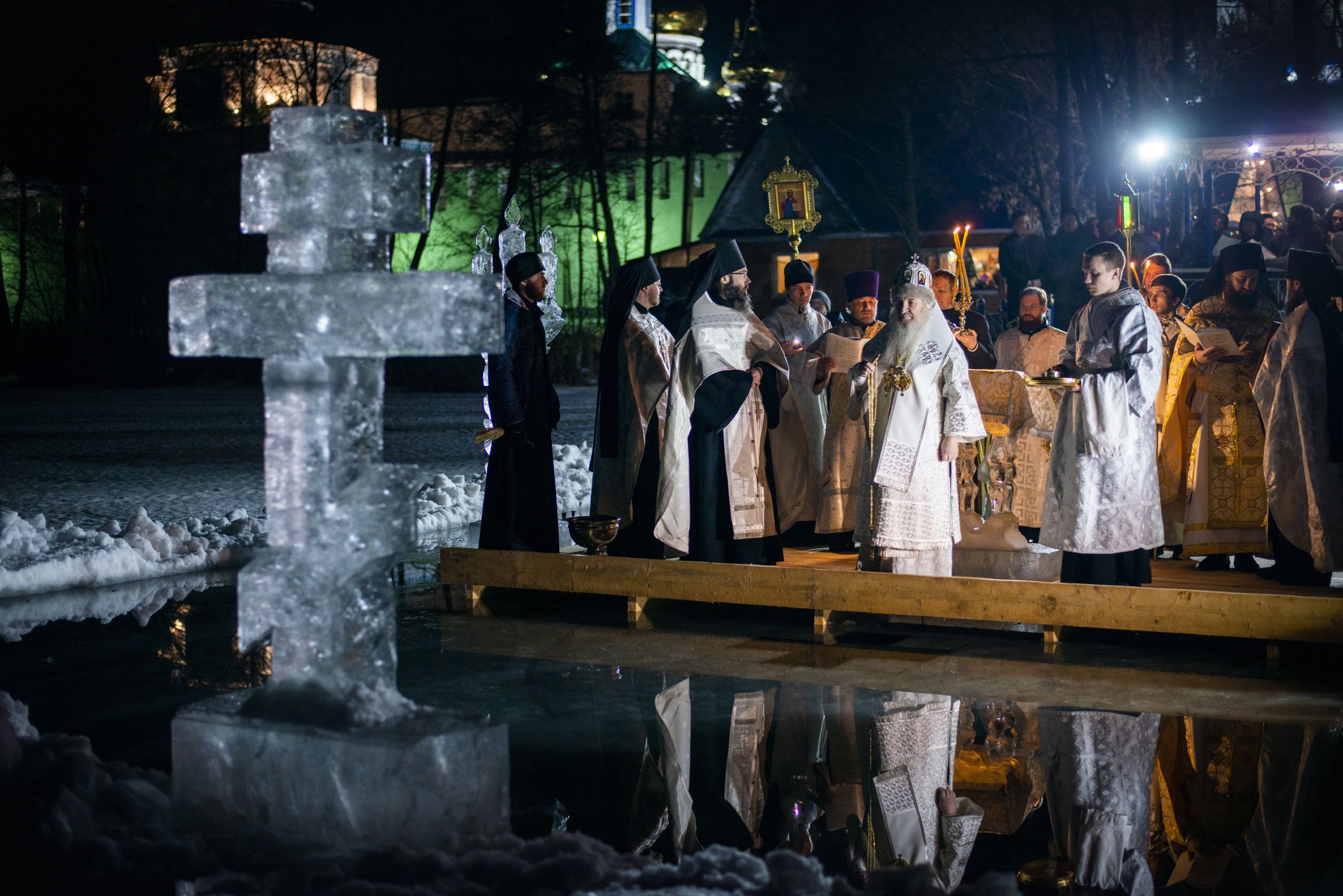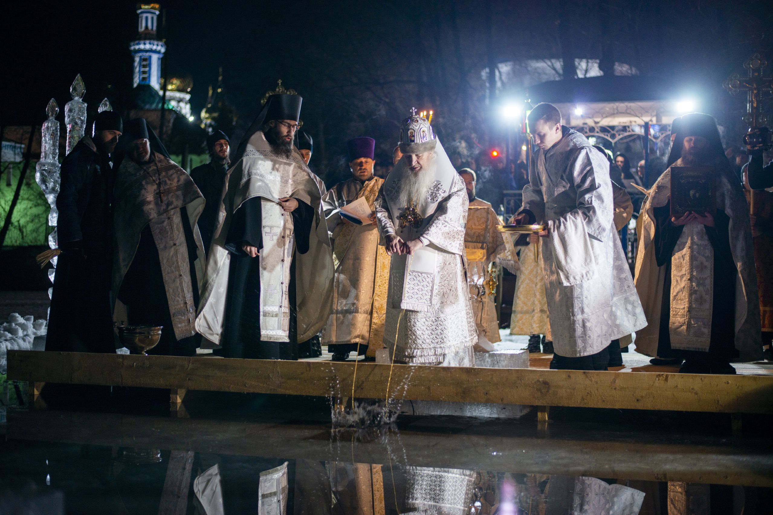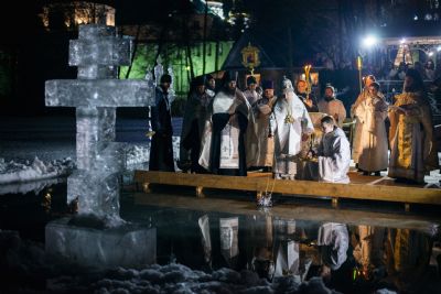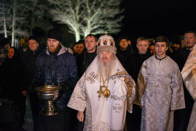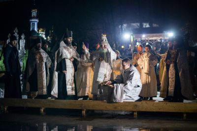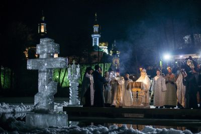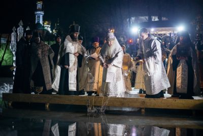 По заамвонной молитве правящий архиерей, духовенство и миряне прошли крестным ходом от Троицкого собора до иордани на Раифском озере. Здесь Его Высокопреосвященство совершил чин великого освящения воды. На обратном пути в храм владыка Феофан окропил верующих агиасмой.