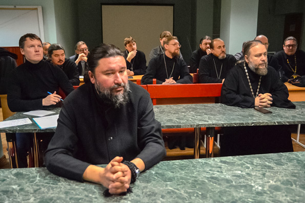 Помощник благочинного по религиозному образованию и катехизации иерей Георгий Опарин довел до настоятелей информацию о деятельности воскресных школ и сообщил о том, что 16 февраля в 14:00 в библиотеке Вознесенского архиерейского подворья пройдет собрание директоров приходских учебных заведений.