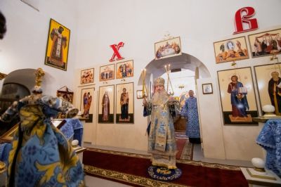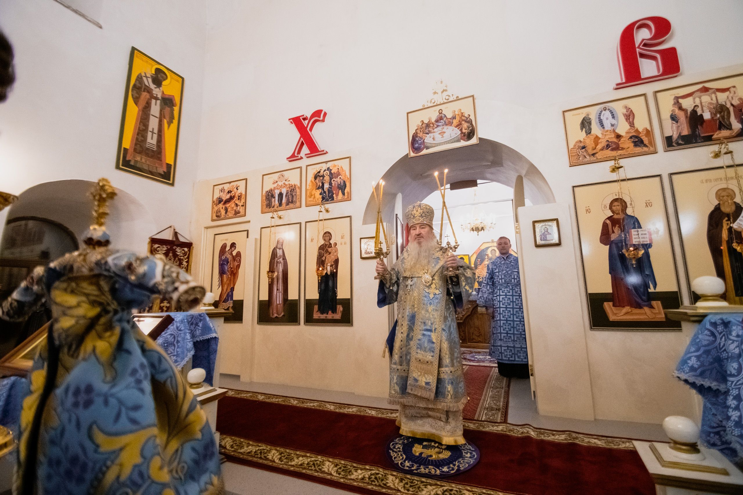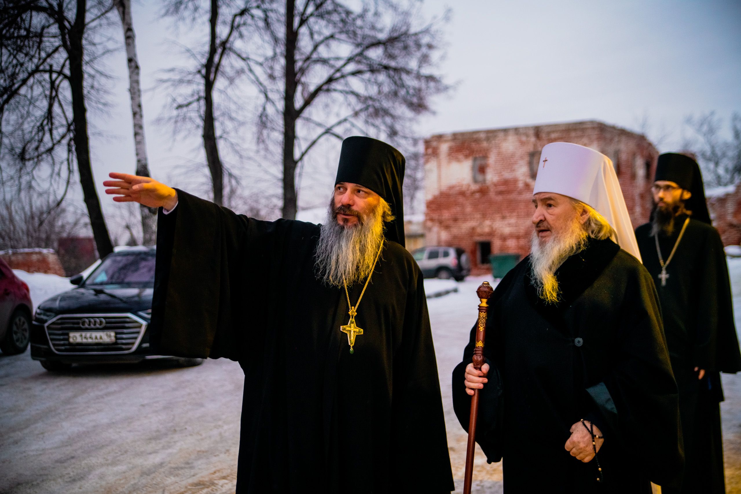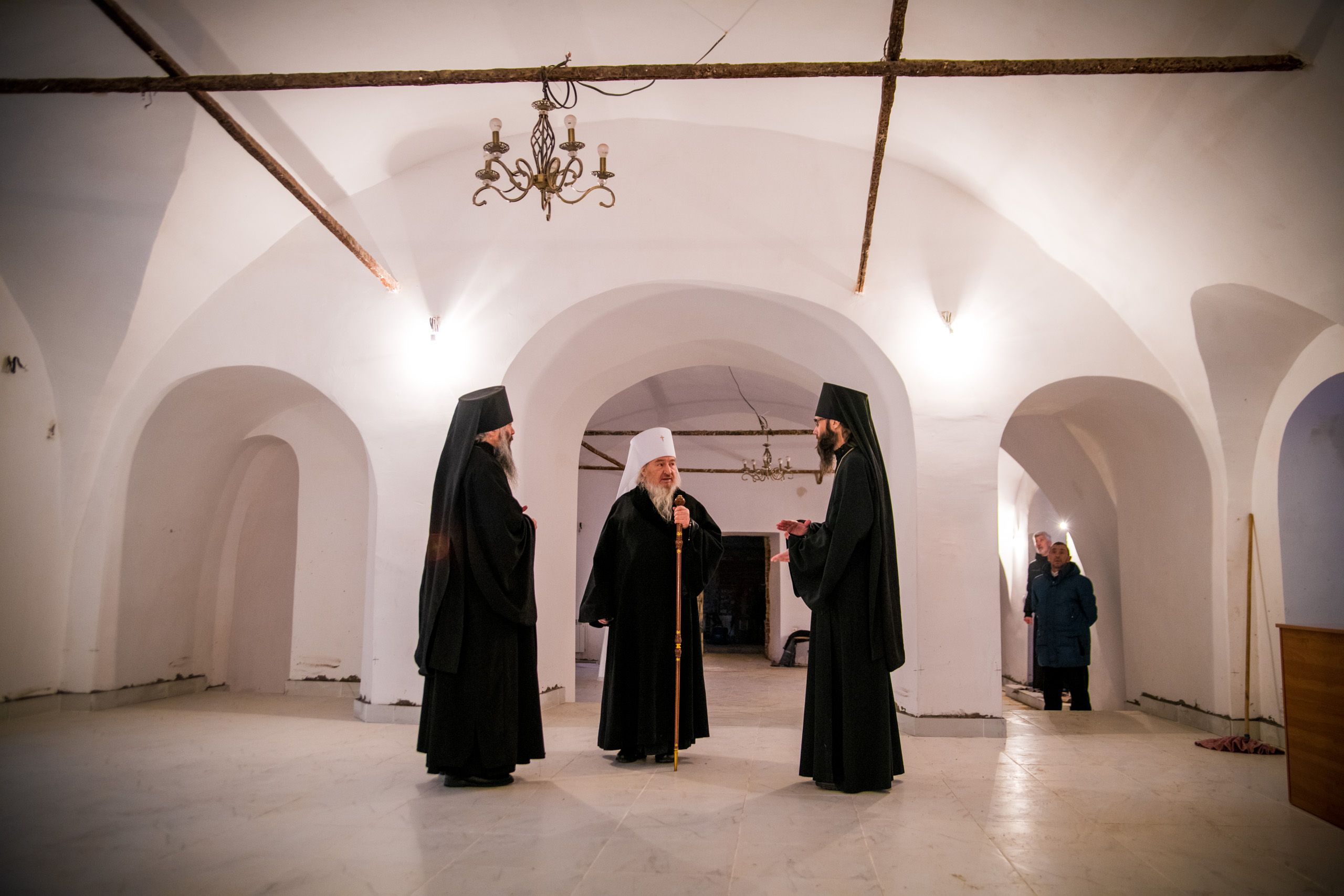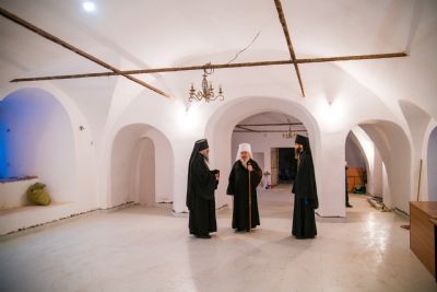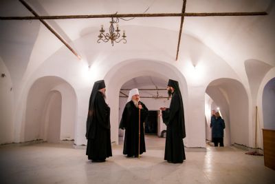 Перед началом богослужения правящий архиерей ознакомился с ходом реставрации нижнего храма Воскресенского собора в честь иконы Божией Матери «Знамение». В церкви были произведены работы по штукатурке стен и заливке нового пола.