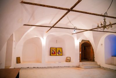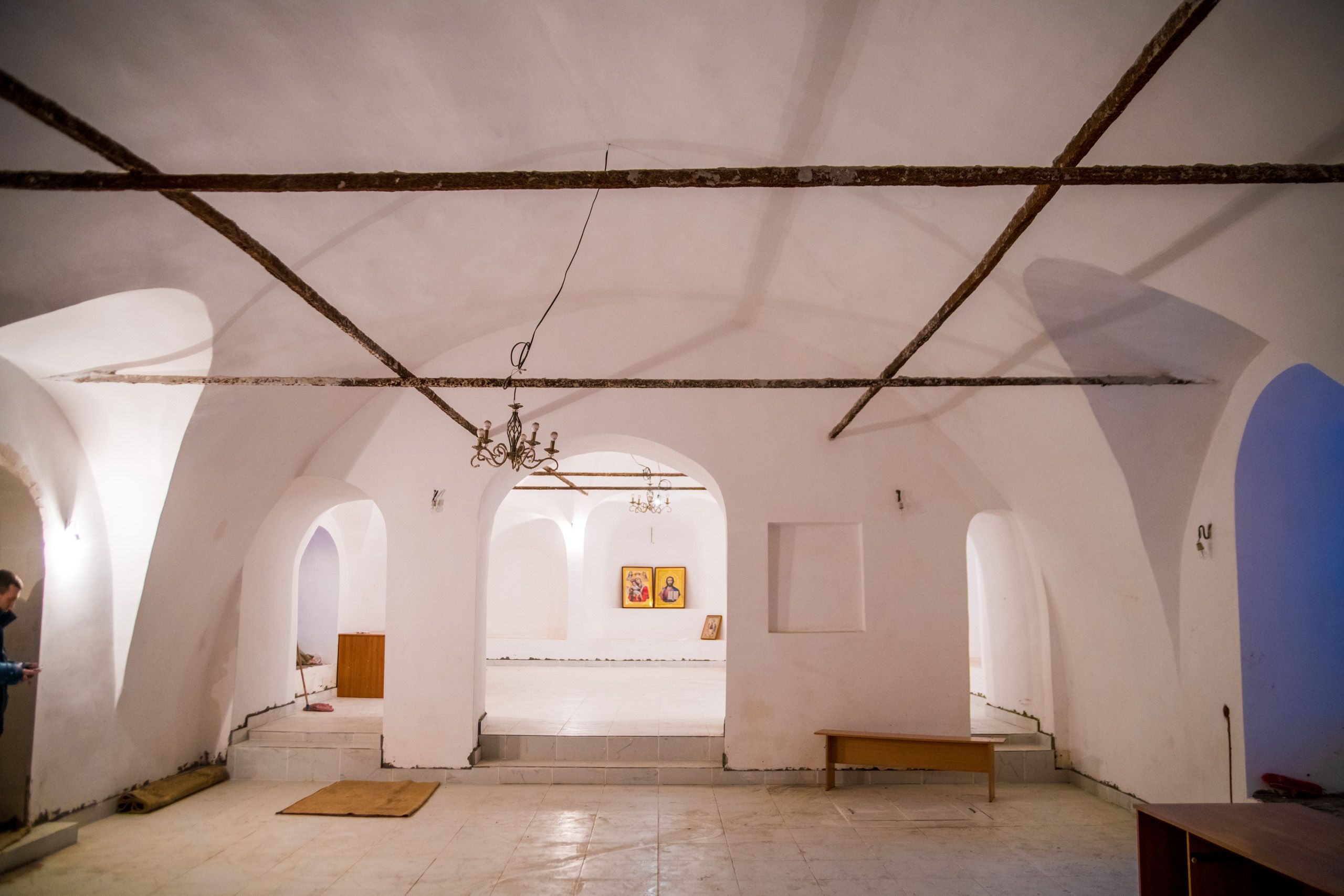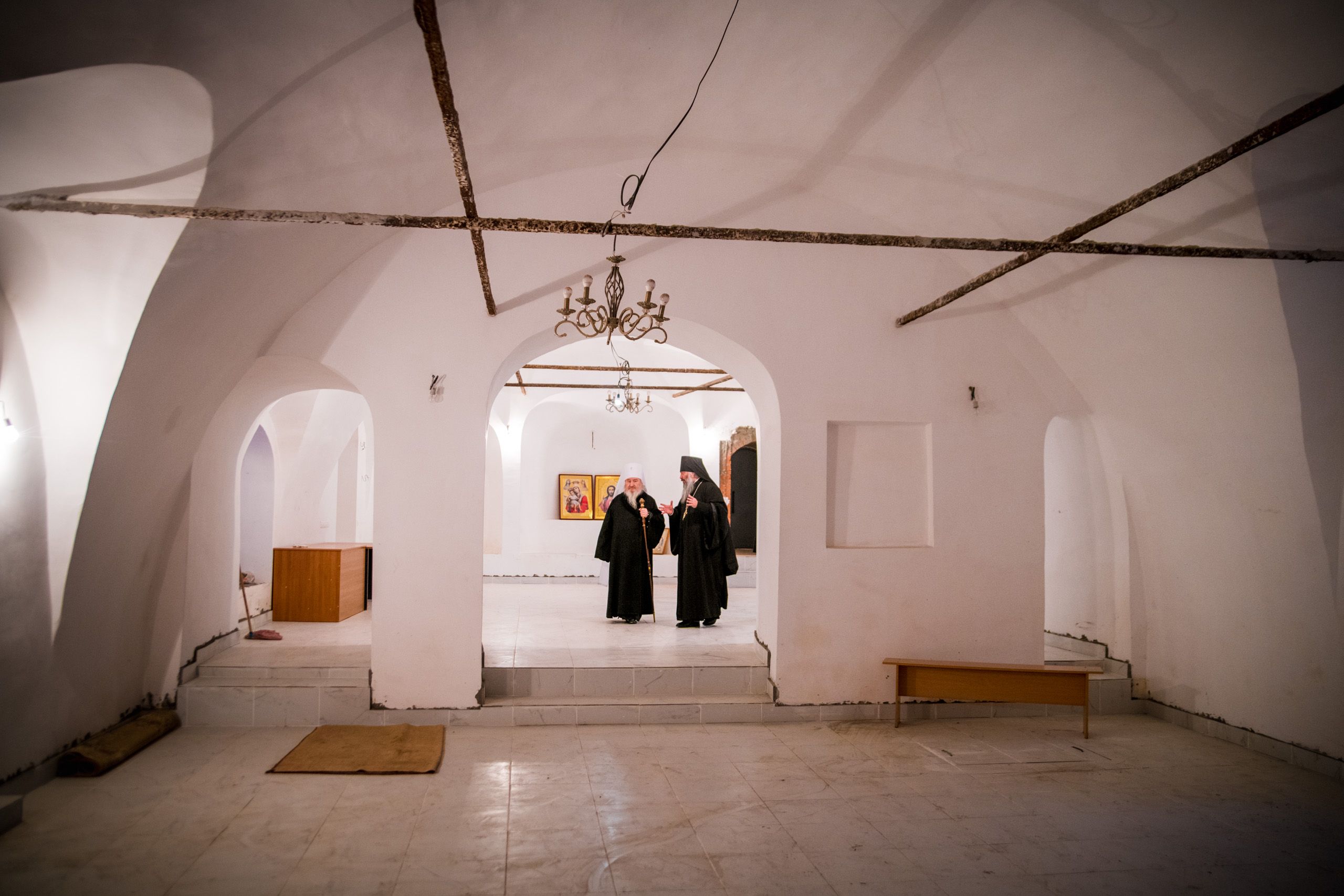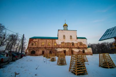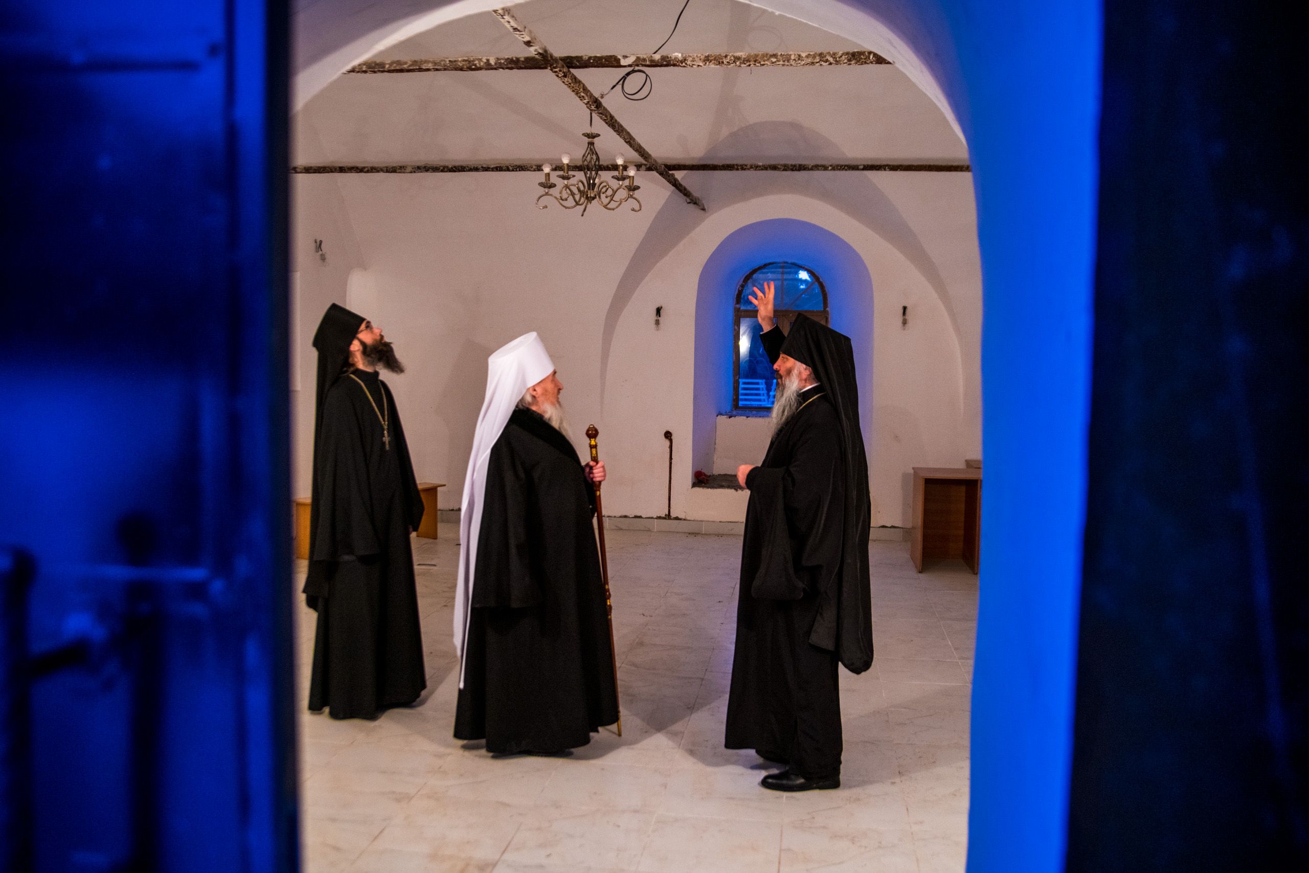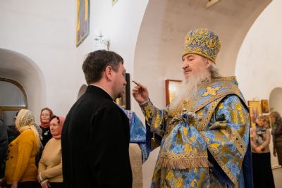 Перед началом богослужения правящий архиерей ознакомился с ходом реставрации нижнего храма Воскресенского собора в честь иконы Божией Матери «Знамение». В церкви были произведены работы по штукатурке стен и заливке нового пола.