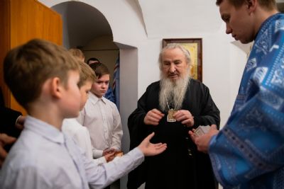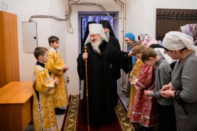 После чтения первого часа владыка Феофан поздравил верующих с праздником Сретения Господня и кануном воскресного дня. Глава Татарстанской митрополии поблагодарил отца Романа за труды по восстановлению комплекса бывшего монастыря и передал слова глубокой признательности содействующим строительству обители благодетелям.