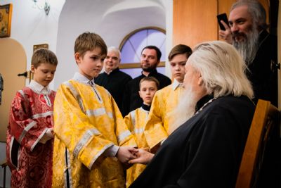 За вечерним богослужением Его Высокопреосвященству сослужили наместник подворья иеромонах Роман (Модин), настоятель Введенского Кизического мужского монастыря города Казани игумен Пимен (Ивентьев), клирик подворья иерей Максим Димаев.