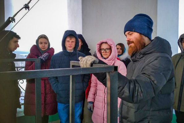 На колокольне отец Ярослав провел для гостей небольшой мастер-класс по колокольному звону.