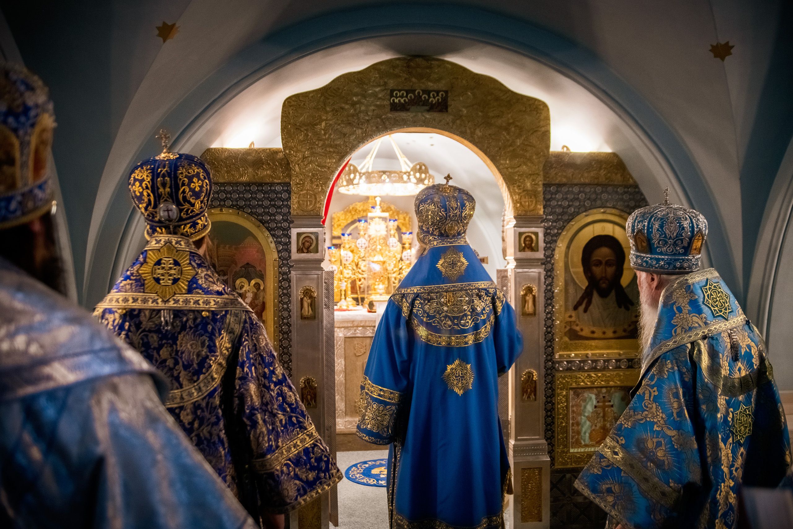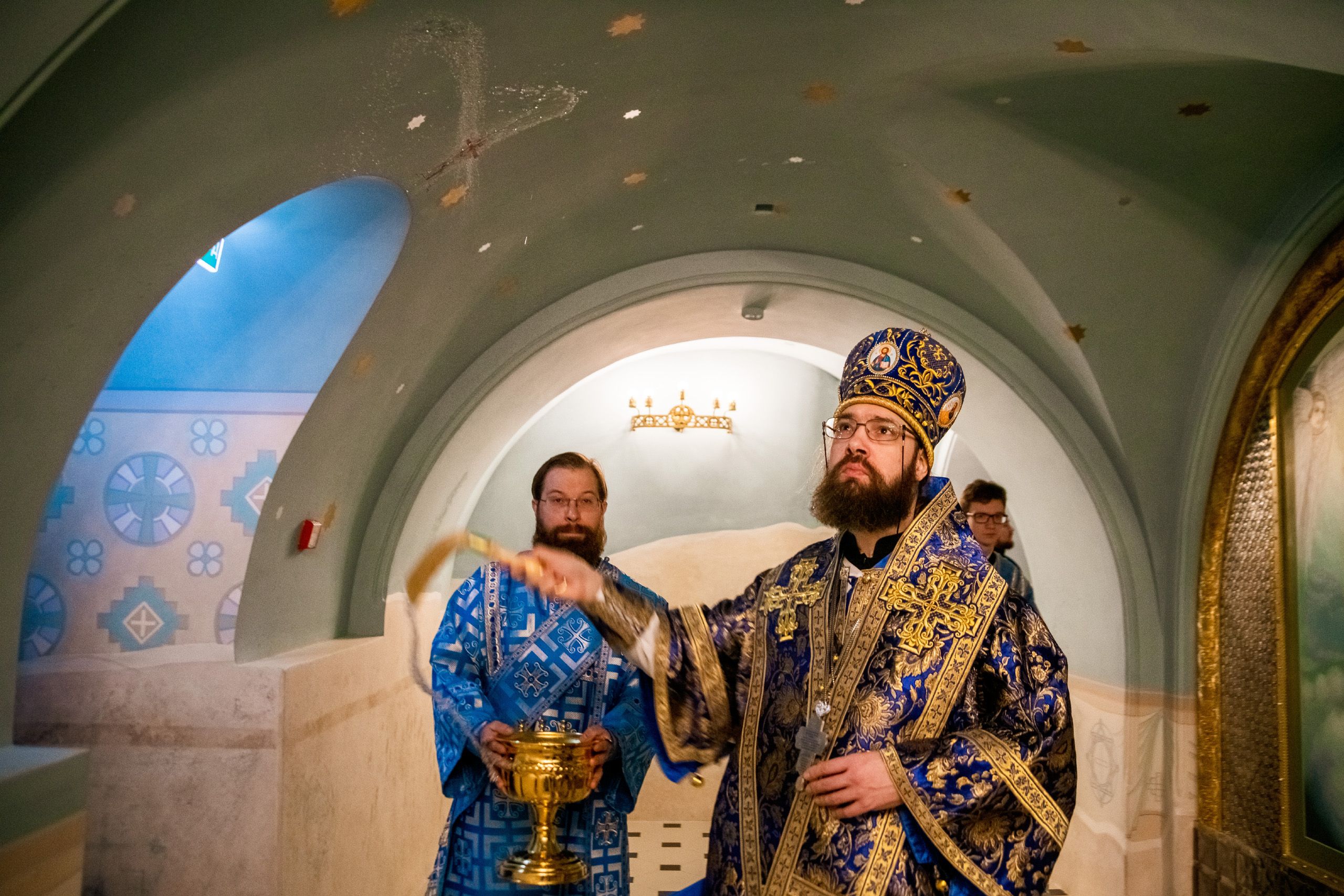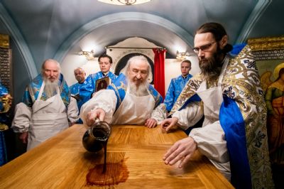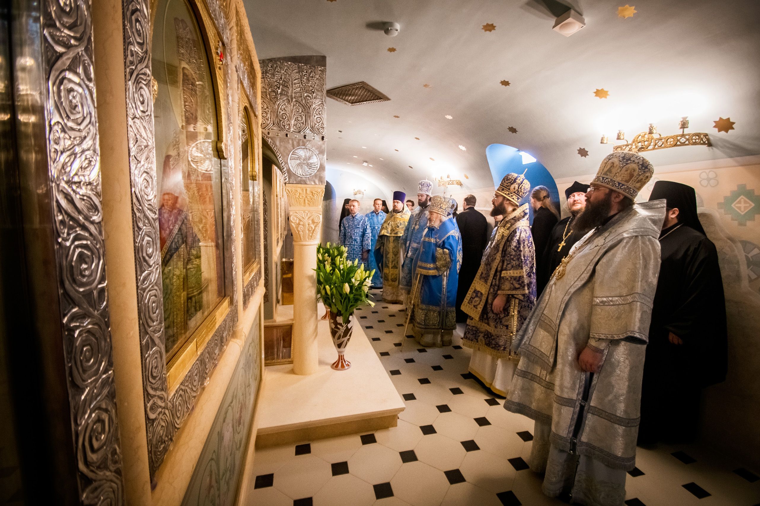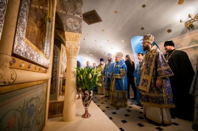 Затем архипастыри совершили первую Божественную литургию в новоосвященном храме Рождества Пресвятой Богородицы. После прочтения заамвонной молитвы было совершено славление перед ковчегом с мощами преподобномученицы великой княгини Елисаветы Феодоровны и инокини Варвары.