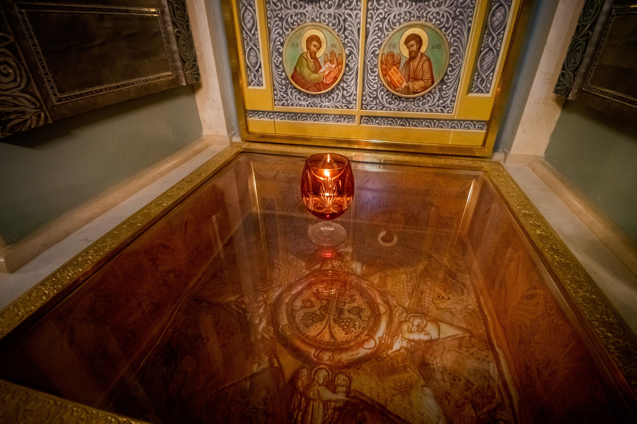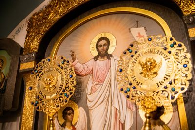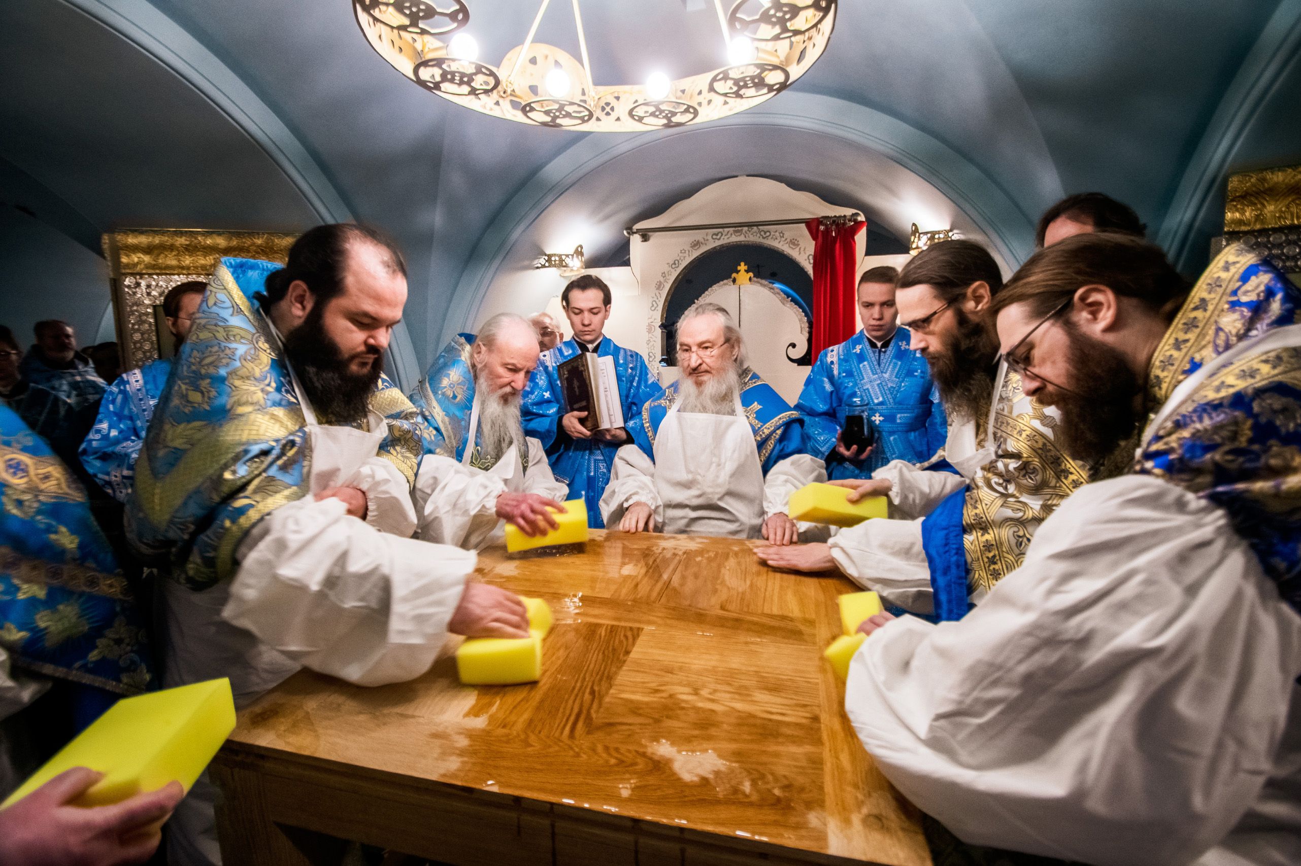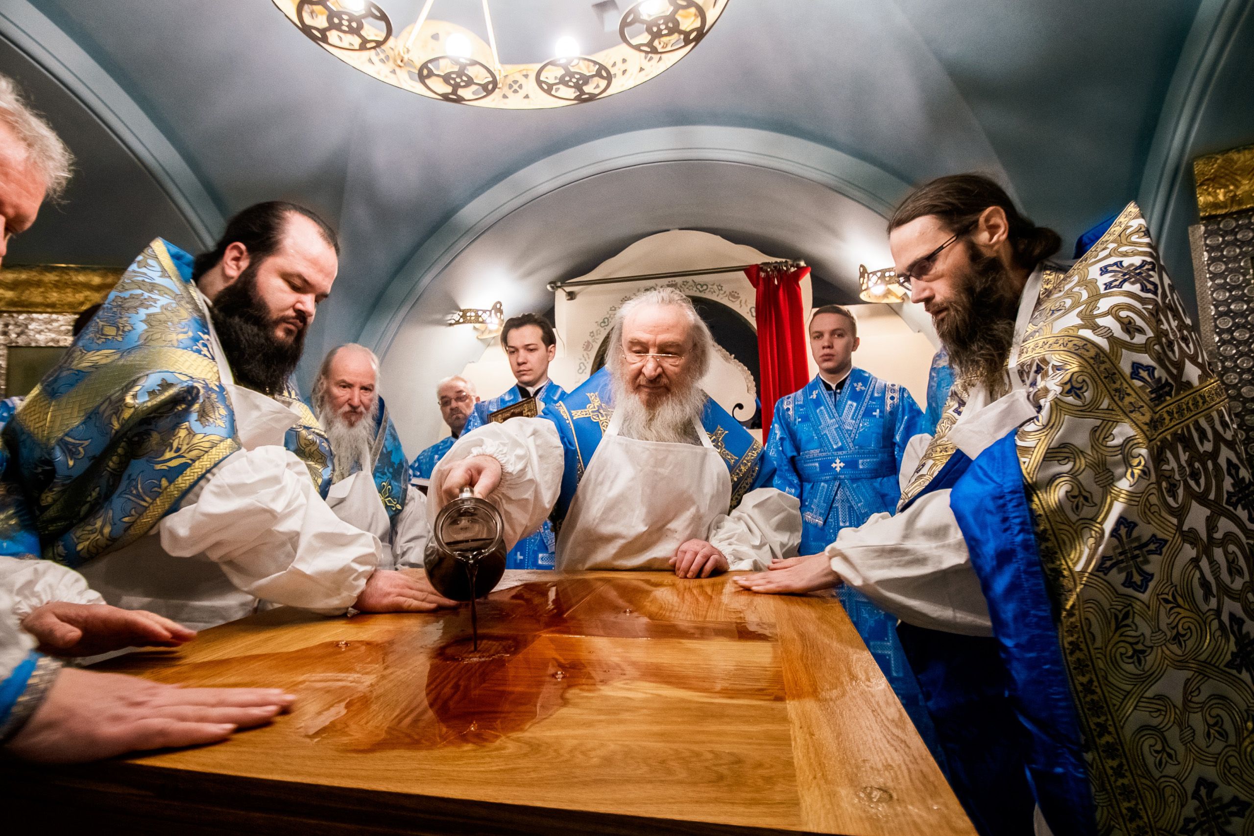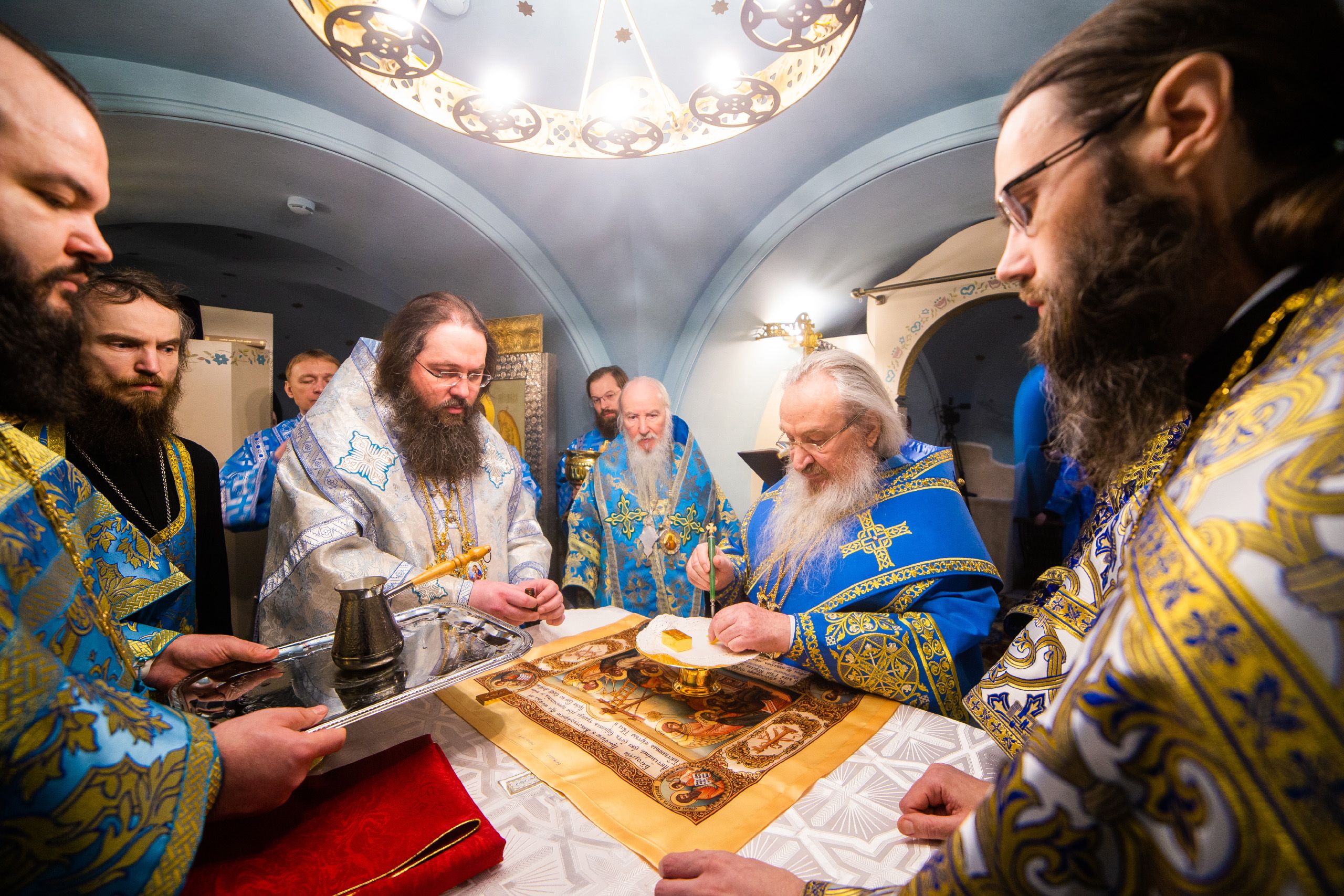Затем архипастыри совершили первую Божественную литургию в новоосвященном храме Рождества Пресвятой Богородицы. После прочтения заамвонной молитвы было совершено славление перед ковчегом с мощами преподобномученицы великой княгини Елисаветы Феодоровны и инокини Варвары.