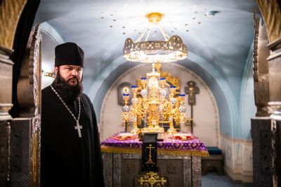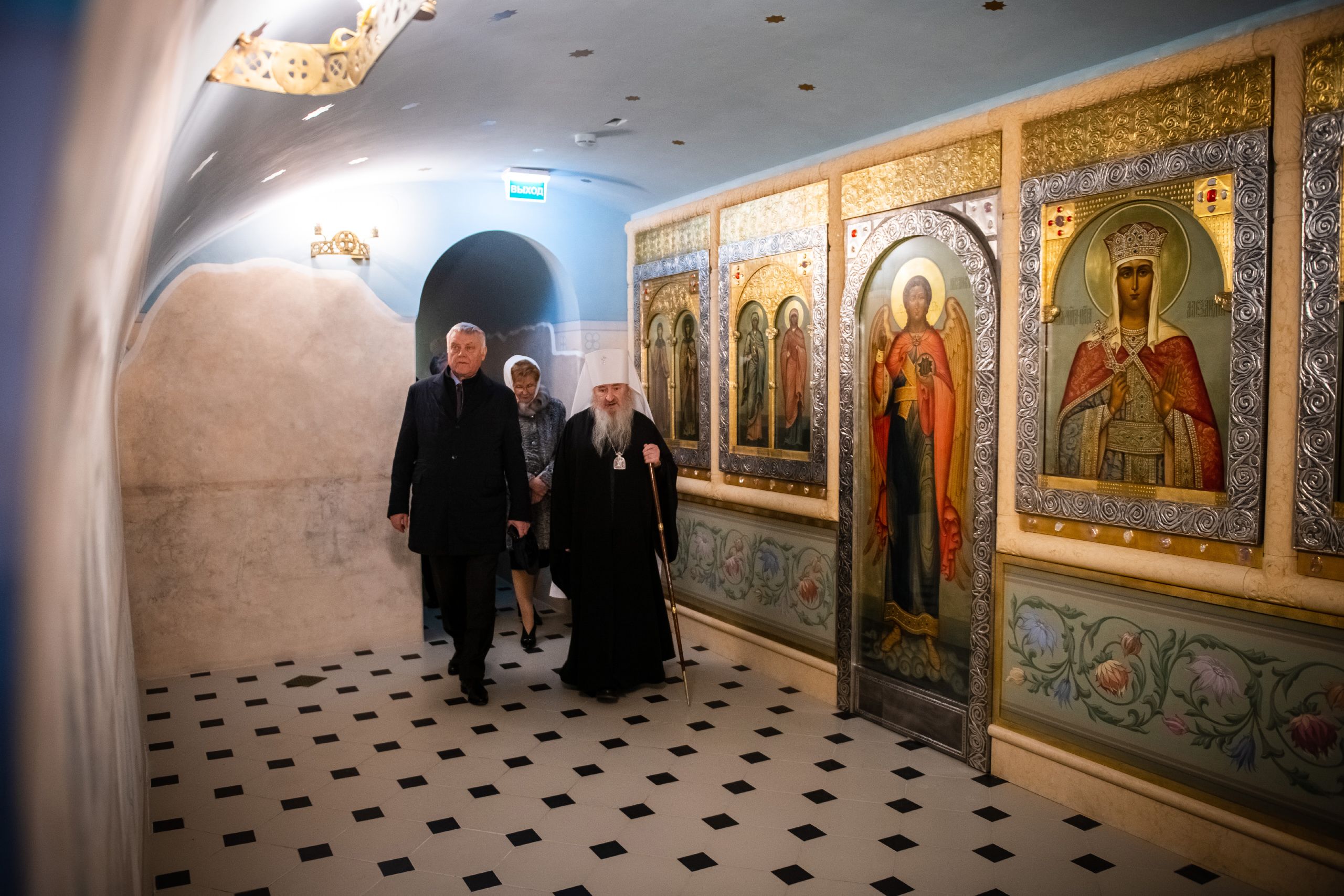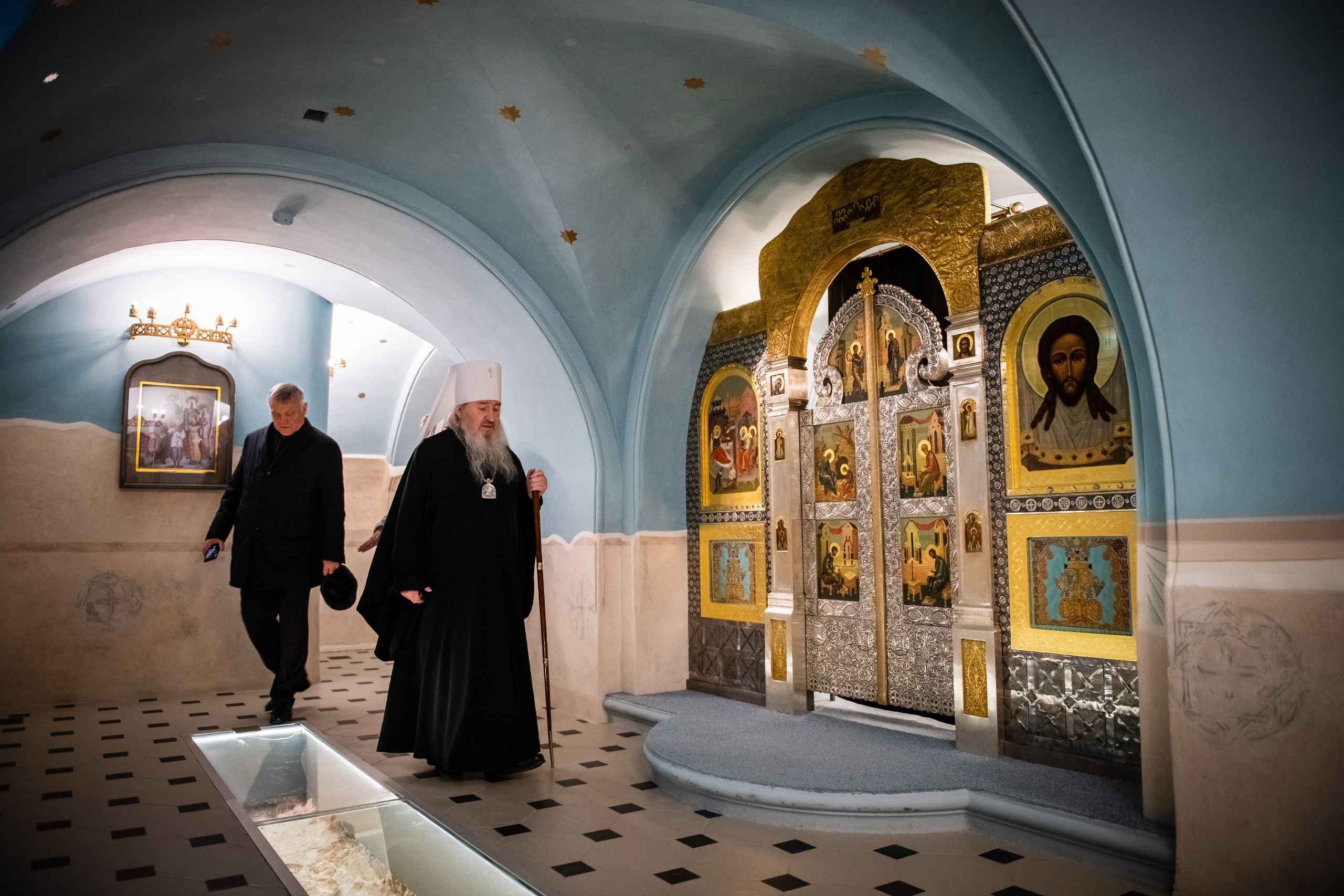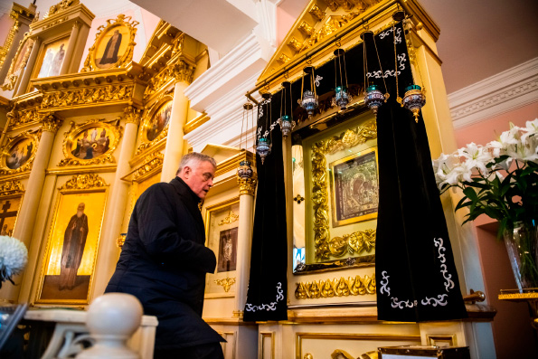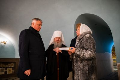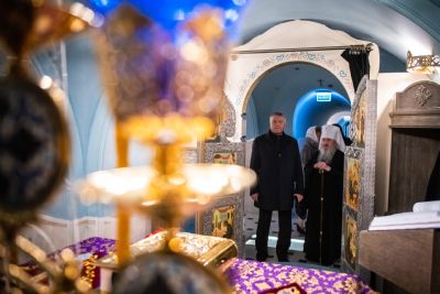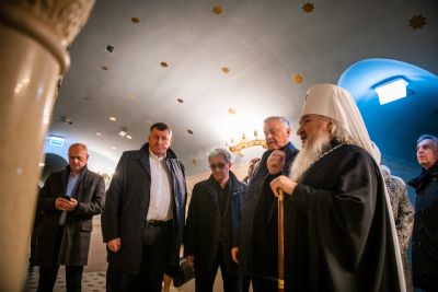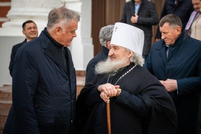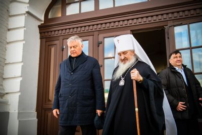 В сопровождении митрополита Феофана Владимир Якунин поднялся в Крестовоздвиженский храм, где приложился к древнему списку Казанской иконы Божией Матери.