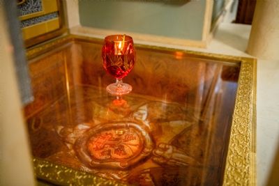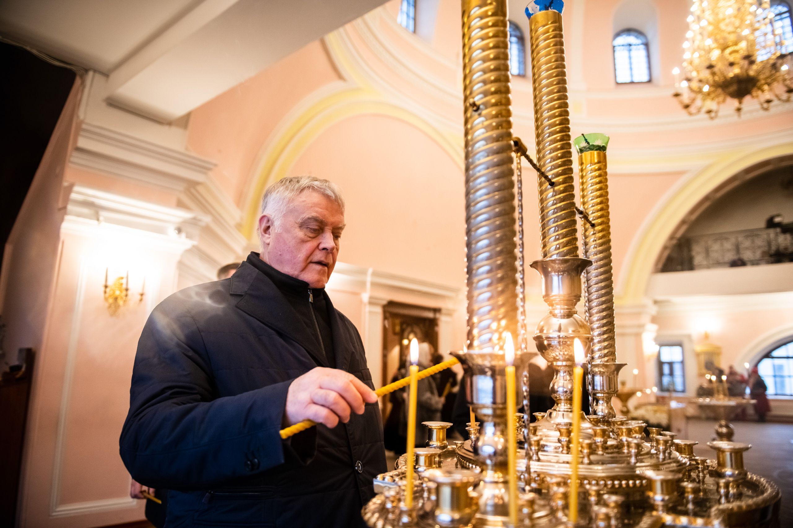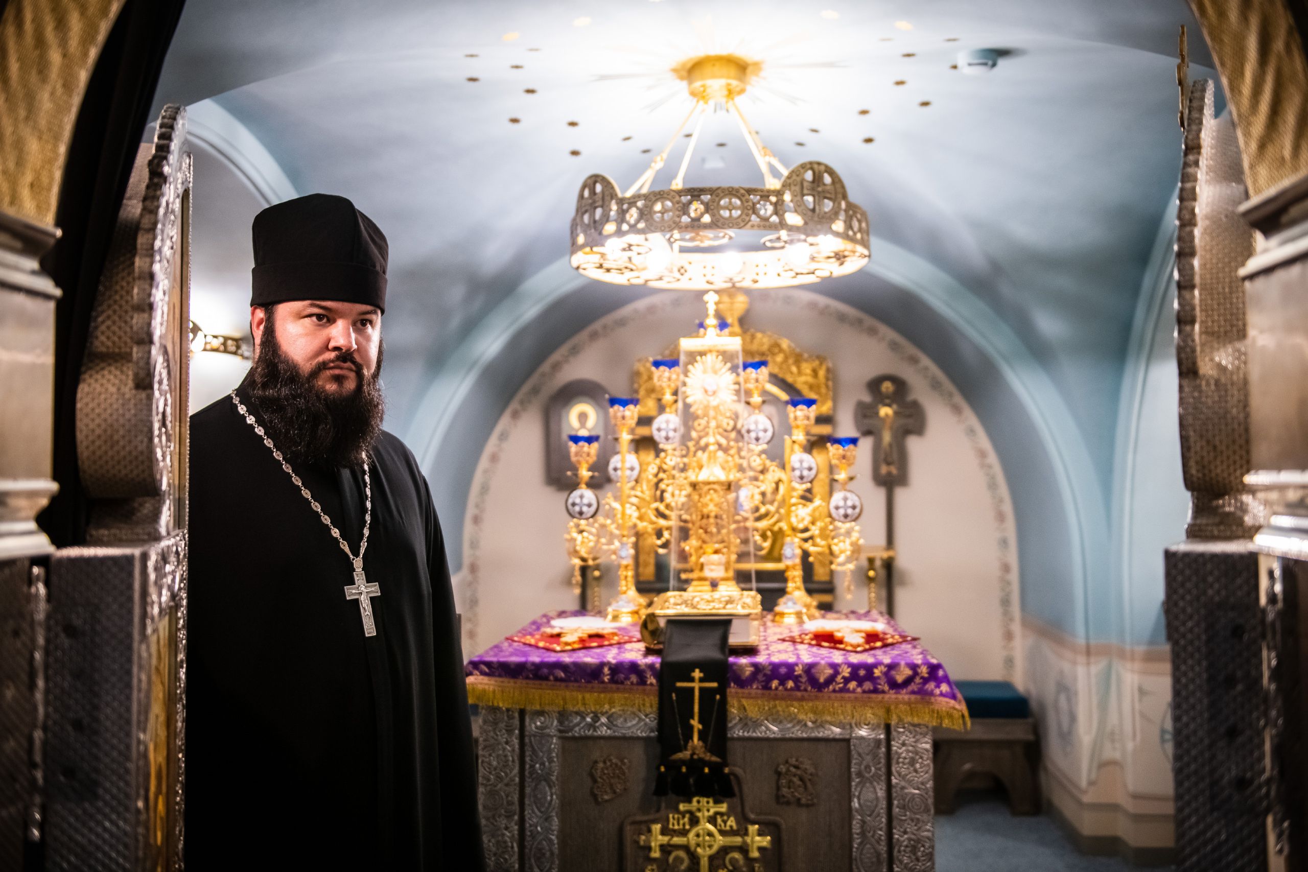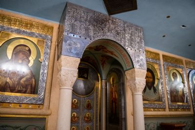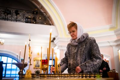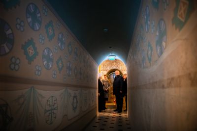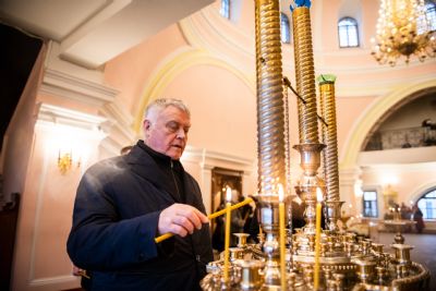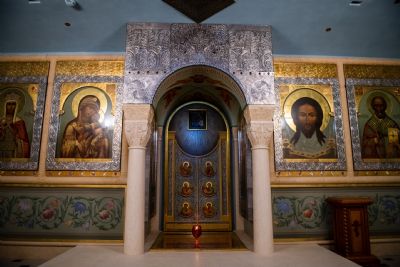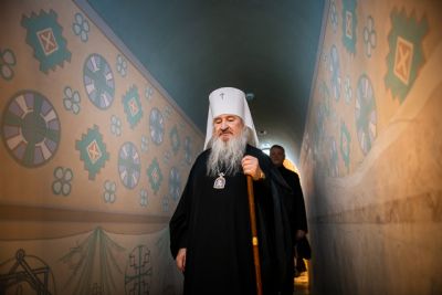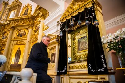 В сопровождении митрополита Феофана Владимир Якунин поднялся в Крестовоздвиженский храм, где приложился к древнему списку Казанской иконы Божией Матери.