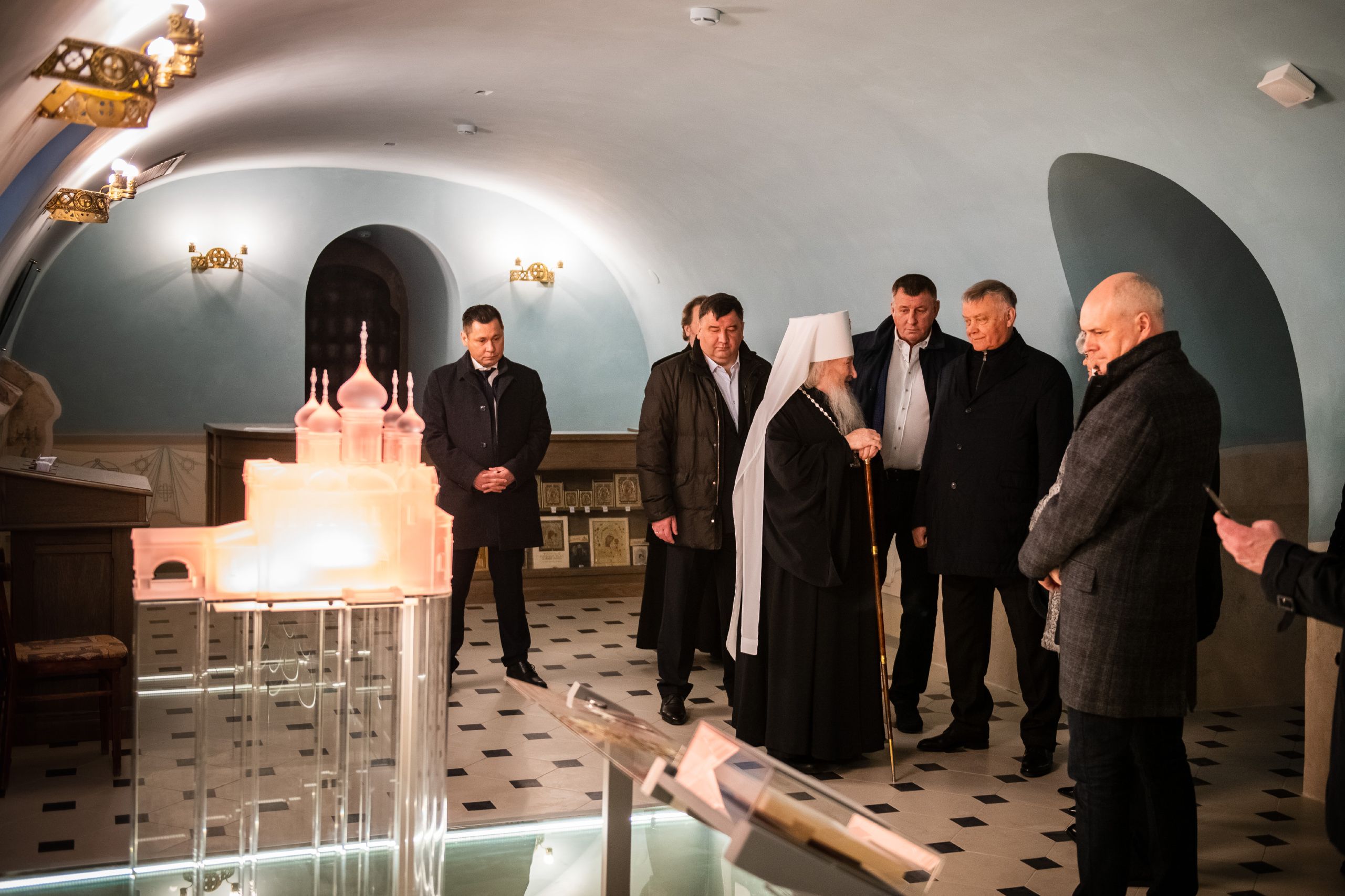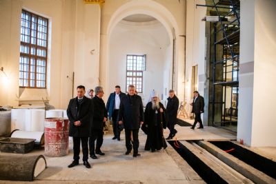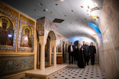 Гости посетили строительную площадку возрождаемого собора и пещерный храм Рождества Богородицы, освященный в конце февраля текущего года, осмотрели фрагменты исторического фундамента и место обретения Казанской иконы Божией Матери. Владыка Феофан отметил, что возрождение исторического собора, разрушенного в 30-е годы XX столетия, являет собой яркий пример сотрудничества государства, общества и Церкви в деле духовного возрождения страны. Проект реализован по указу и при деятельной помощи Президента РТ Рустама Минниханова, под непосредственным руководством Государственного советника РТ Минтимера Шаймиева.