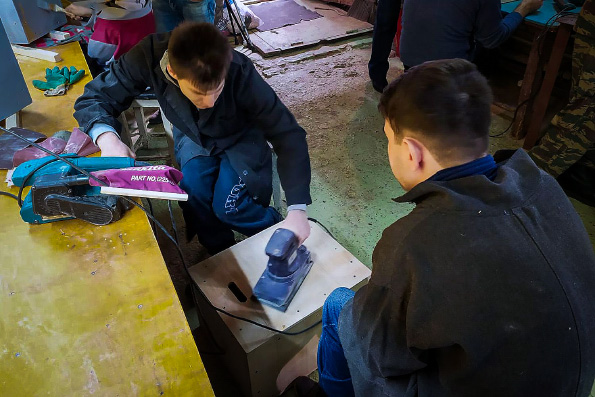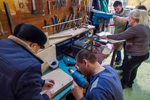 На занятии, прошедшем в столярной мастерской, ребята под руководством Алексея Бражкина и родителей своими руками изготовили ящики, на которых можно сидеть в перерывах между упражнениями. Молодые люди, используя профессиональный столярный инструмент, соединяли доски, шлифовали и красили свои изделия.