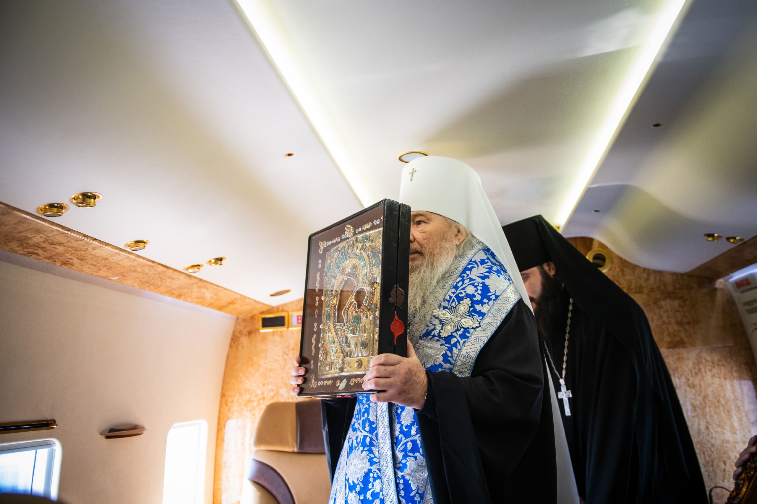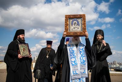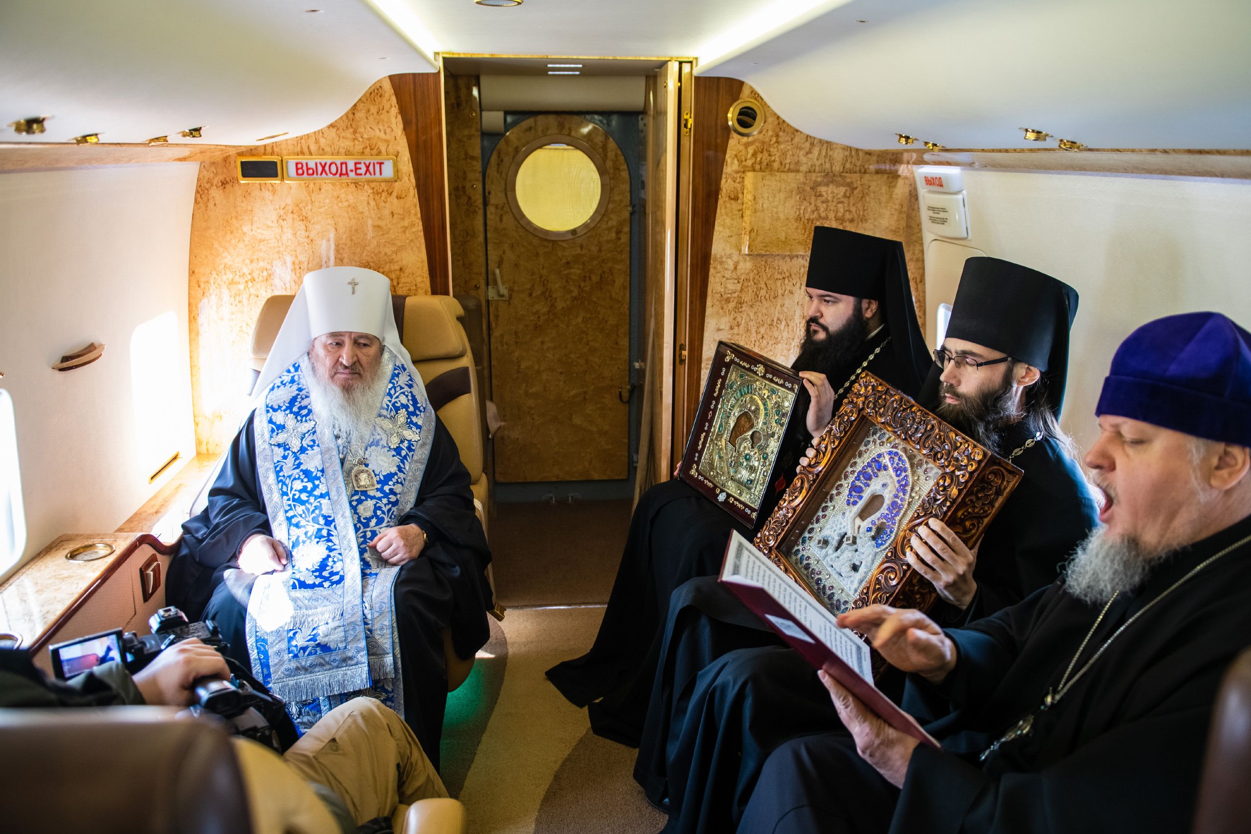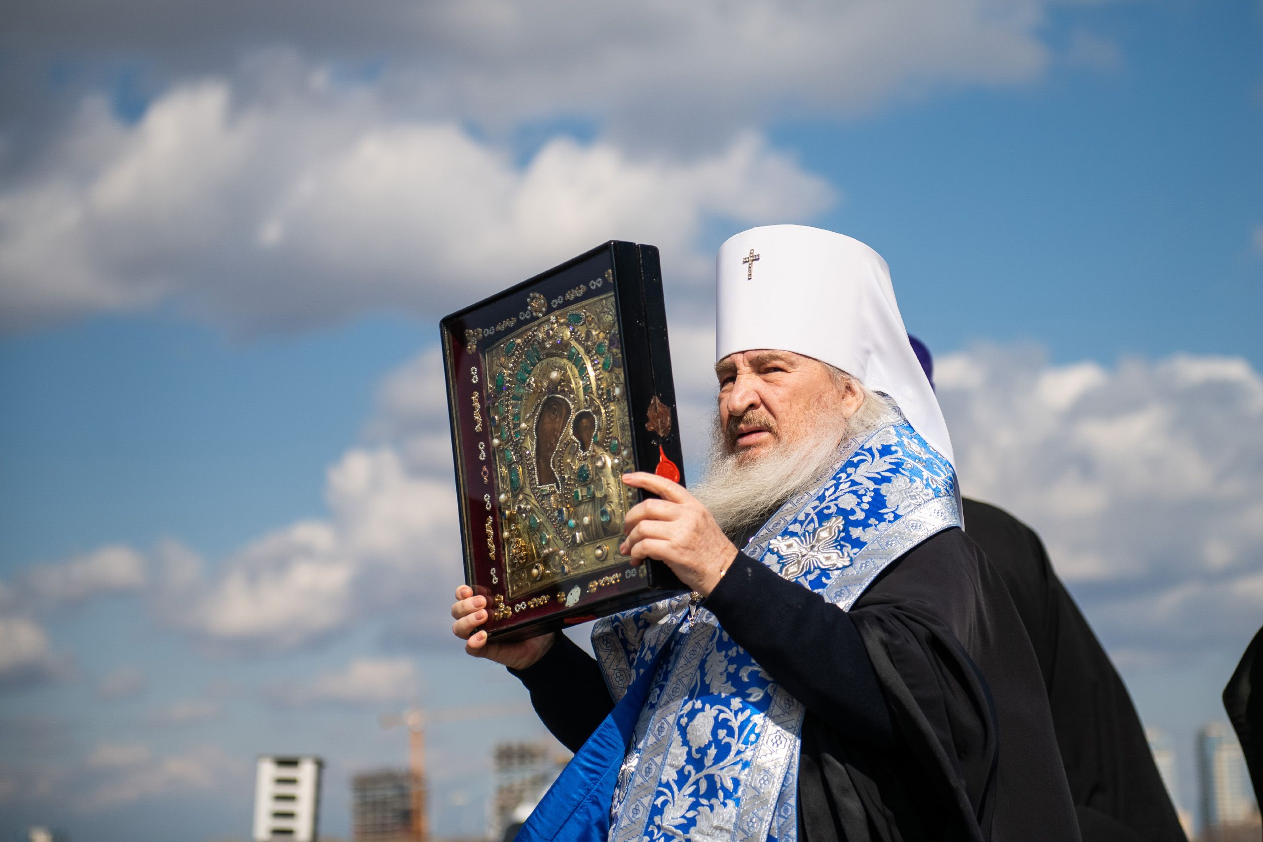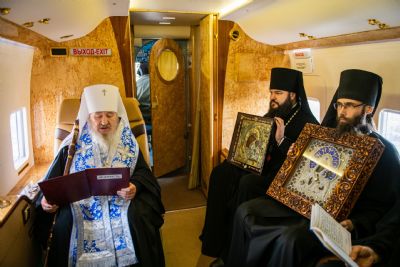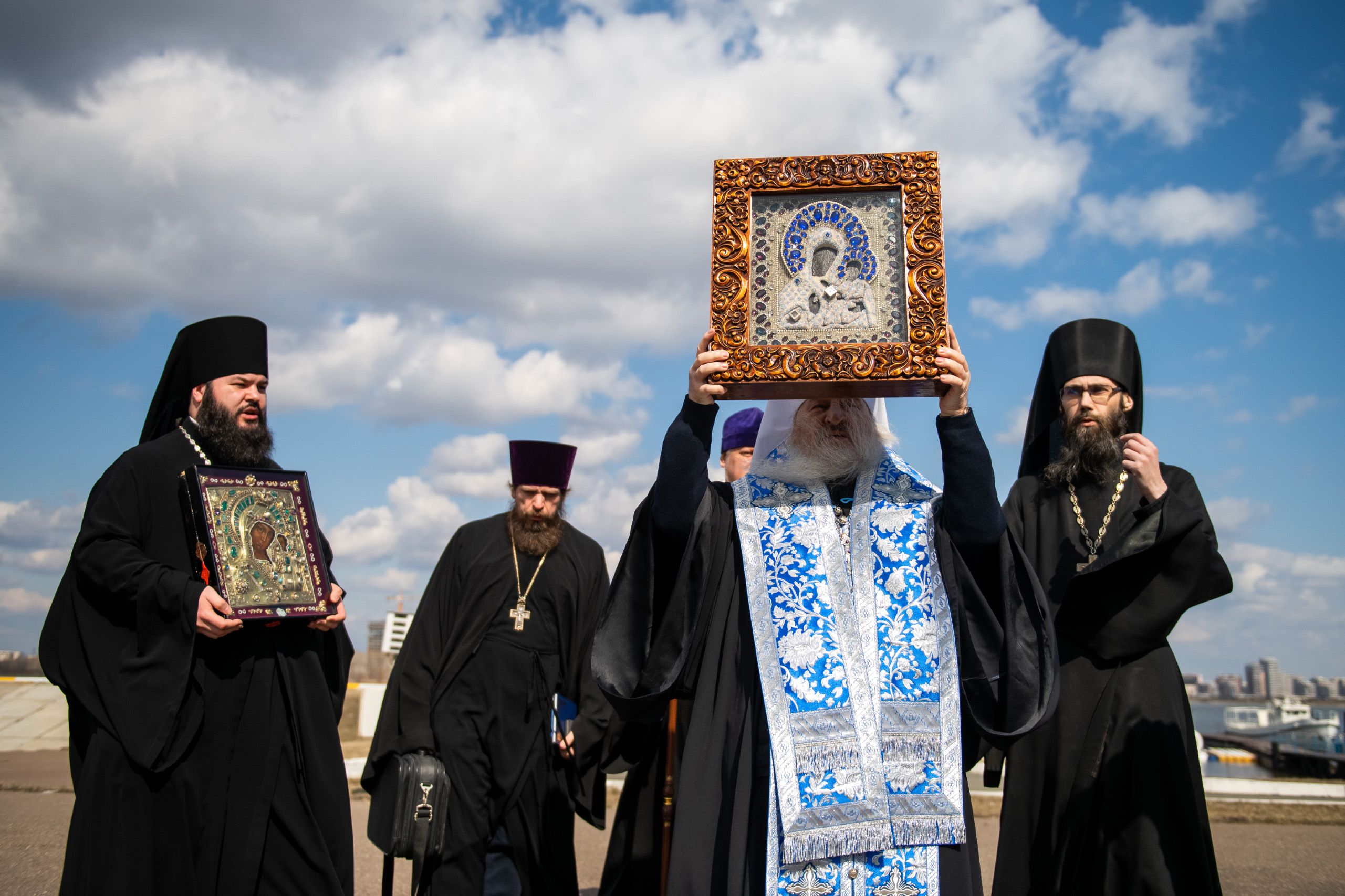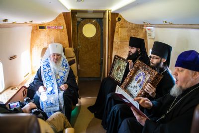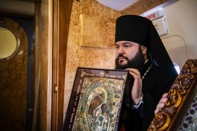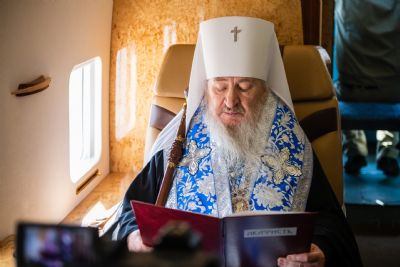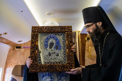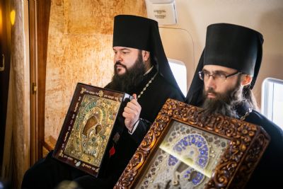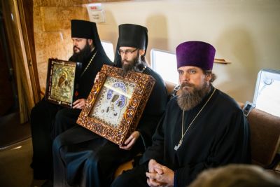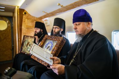 В воздухе святыни сопровождали секретарь Казанского епархиального управления протоиерей Владимир Самойленко, наместник Казанско-Богородицкого мужского монастыря игумен Марк (Виленский), благочинный I Казанского округа протоиерей Алексий Чубаков, наместник Введенского Кизического мужского монастыря игумен Пимен (Ивентьев).