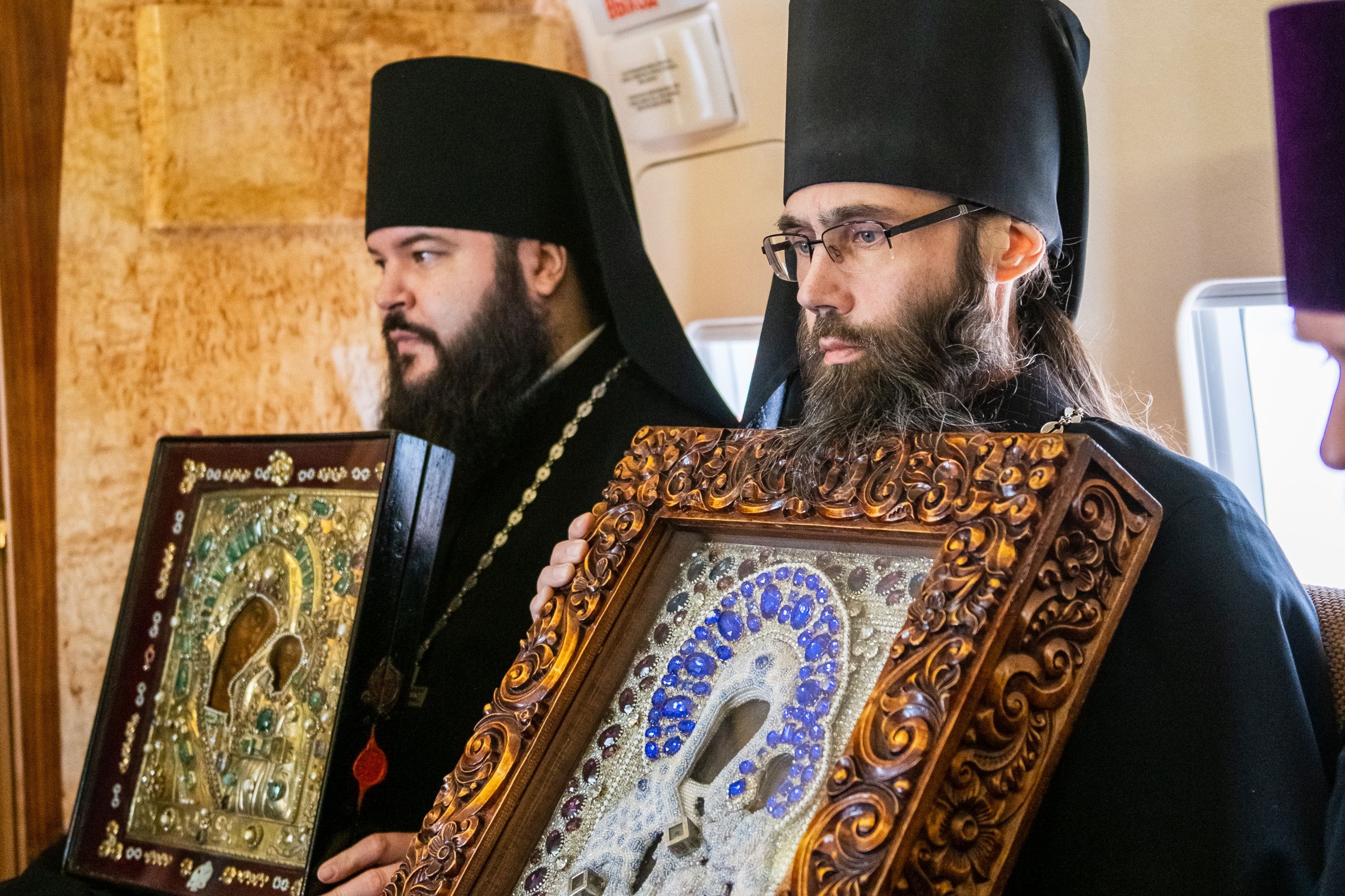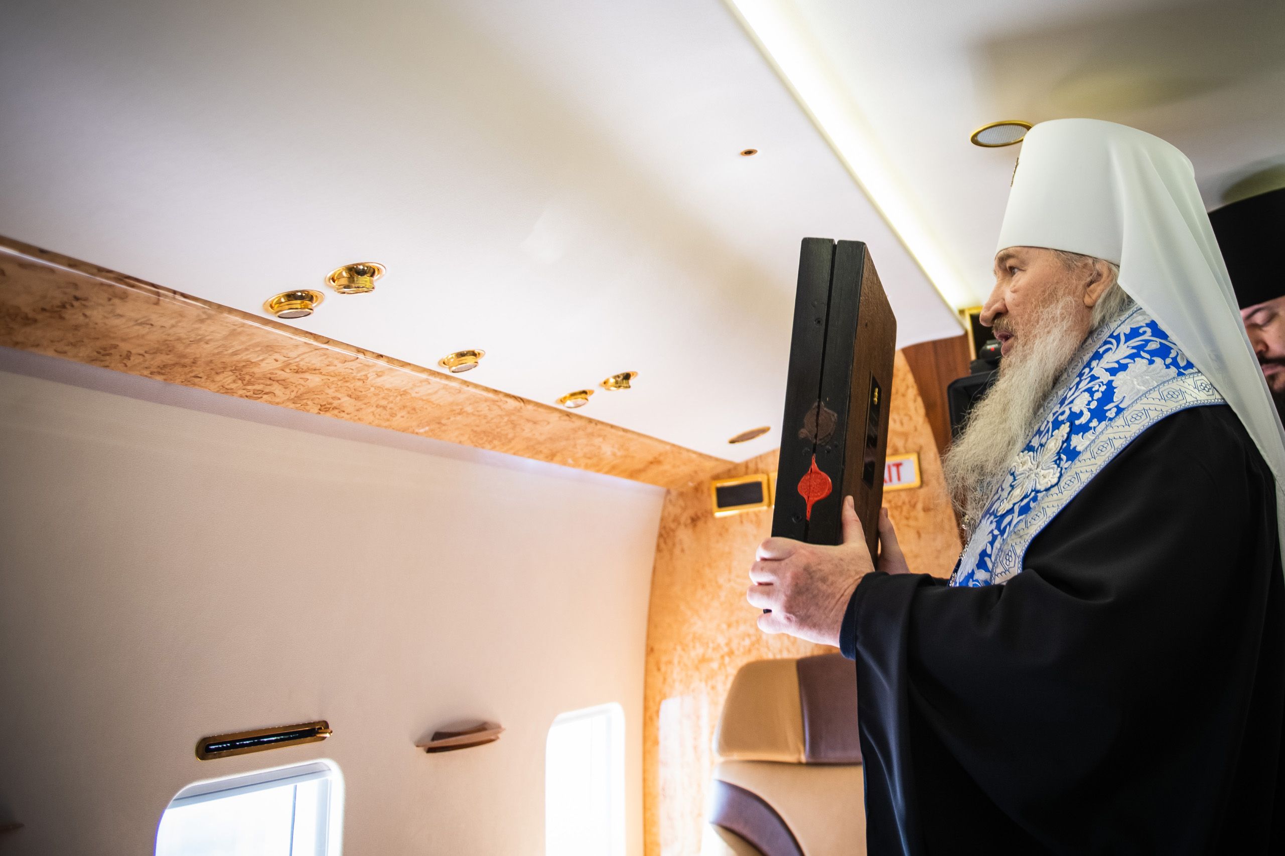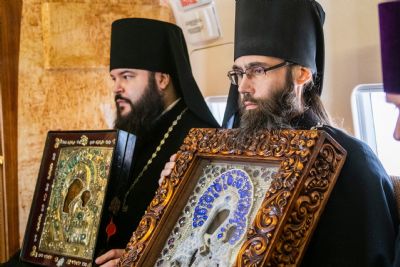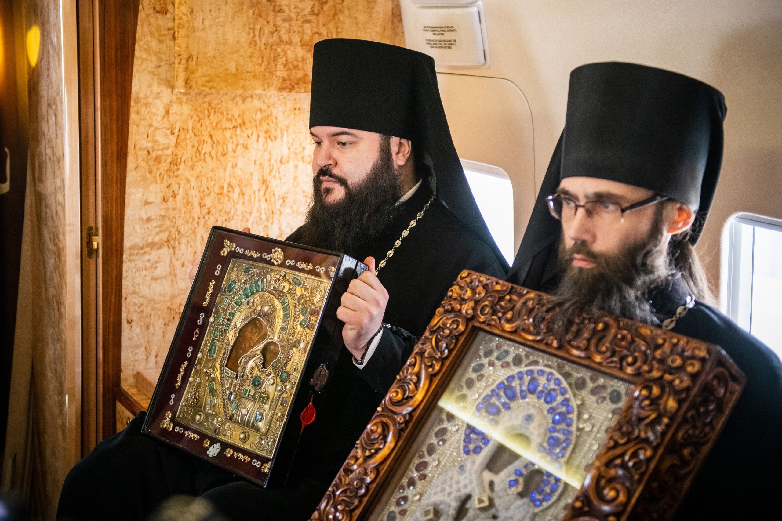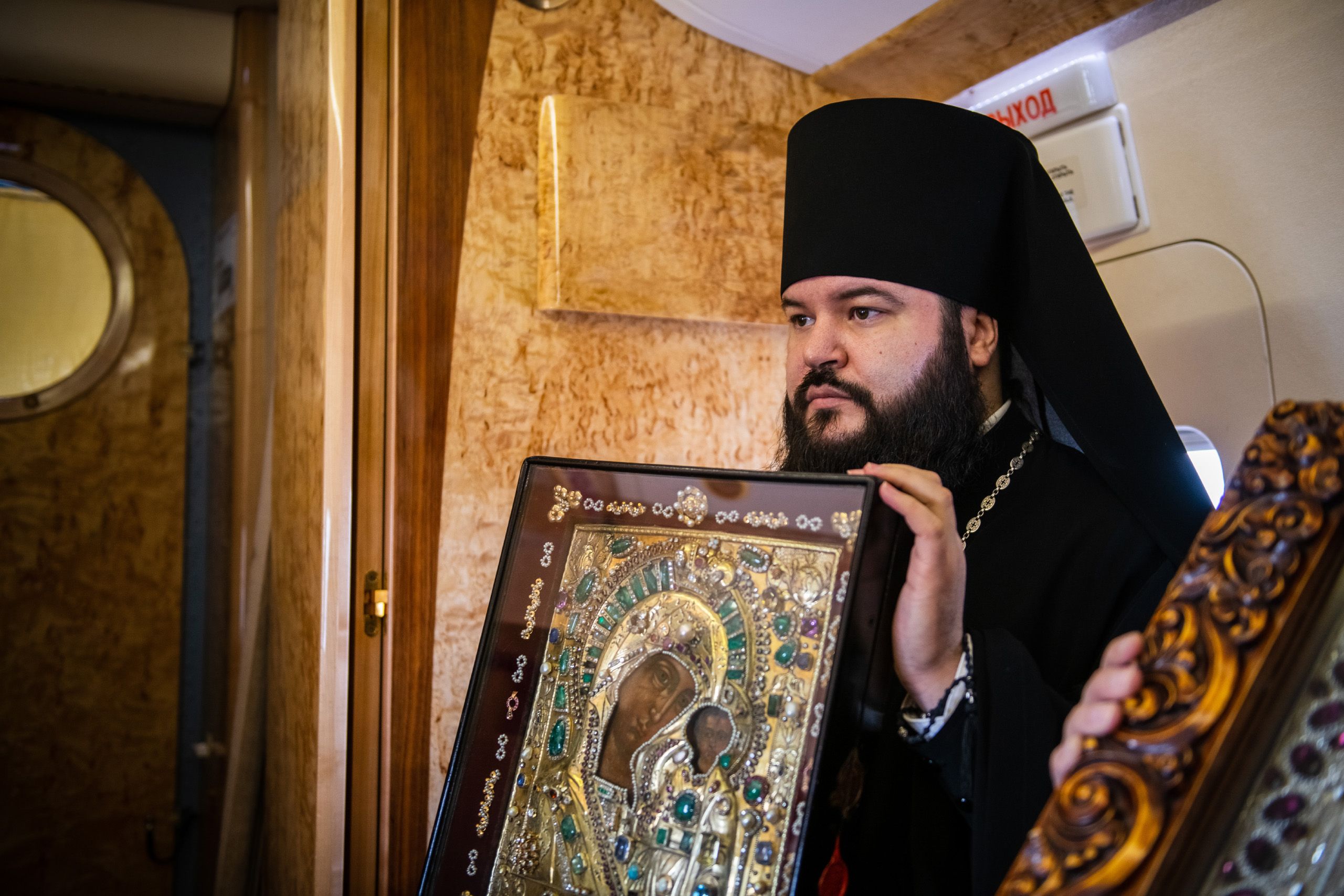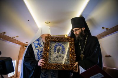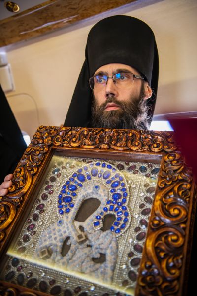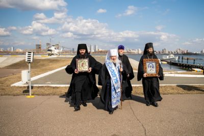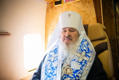 В воздухе святыни сопровождали секретарь Казанского епархиального управления протоиерей Владимир Самойленко, наместник Казанско-Богородицкого мужского монастыря игумен Марк (Виленский), благочинный I Казанского округа протоиерей Алексий Чубаков, наместник Введенского Кизического мужского монастыря игумен Пимен (Ивентьев).