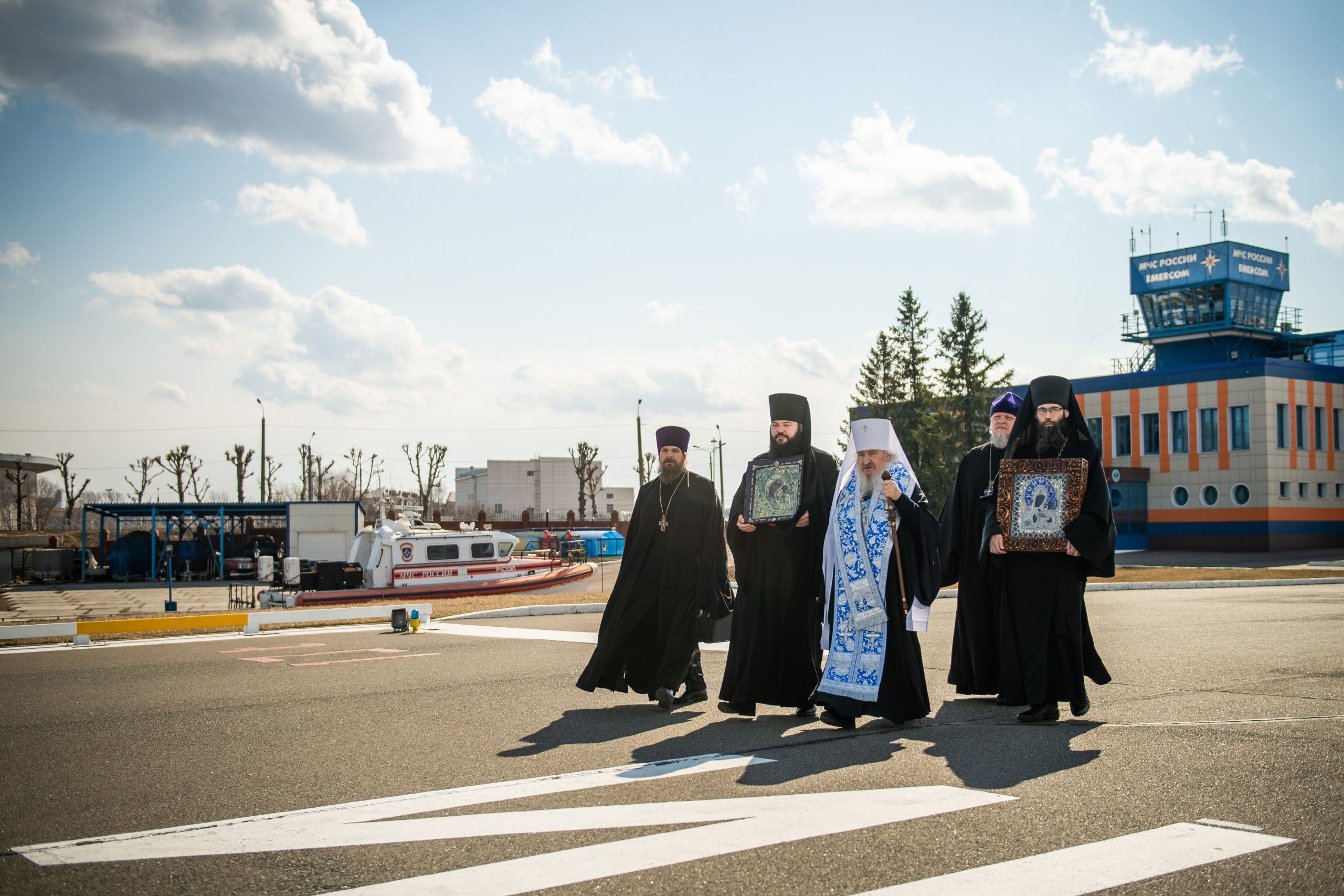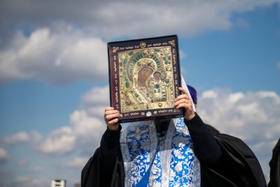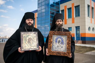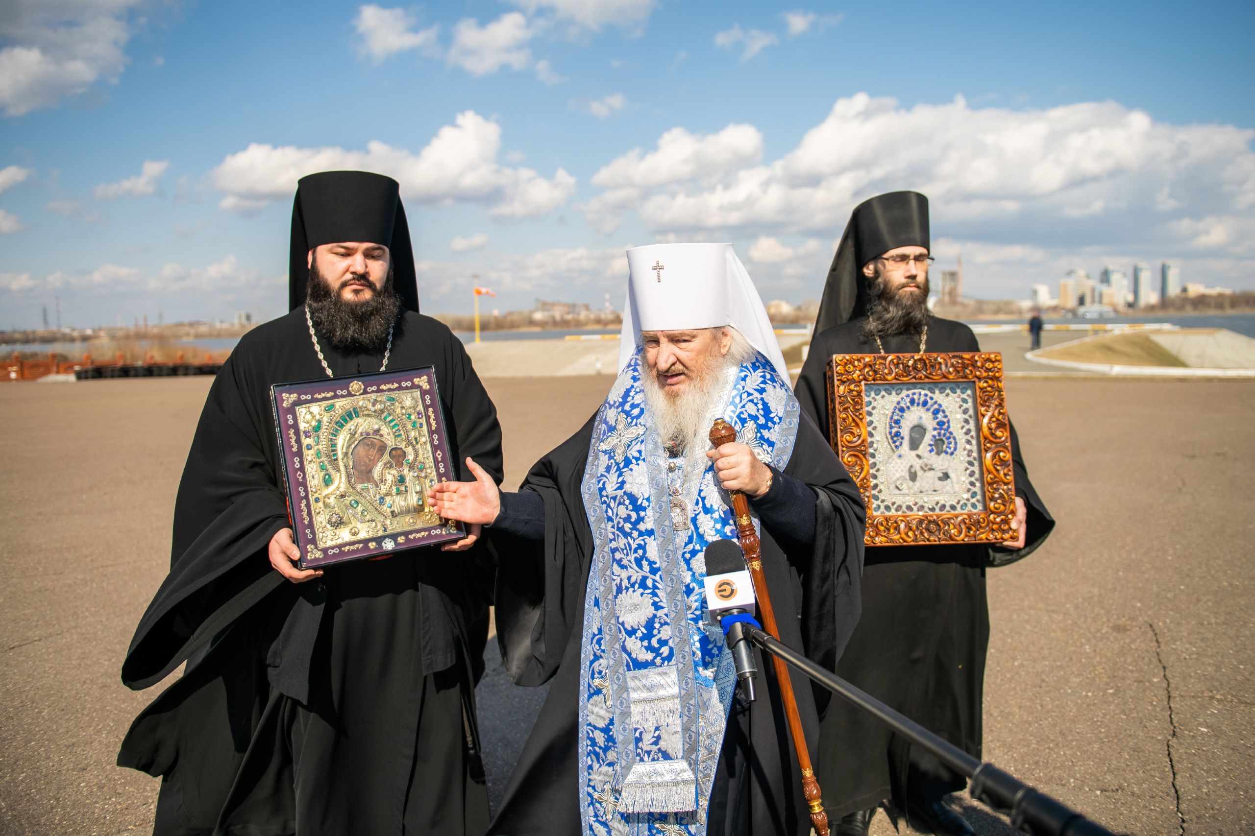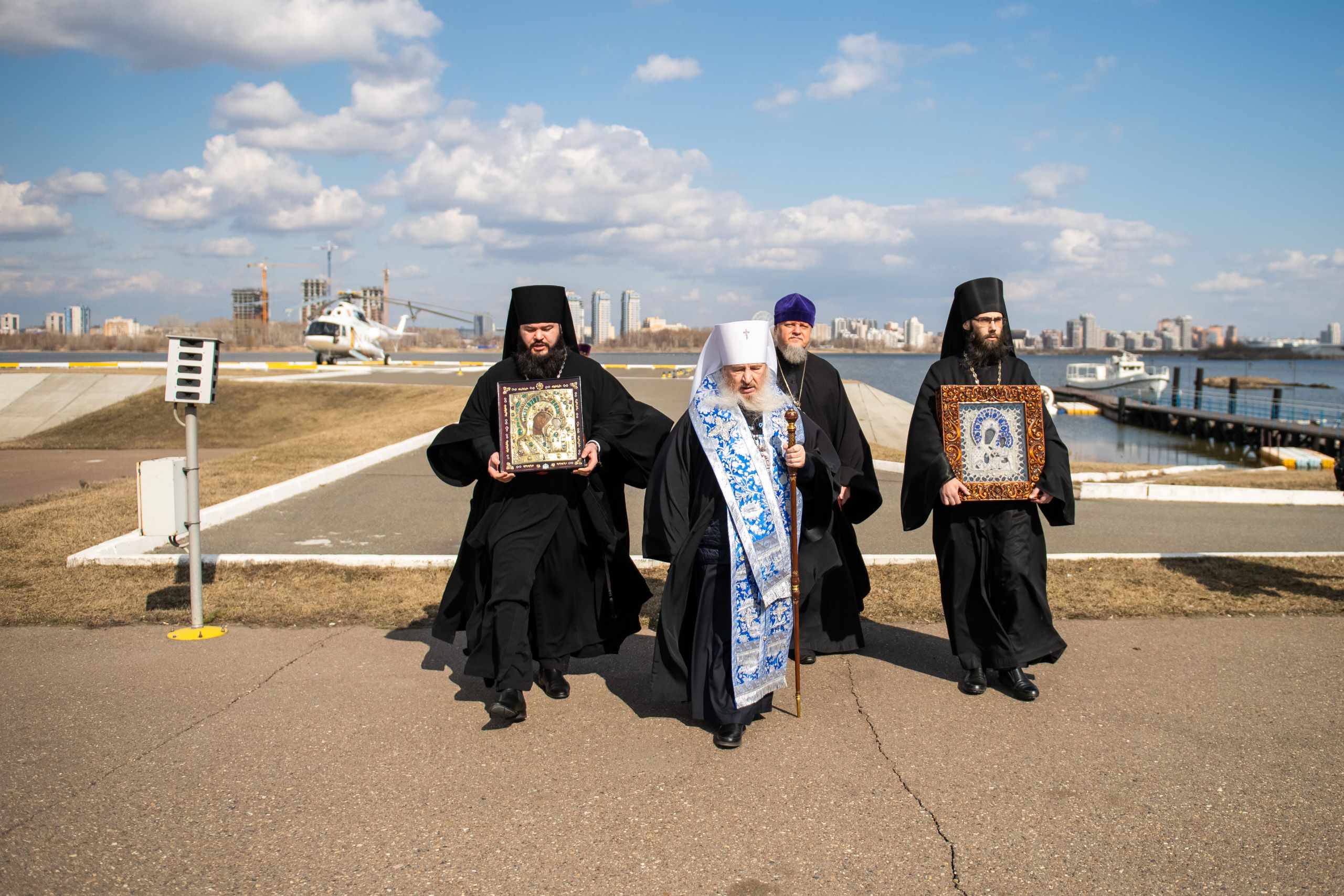 Святые образа были доставлены на вертолётную площадку из Казанско-Богородицкого мужского монастыря и Петропавловского собора Казани.