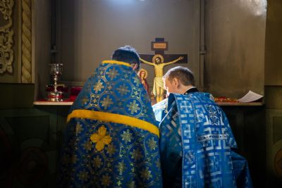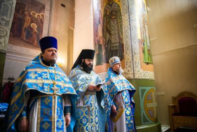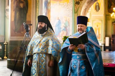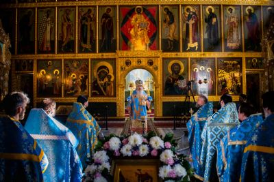 После чтения заамвонной молитвы перед праздничной иконой на середине храма духовенство пропело тропарь и кондак Божией Матери.