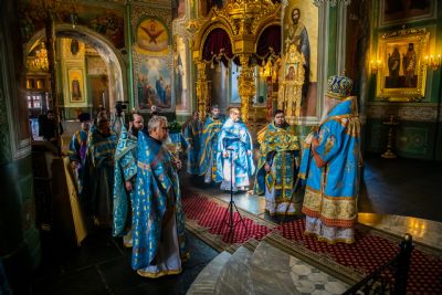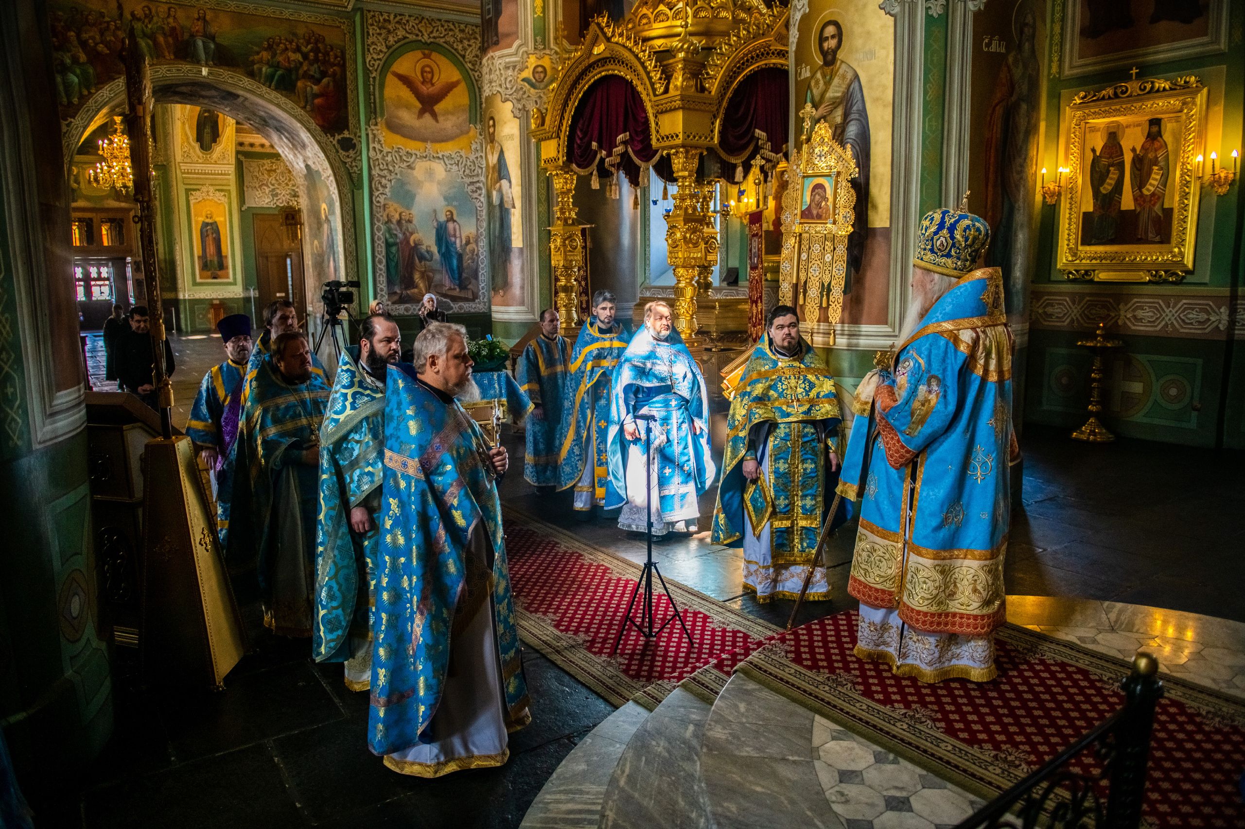 За праздничной Литургией Его Высокопреосвященству сослужили секретарь Казанского епархиального управления протоиерей Владимир Самойленко, первый проректор Казанской духовной семинарии протоиерей Алексий Колчерин, наместник Казанско-Богородицкого мужского монастыря игумен Марк (Виленский), настоятель Введенского Кизического мужского монастыря игумен Пимен (Ивентьев), настоятель Богоявленского собора города Казани протоиерей Алексий Державин, настоятель Успенского храма города Казани протоиерей Алексий Краевский, наместник Благовещенского собора иерей Константин Колыганов.