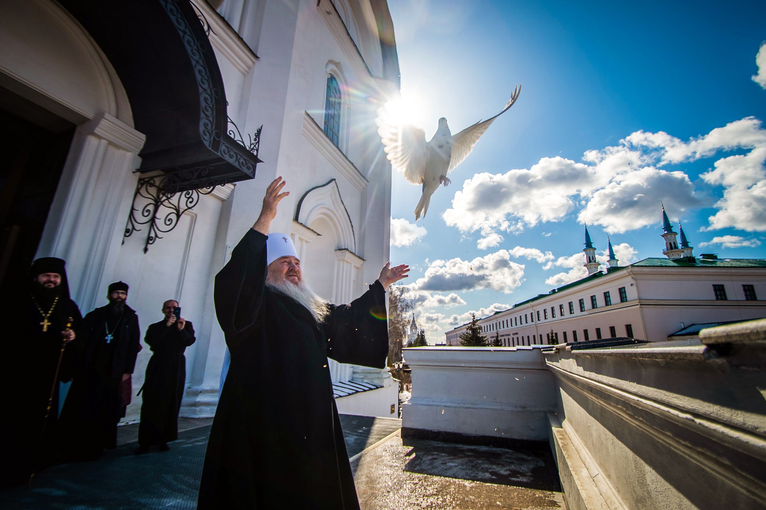 После богослужения на пороге Благовещенского собора по традиции архипастырь и духовенство отпустили в небо белых голубей.