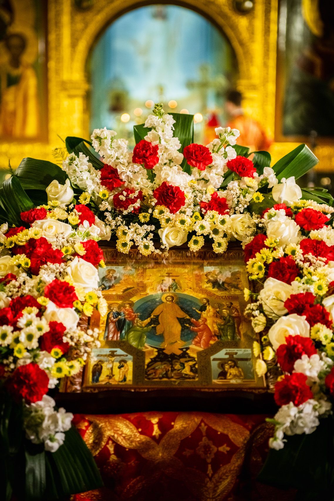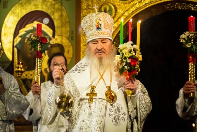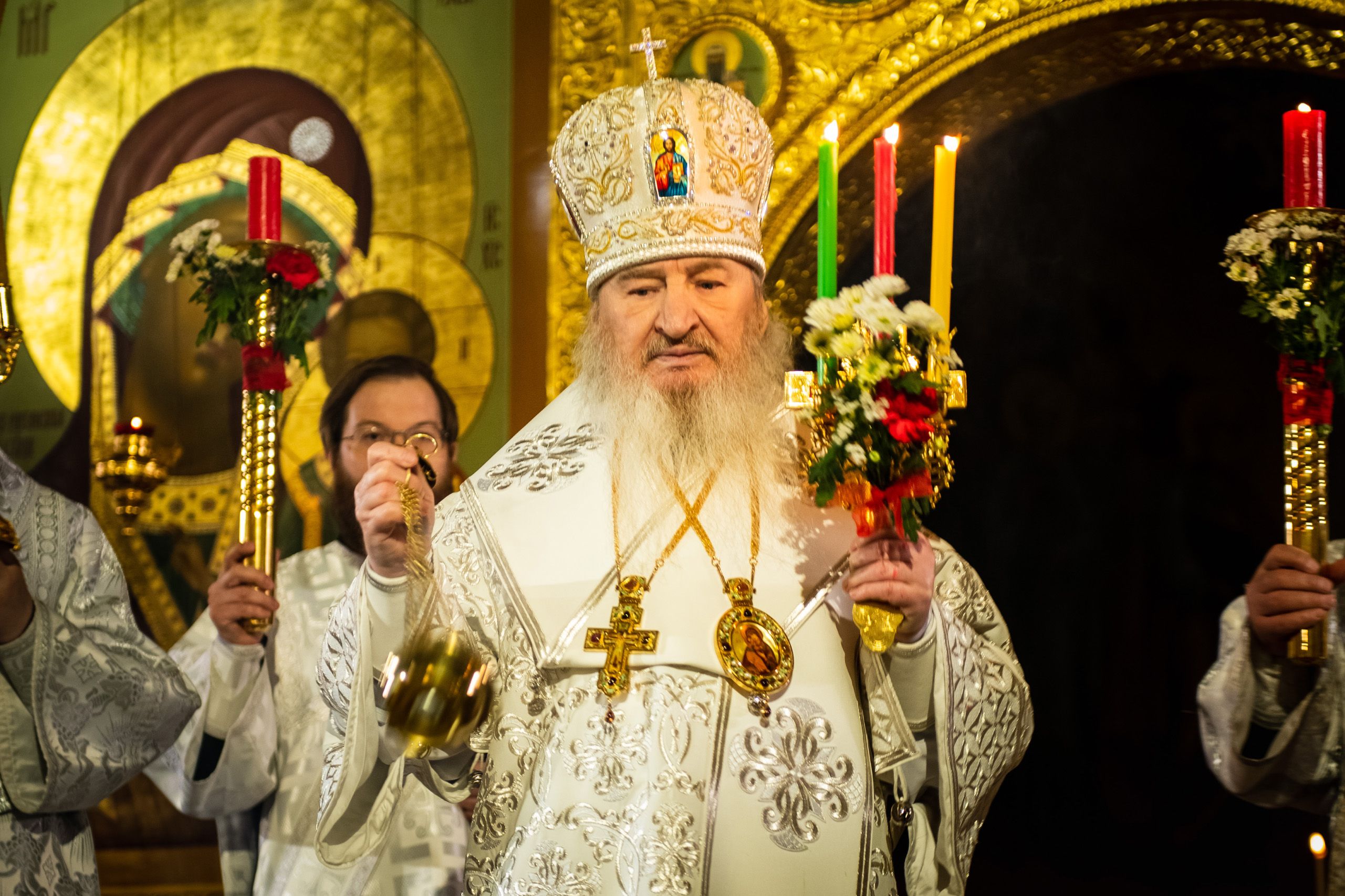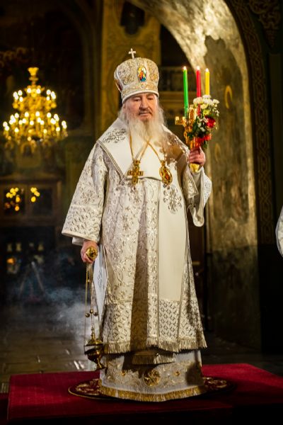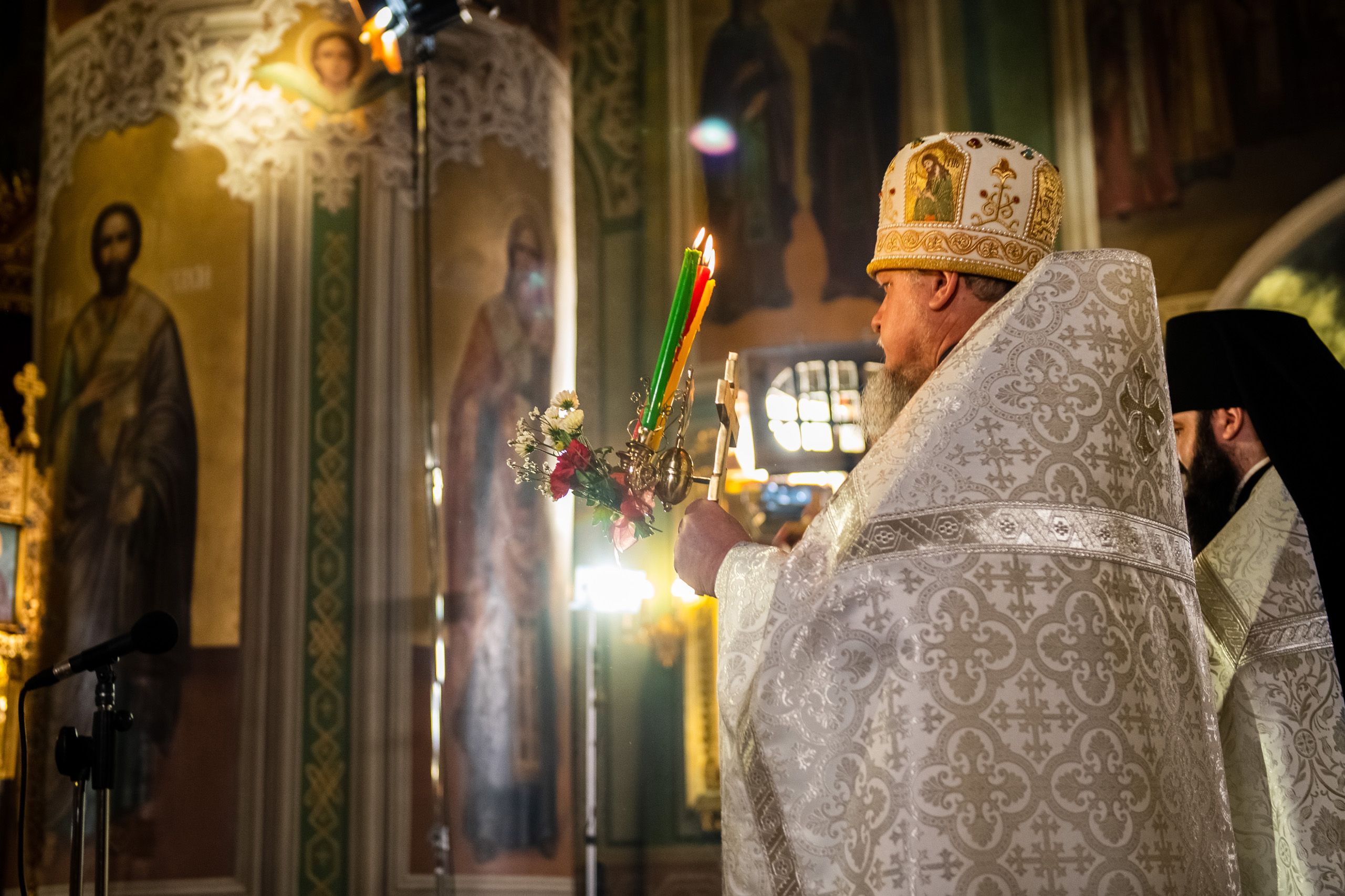 По заамвонной молитве глава Татарстанской митрополии совершил освящение артоса. Затем Его Высокопреосвященство обратился к сослужившим клирикам и православным верующим зрителям со словом: