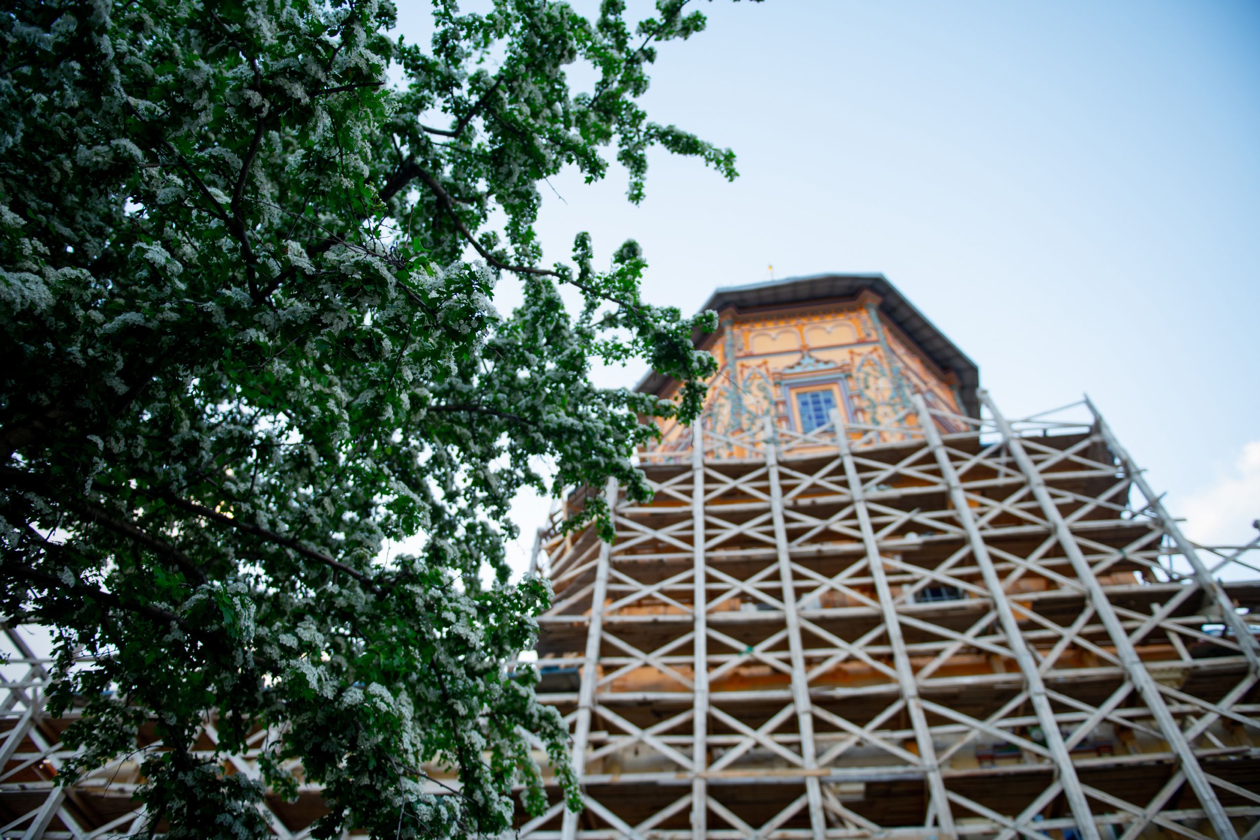 Перед началом богослужения правящий архиерей в сопровождении настоятеля протоиерея Сергия Титова и главного инженера Казанской епархии Михаила Федотова ознакомился с текущими реставрационными работами в соборе.